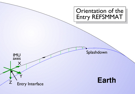 By aligning the guidance platform per this Entry REFSMMAT, the FDAI displays will show the spacecraft's attitude relative to an orientation that relates to Entry Interface. This has the IMU X-axis pointed along the direction of travel but parallel to the horizontal at Entry Interface. The Z-axis points down the local vertical and the Y-axis points right to complete the right-hand coordinate system.