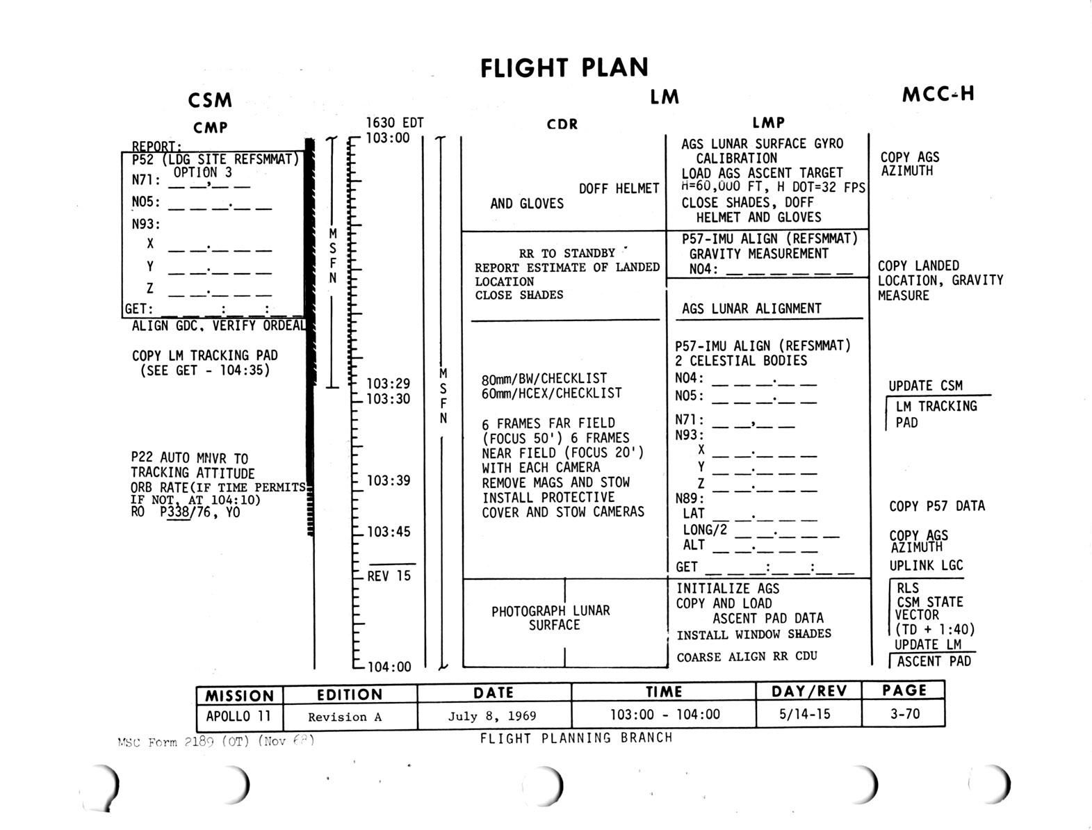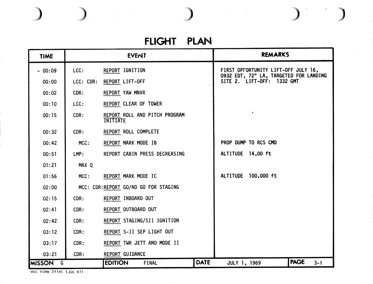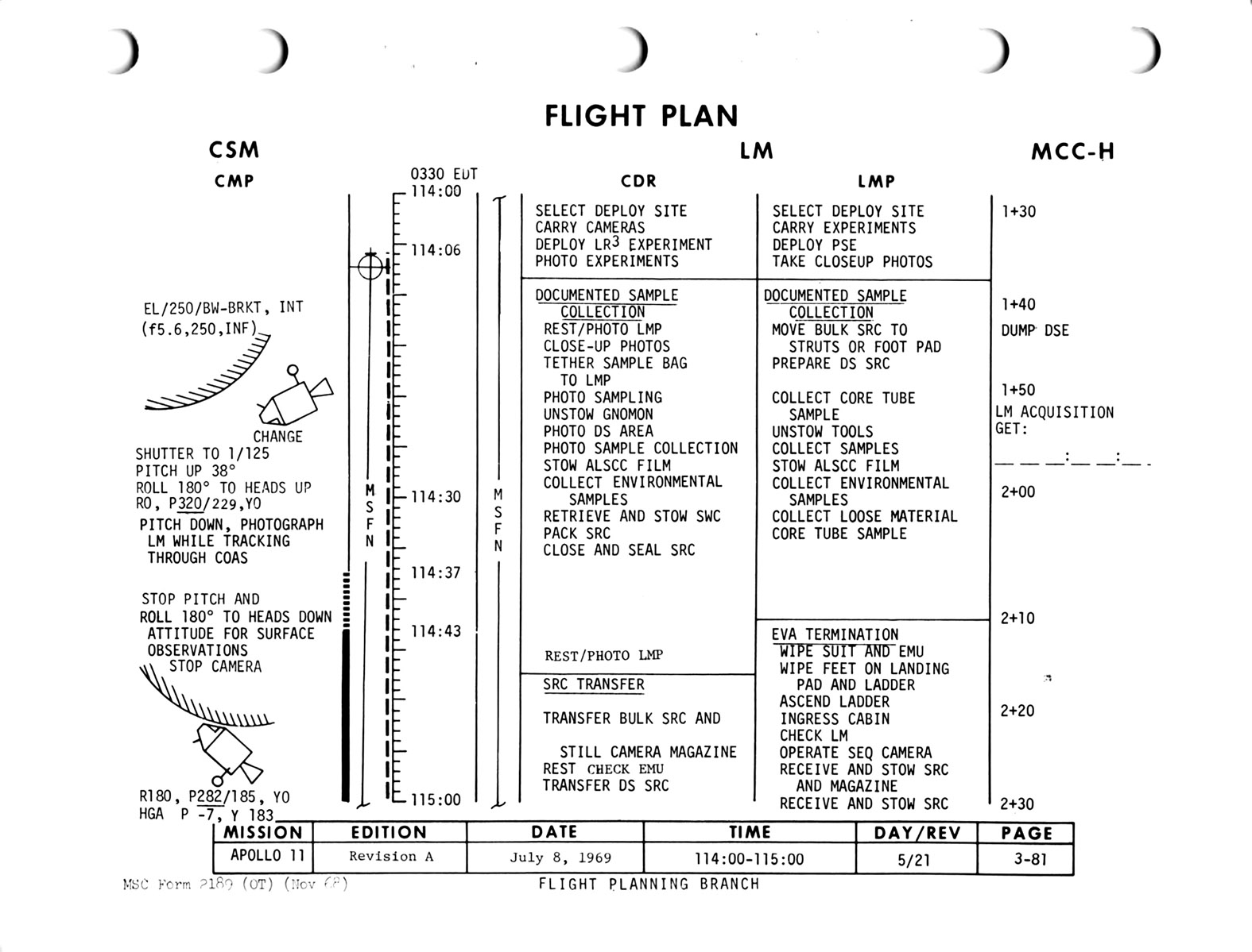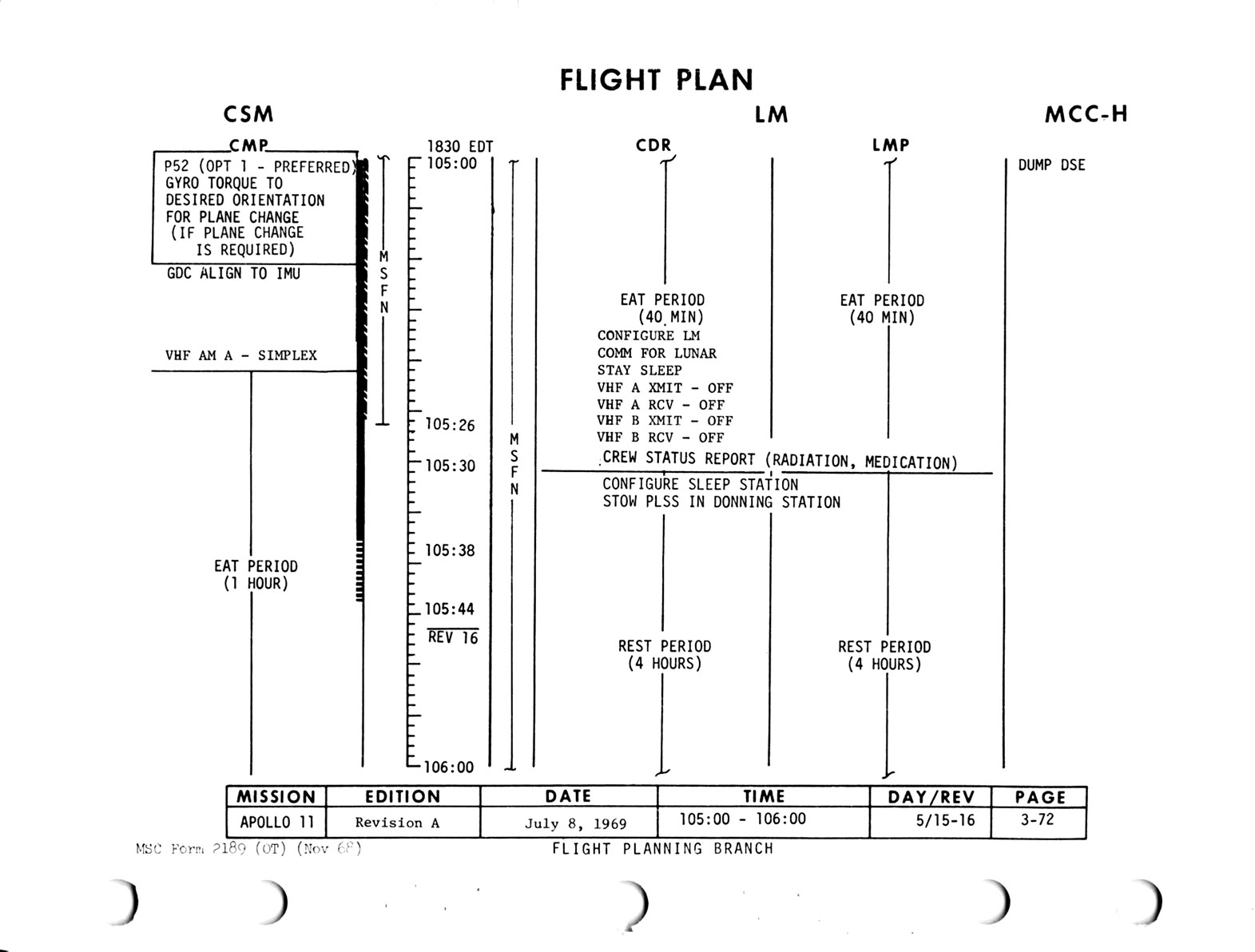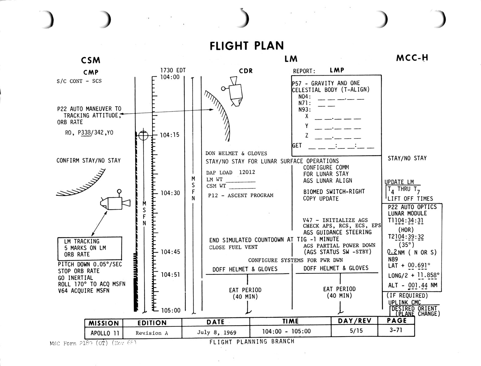 The Flight Plan presented here is not identical to that used on board but there are likely to be very few differences. These pages were derived from a PDF of a scan of the Flight Plan that was sent to the Honeysuckle Creek Tracking Station in Australia few days prior to the flight. The PDF was created by Colin Mackellar for the honeysucklecreek.net website and can be downloaded here.