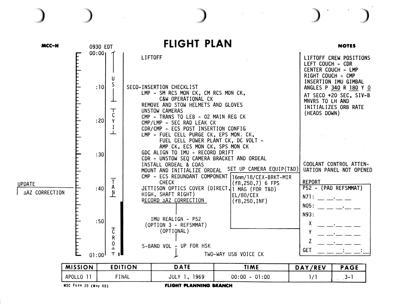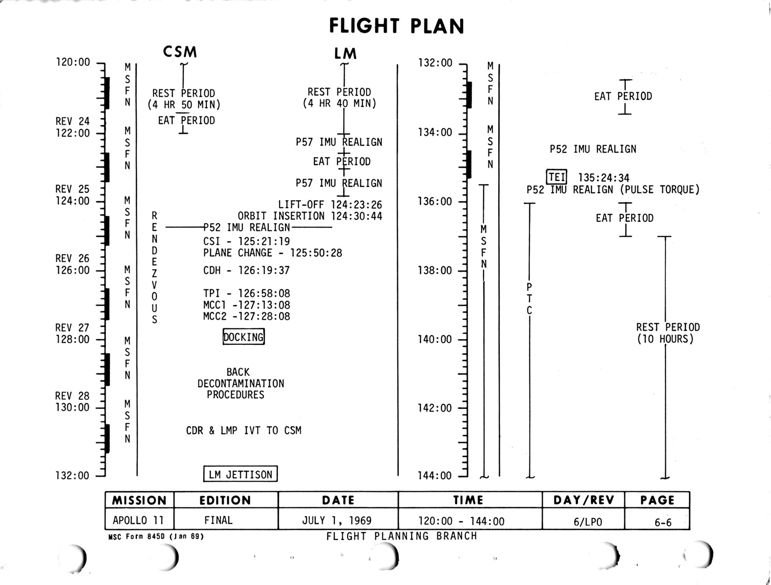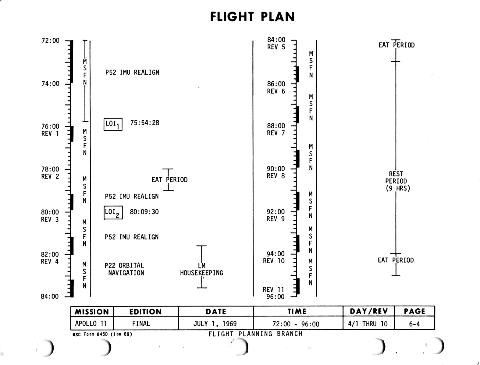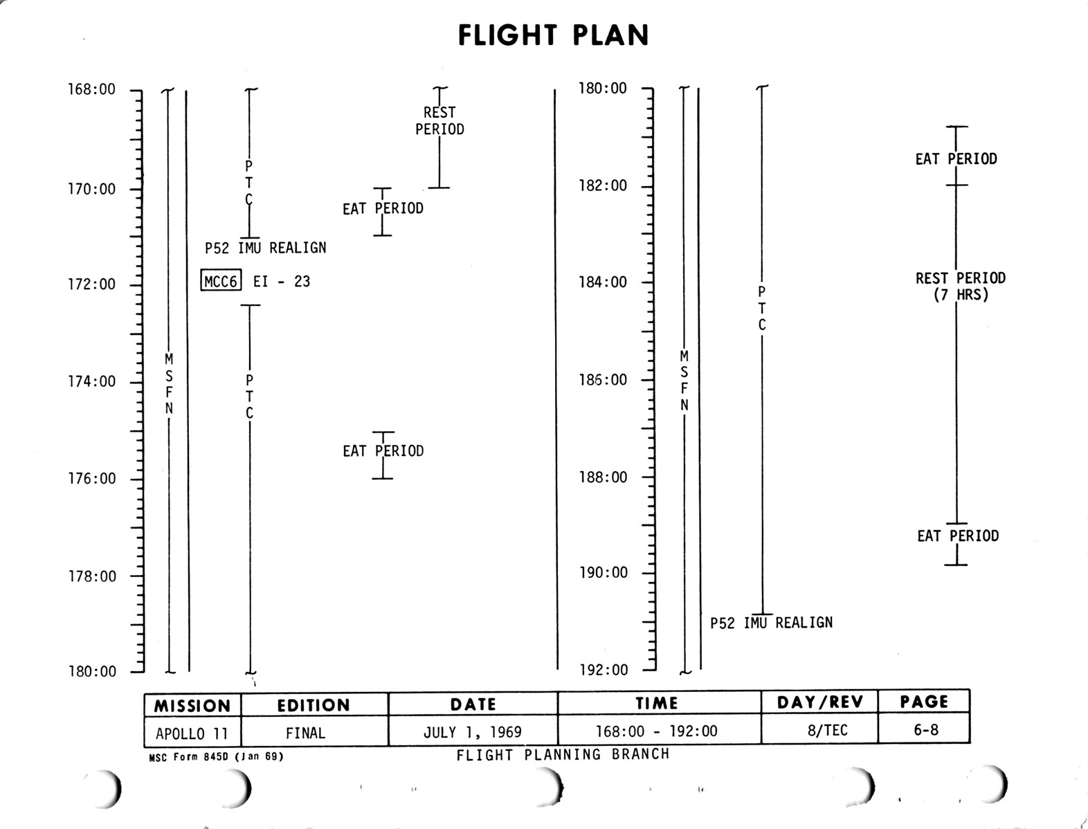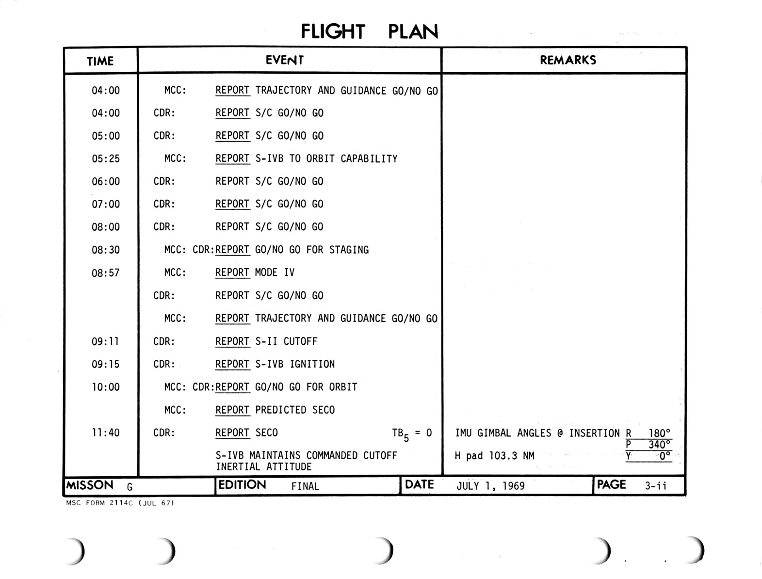 The Flight Plan presented here is not identical to that used on board but there are likely to be very few differences. These pages were derived from a PDF of a scan of the Flight Plan that was sent to the Honeysuckle Creek Tracking Station in Australia few days prior to the flight. The PDF was created by Colin Mackellar for the honeysucklecreek.net website and can be downloaded here.