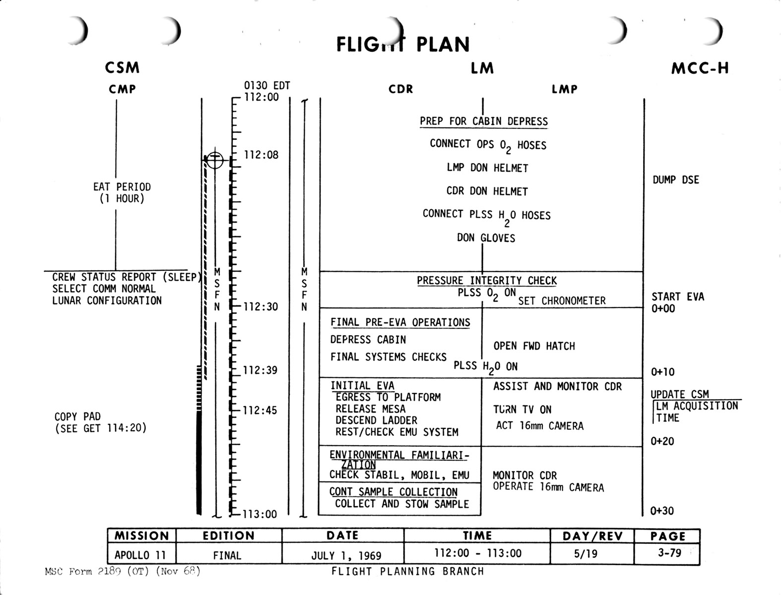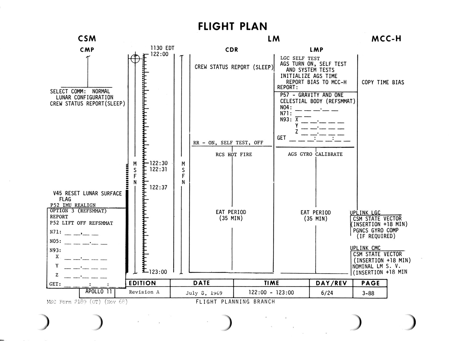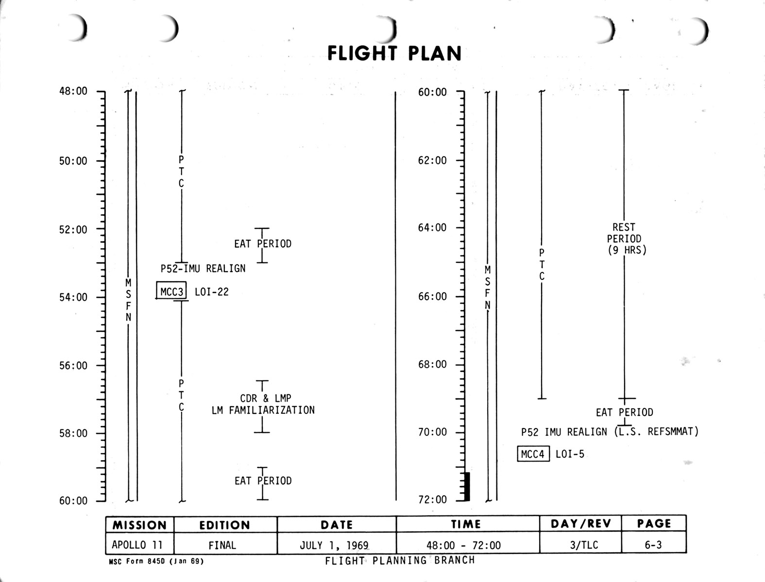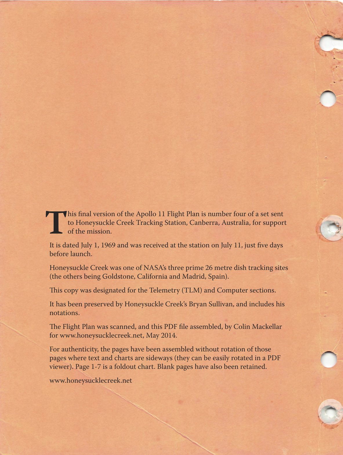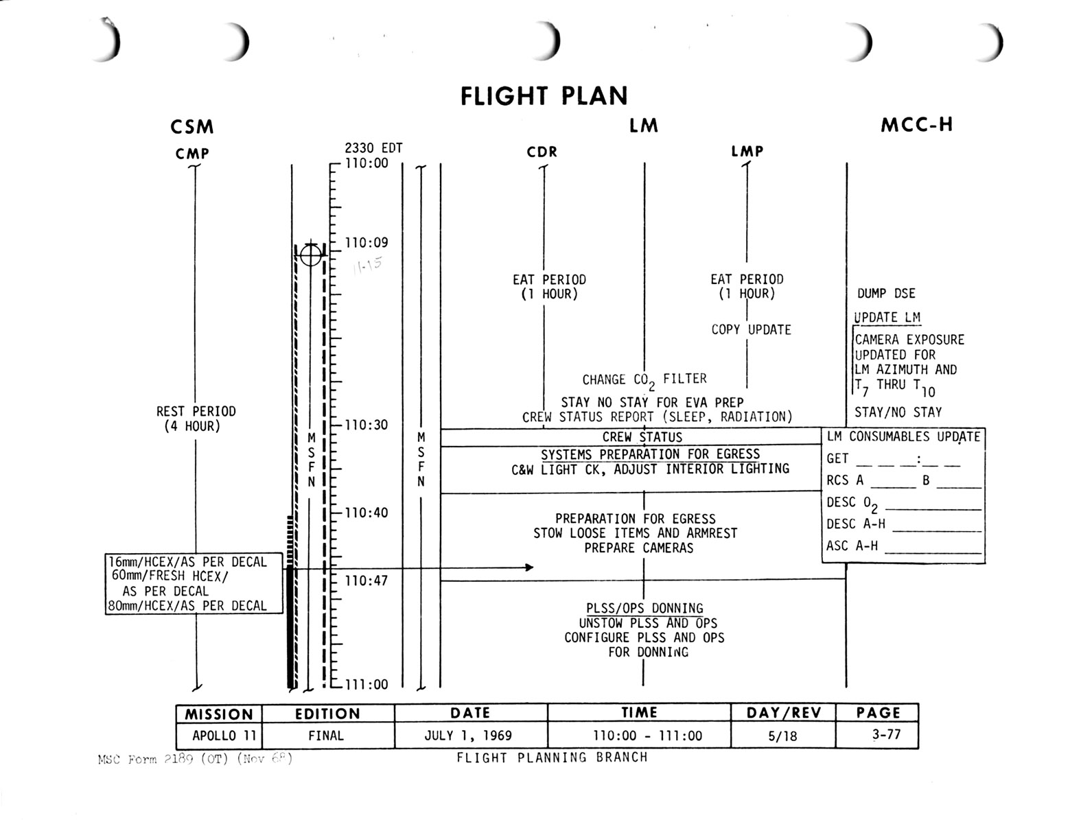 The Flight Plan presented here is not identical to that used on board but there are likely to be very few differences. These pages were derived from a PDF of a scan of the Flight Plan that was sent to the Honeysuckle Creek Tracking Station in Australia few days prior to the flight. The PDF was created by Colin Mackellar for the honeysucklecreek.net website and can be downloaded here.