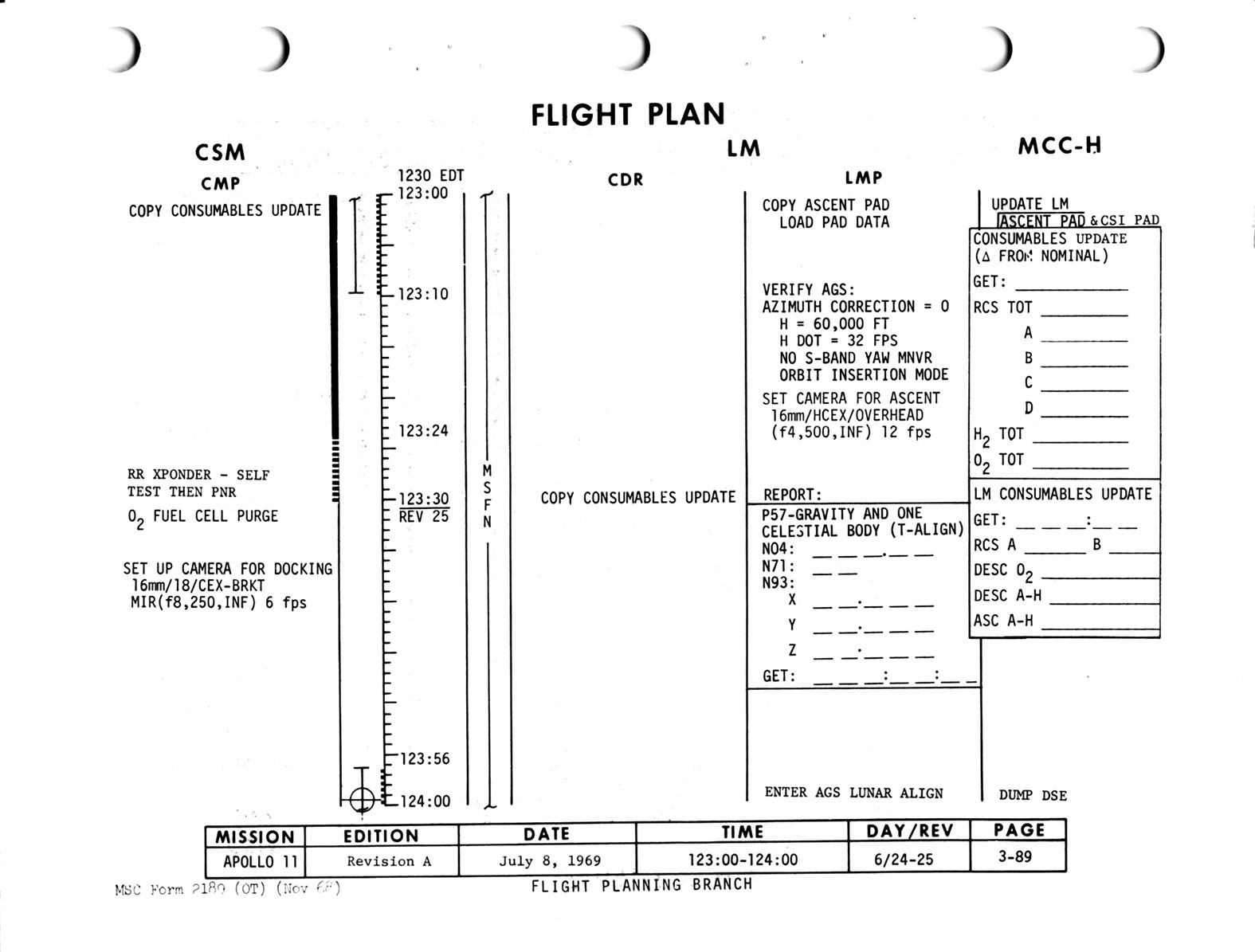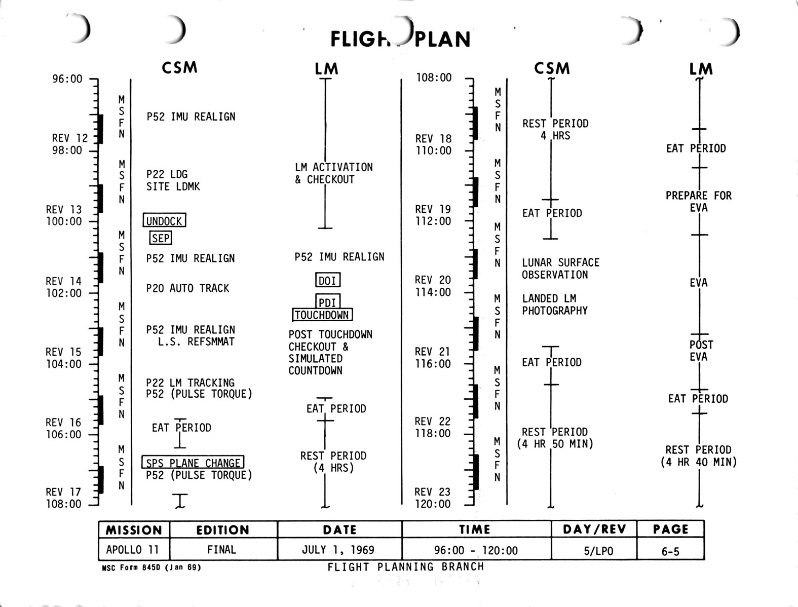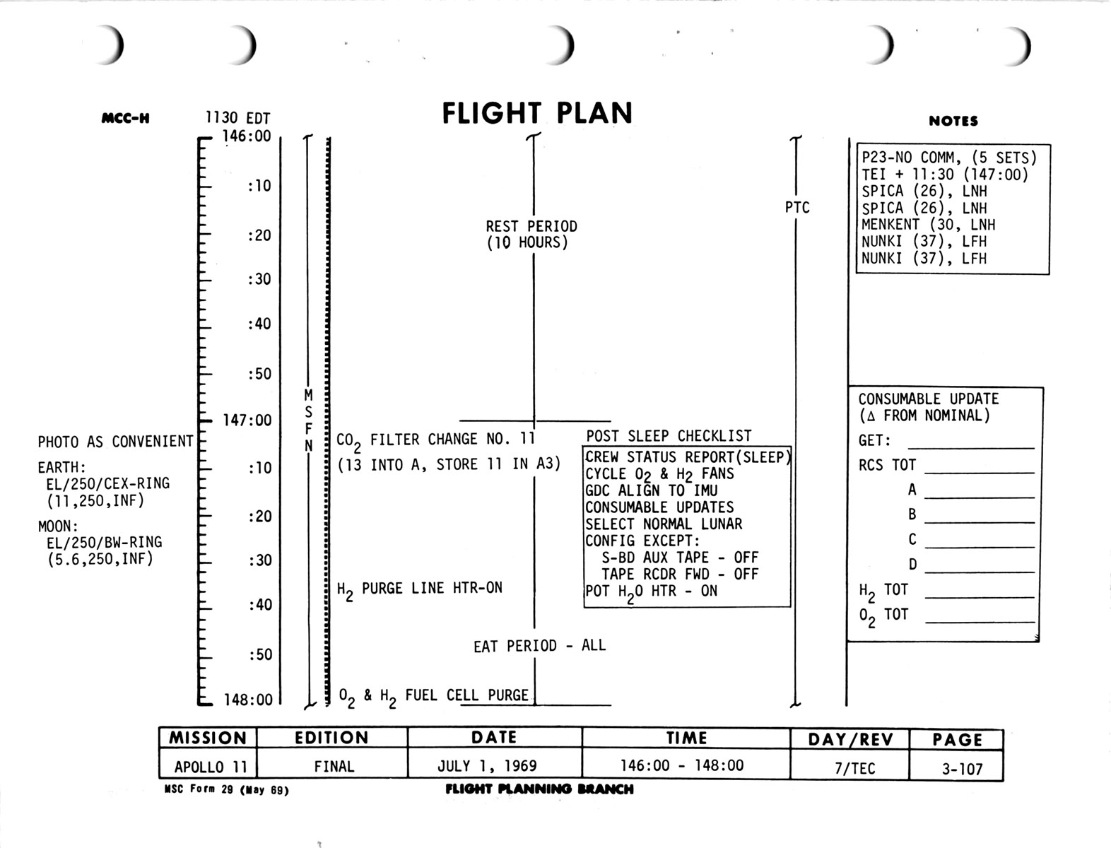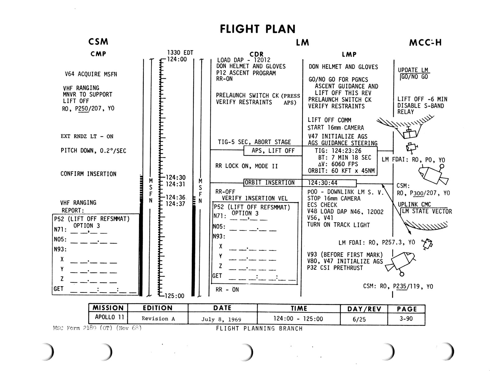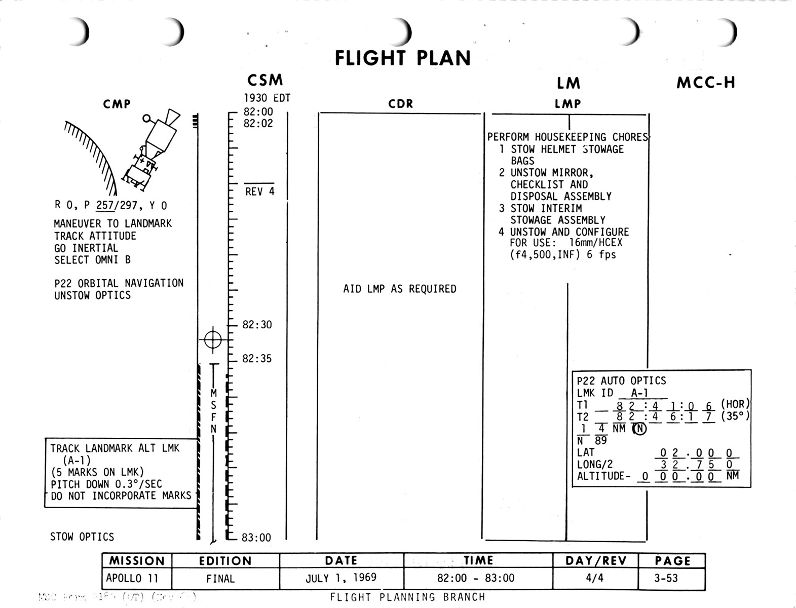 The Flight Plan presented here is not identical to that used on board but there are likely to be very few differences. These pages were derived from a PDF of a scan of the Flight Plan that was sent to the Honeysuckle Creek Tracking Station in Australia few days prior to the flight. The PDF was created by Colin Mackellar for the honeysucklecreek.net website and can be downloaded here.