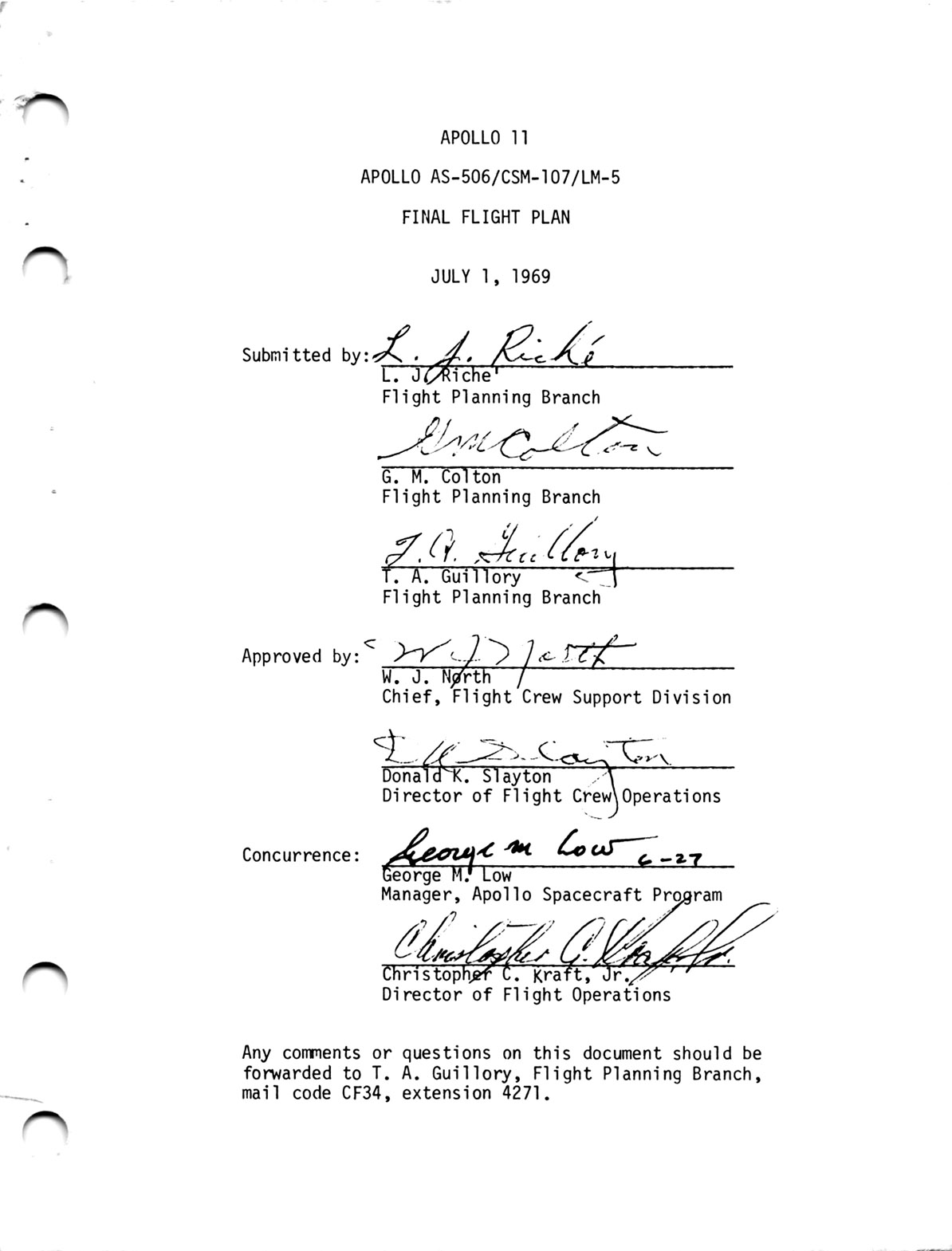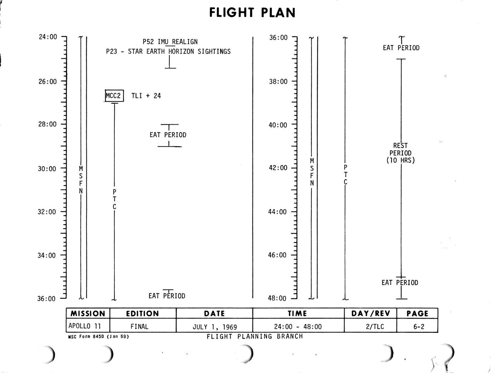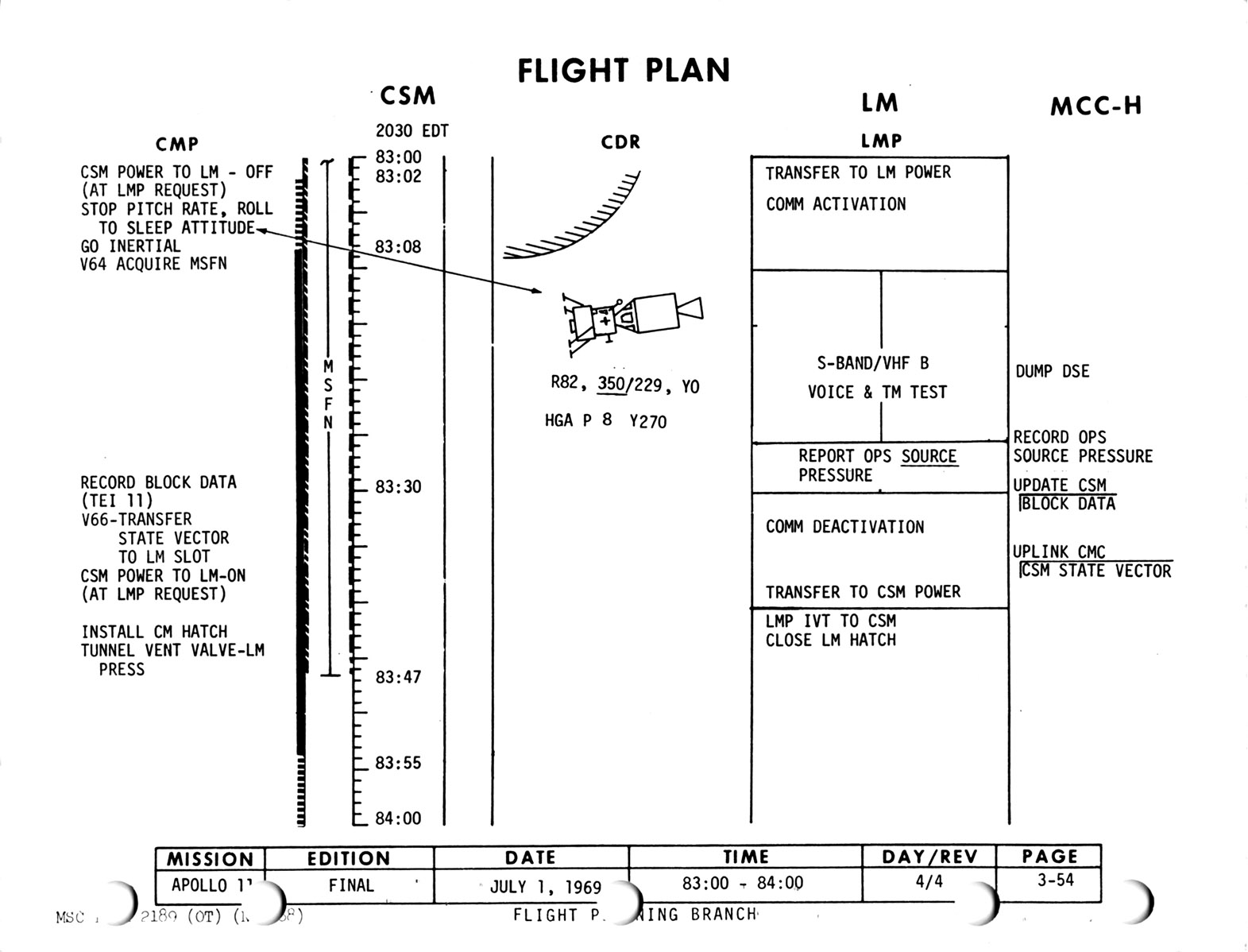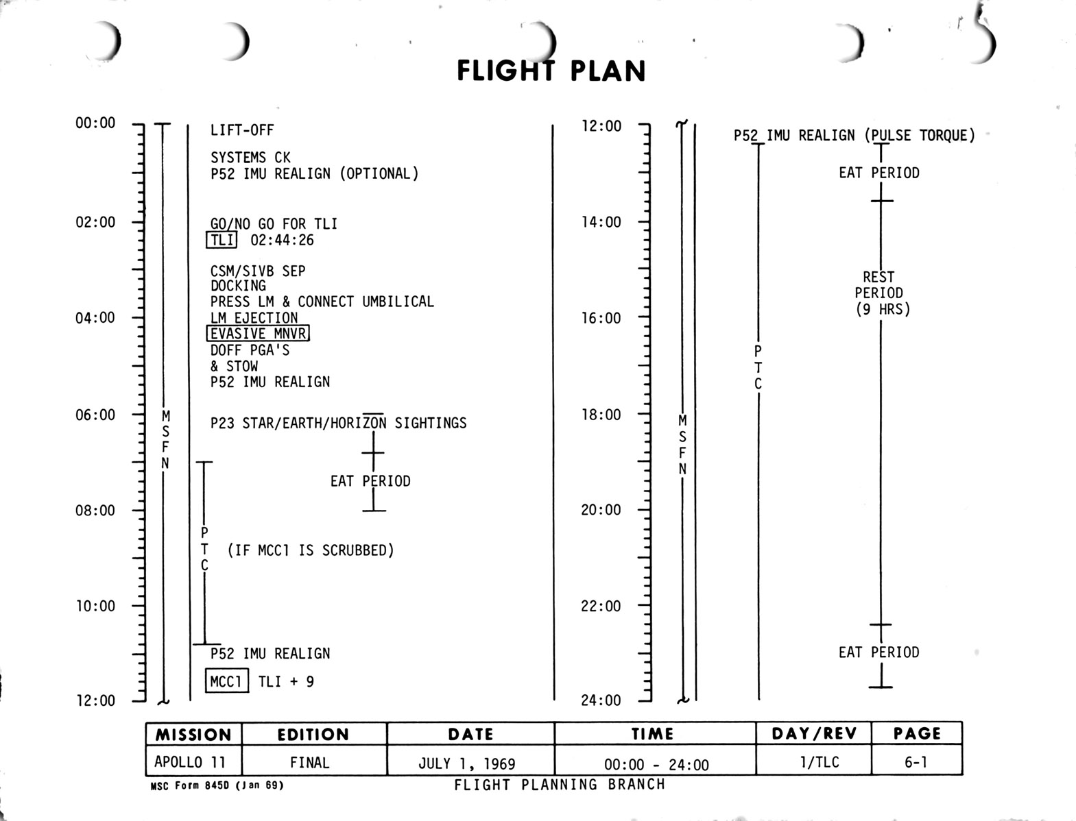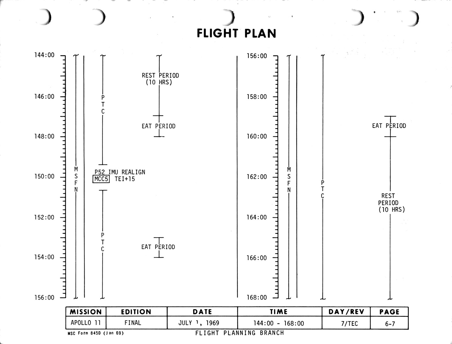 The Flight Plan presented here is not identical to that used on board but there are likely to be very few differences. These pages were derived from a PDF of a scan of the Flight Plan that was sent to the Honeysuckle Creek Tracking Station in Australia few days prior to the flight. The PDF was created by Colin Mackellar for the honeysucklecreek.net website and can be downloaded here.