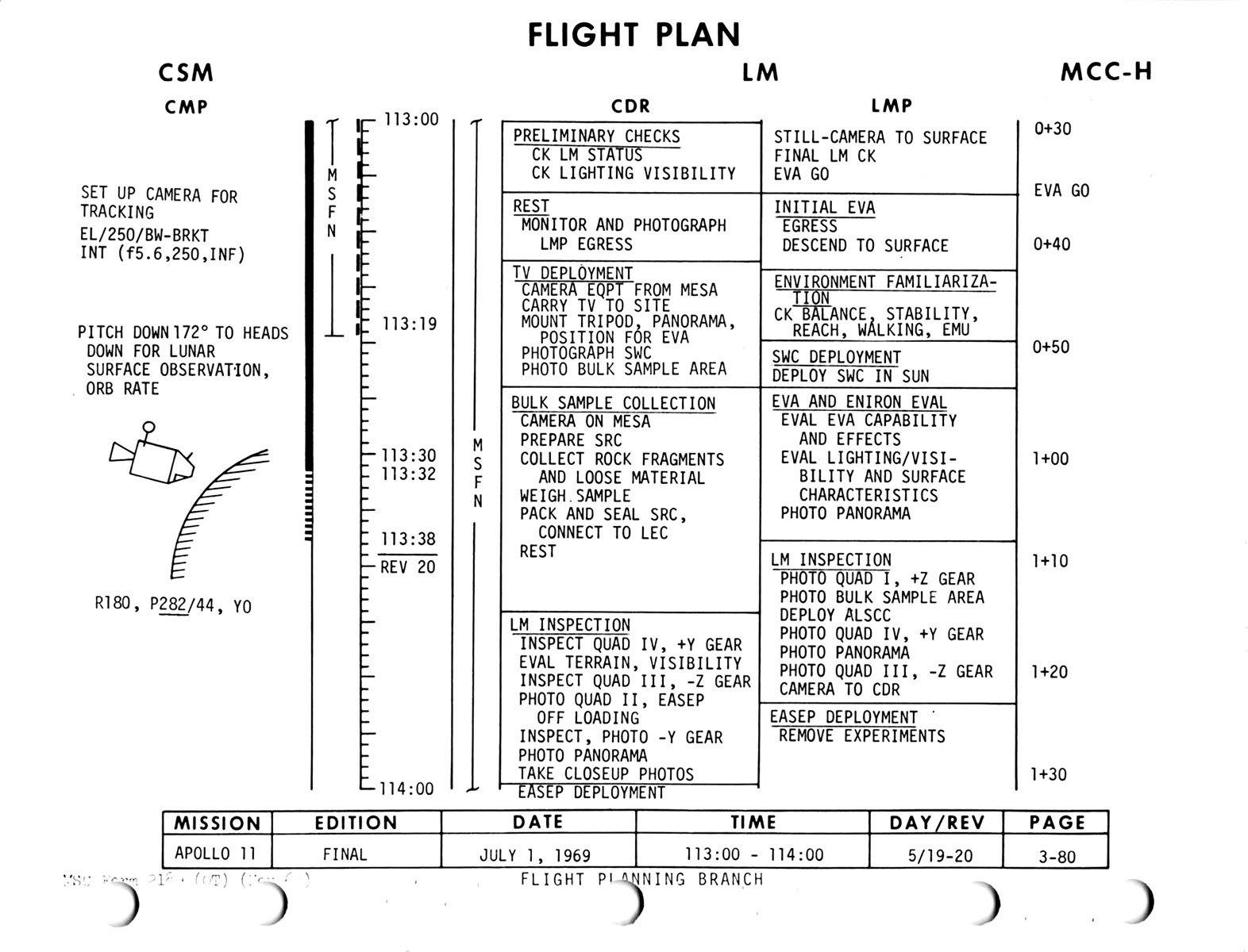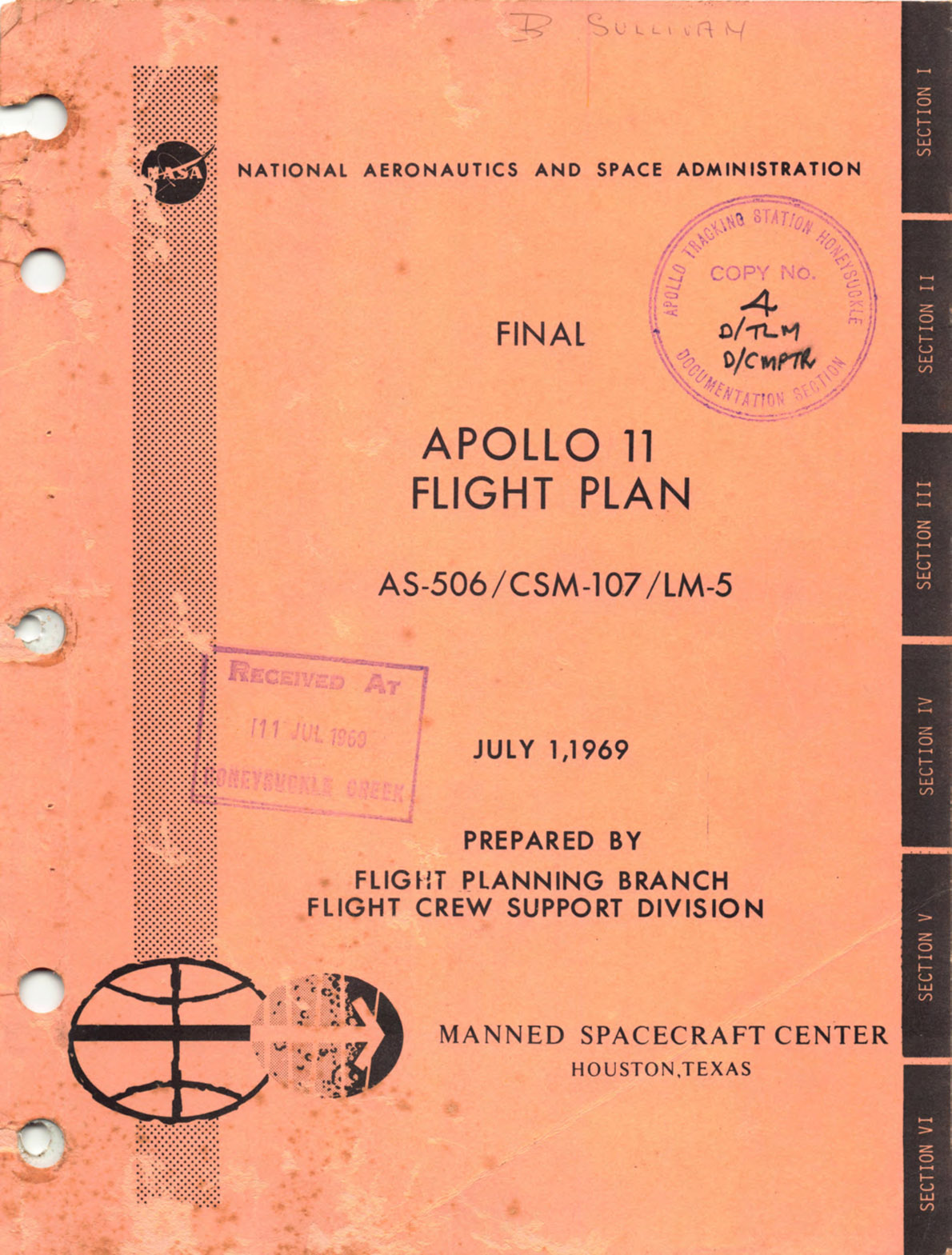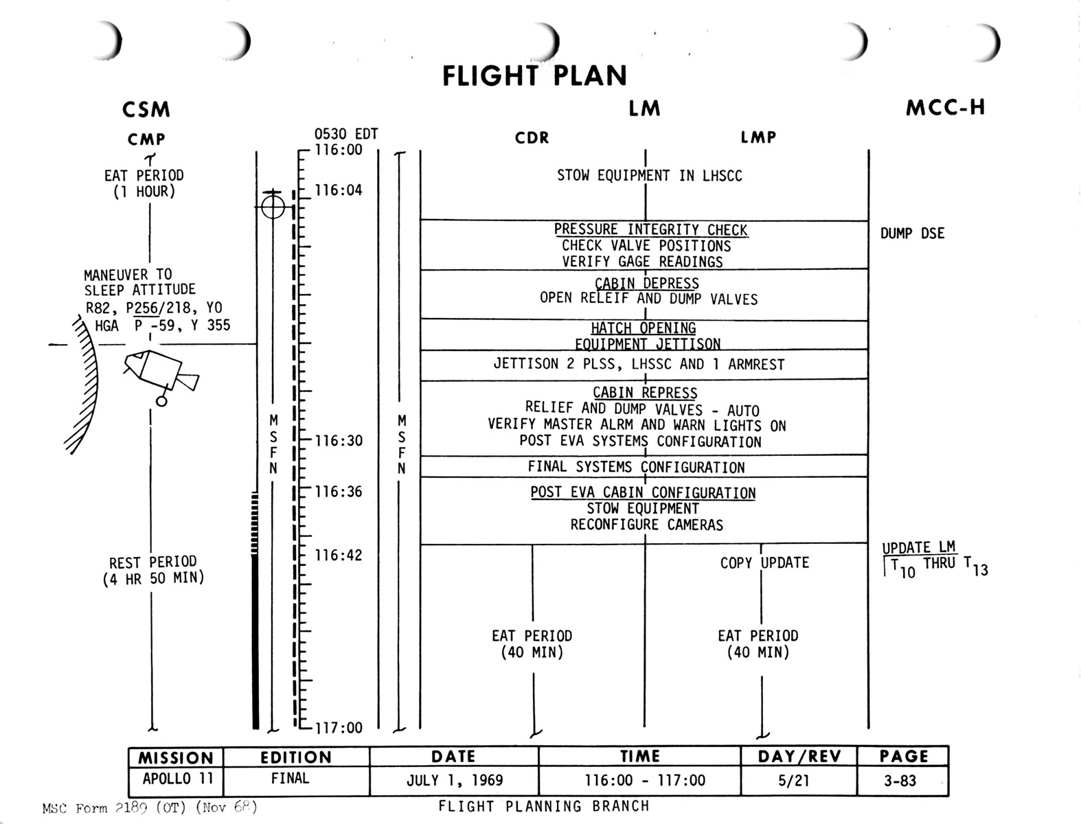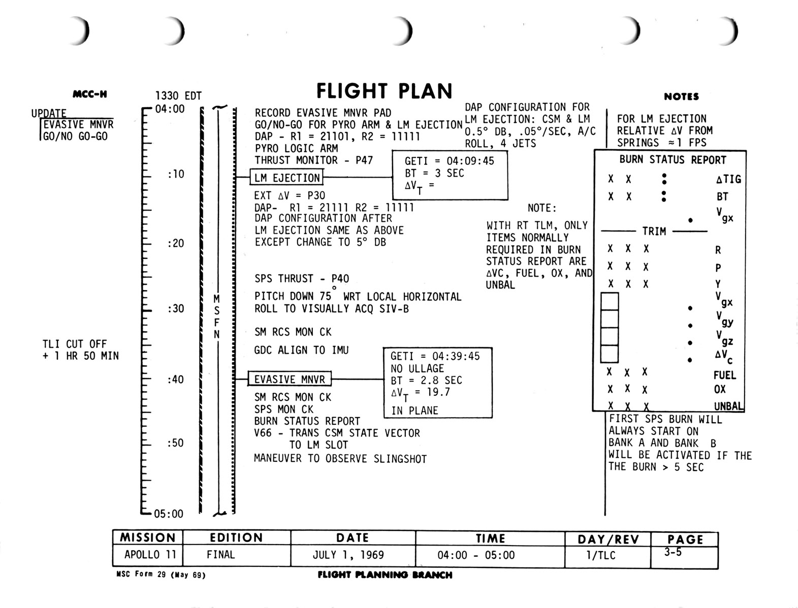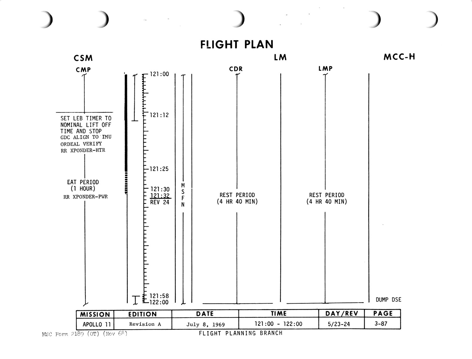 The Flight Plan presented here is not identical to that used on board but there are likely to be very few differences. These pages were derived from a PDF of a scan of the Flight Plan that was sent to the Honeysuckle Creek Tracking Station in Australia few days prior to the flight. The PDF was created by Colin Mackellar for the honeysucklecreek.net website and can be downloaded here.