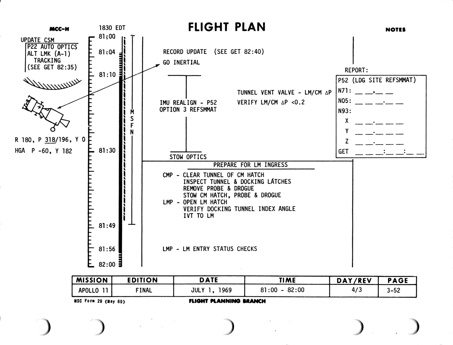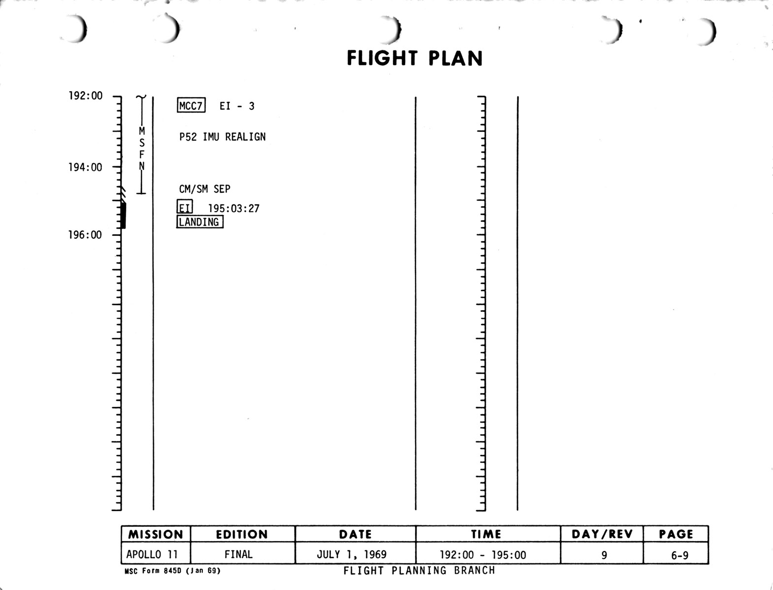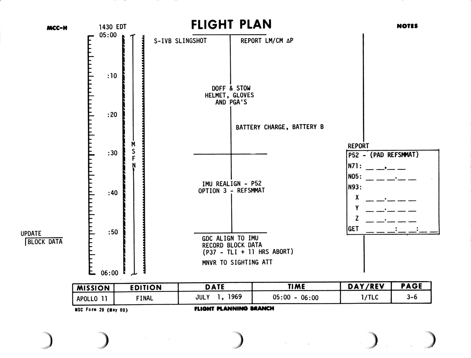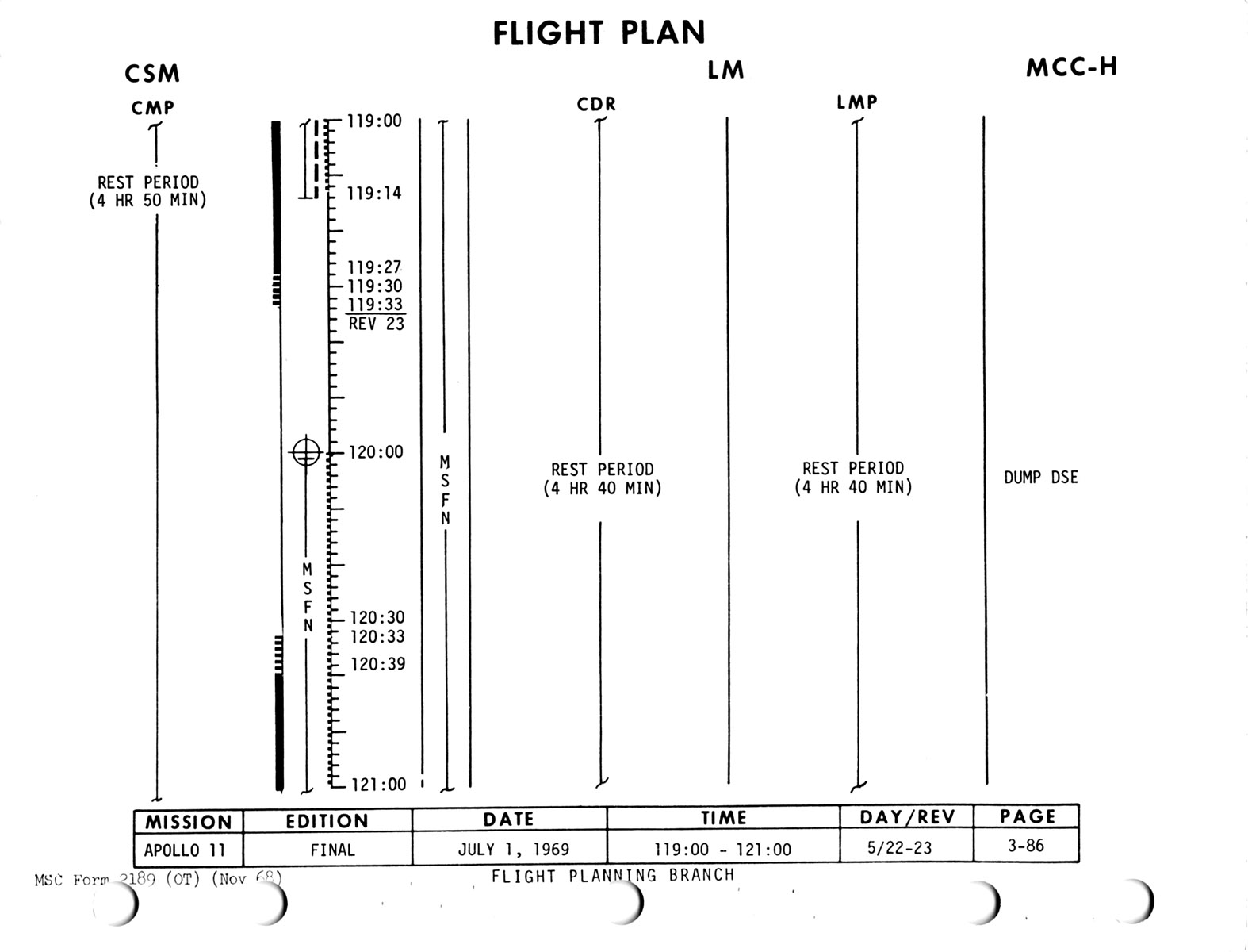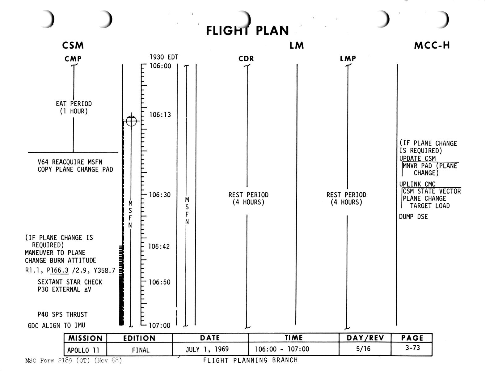 The Flight Plan presented here is not identical to that used on board but there are likely to be very few differences. These pages were derived from a PDF of a scan of the Flight Plan that was sent to the Honeysuckle Creek Tracking Station in Australia few days prior to the flight. The PDF was created by Colin Mackellar for the honeysucklecreek.net website and can be downloaded here.