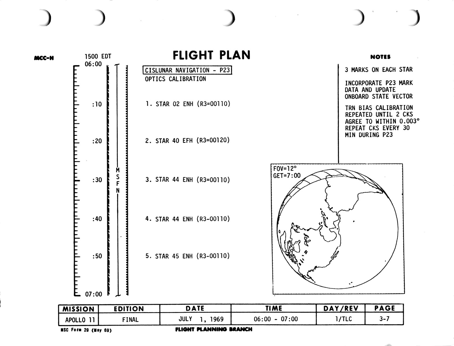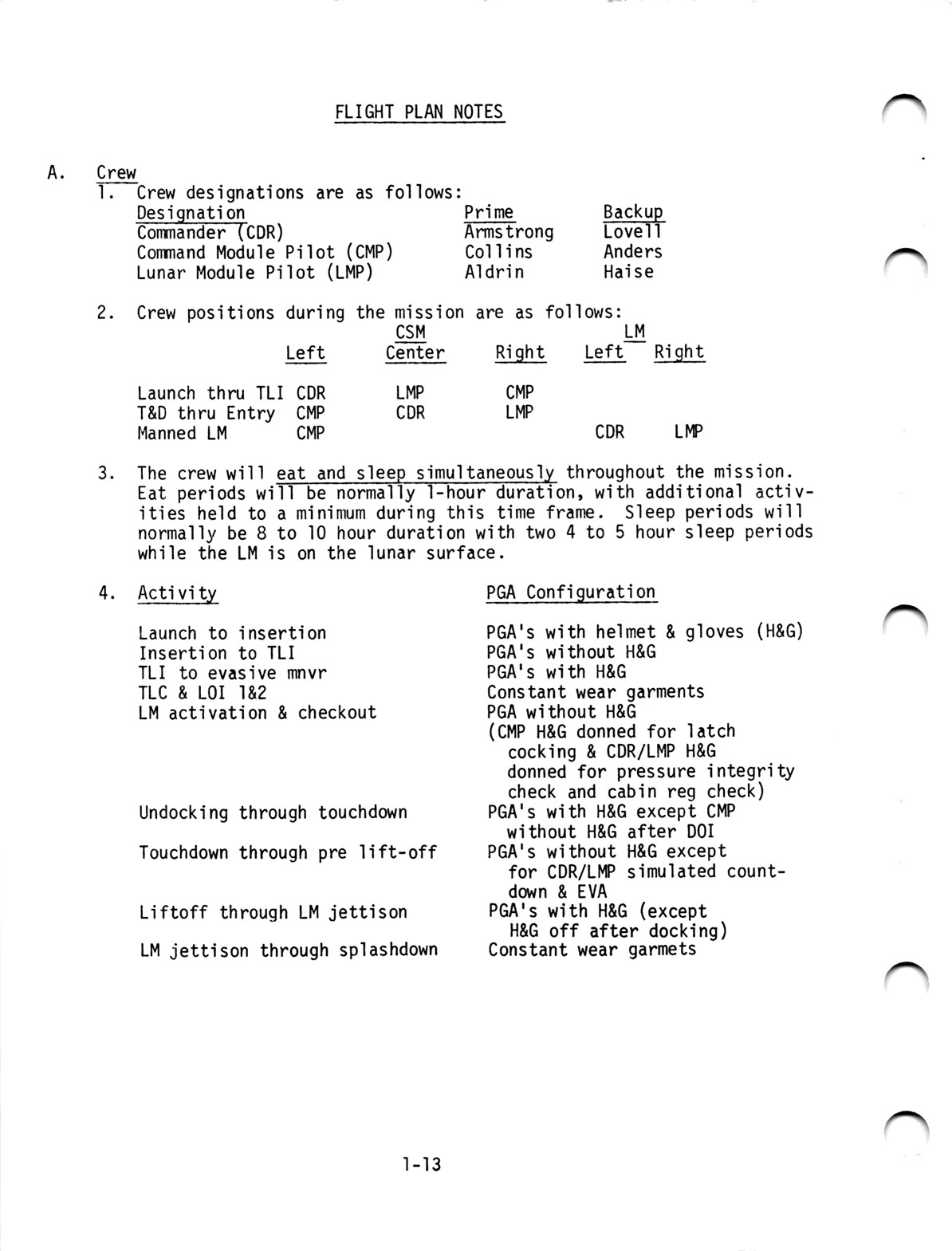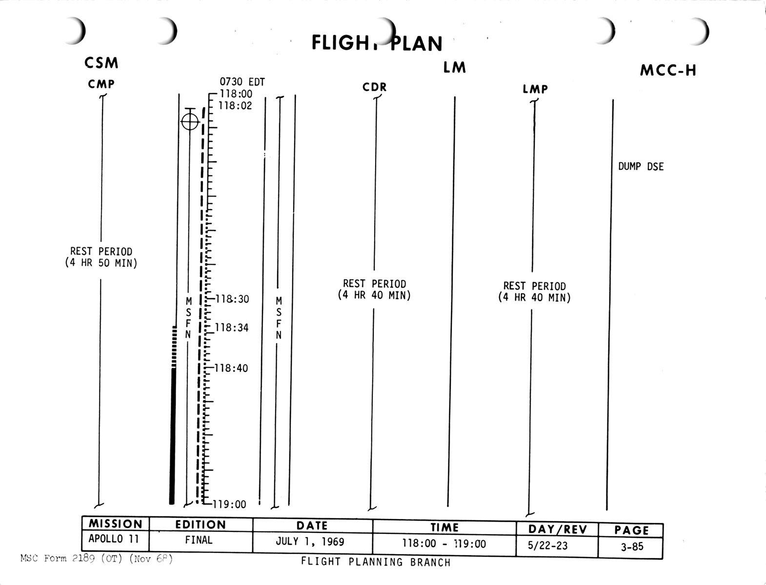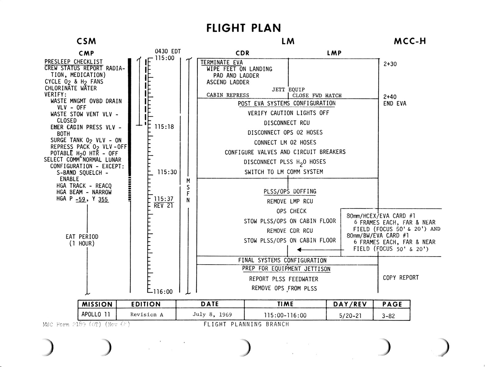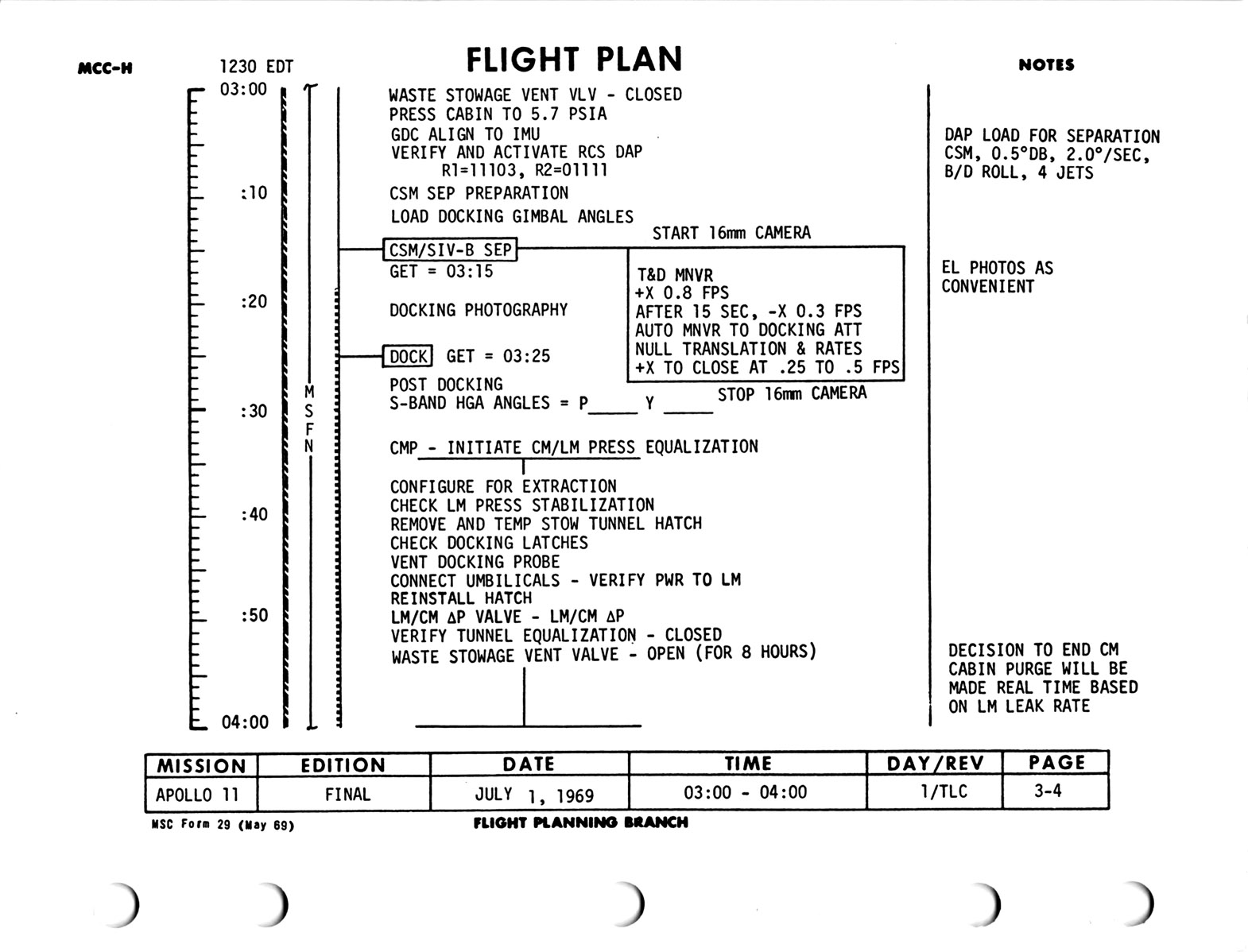 The Flight Plan presented here is not identical to that used on board but there are likely to be very few differences. These pages were derived from a PDF of a scan of the Flight Plan that was sent to the Honeysuckle Creek Tracking Station in Australia few days prior to the flight. The PDF was created by Colin Mackellar for the honeysucklecreek.net website and can be downloaded here.