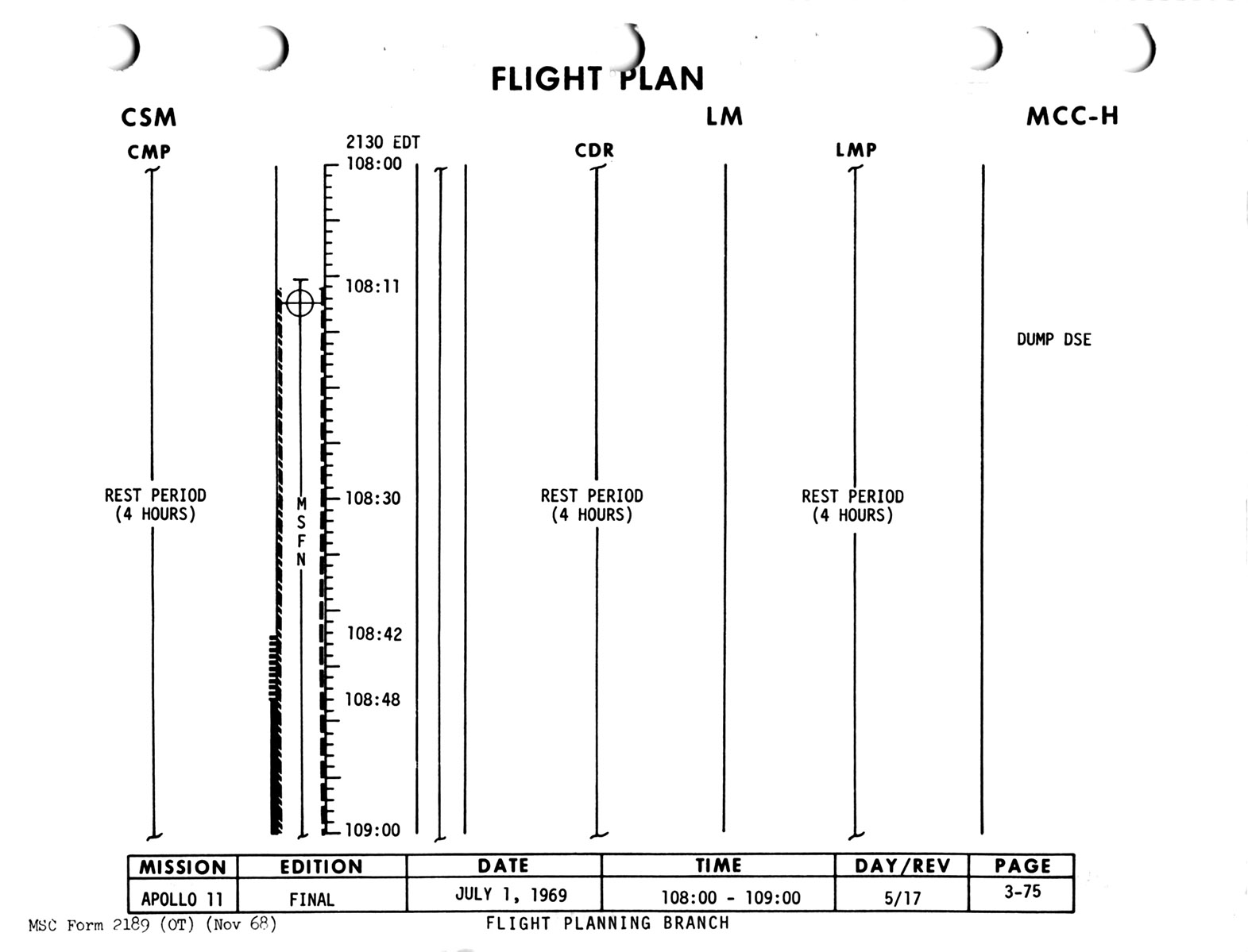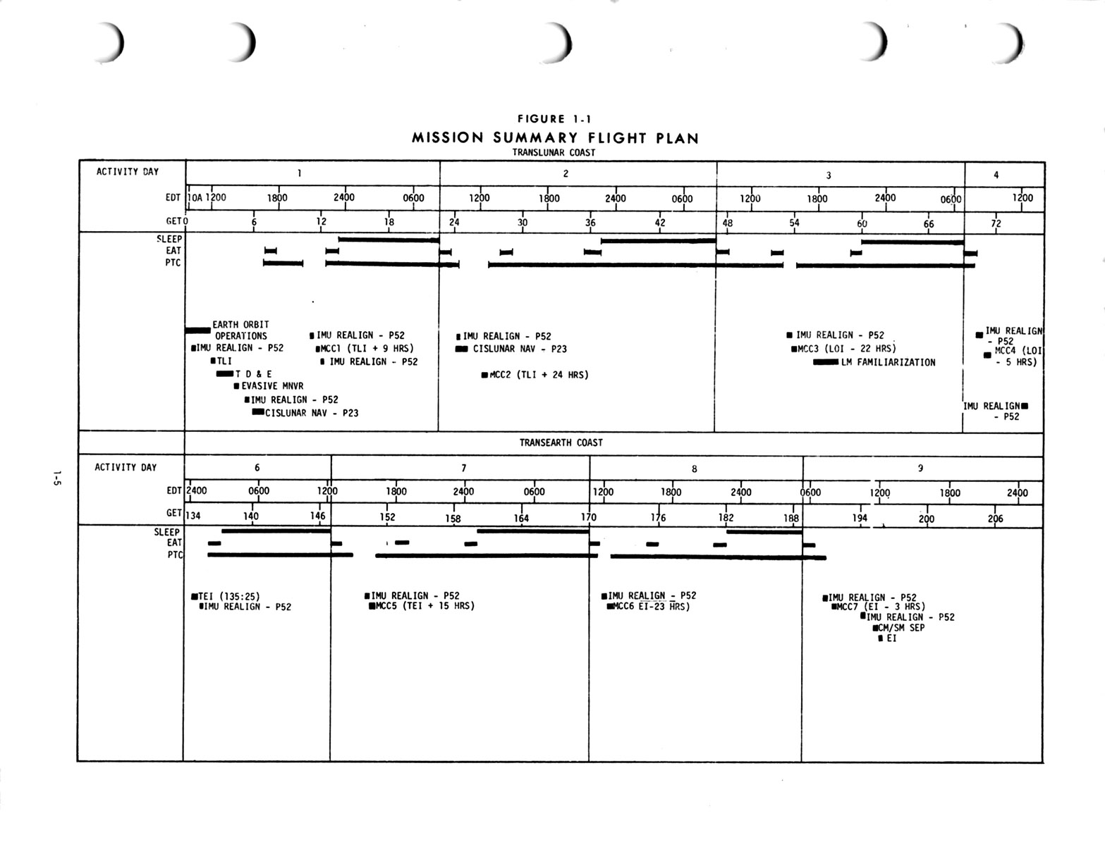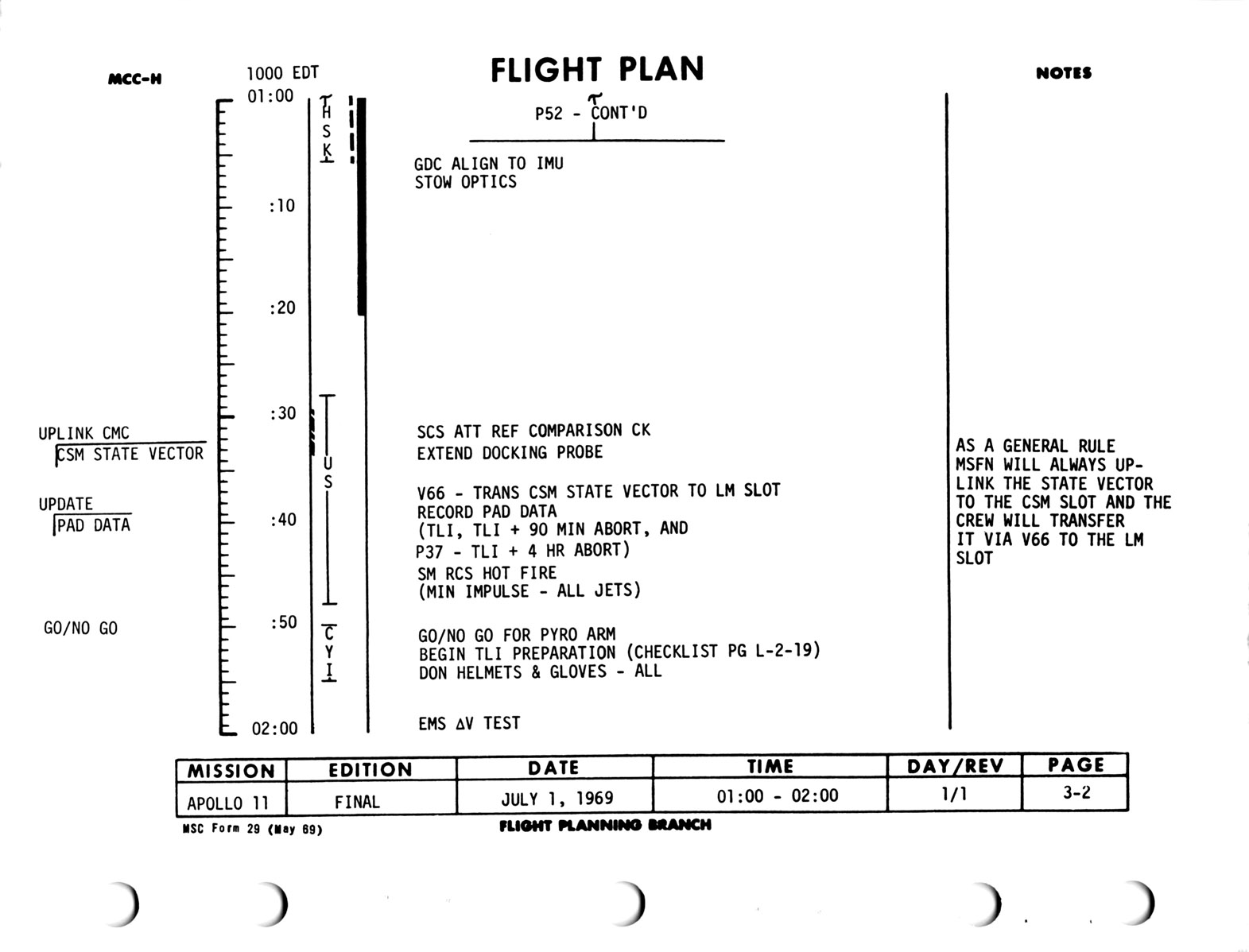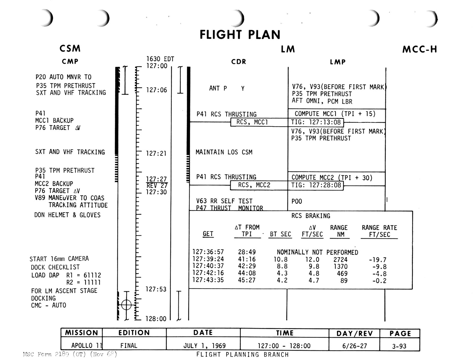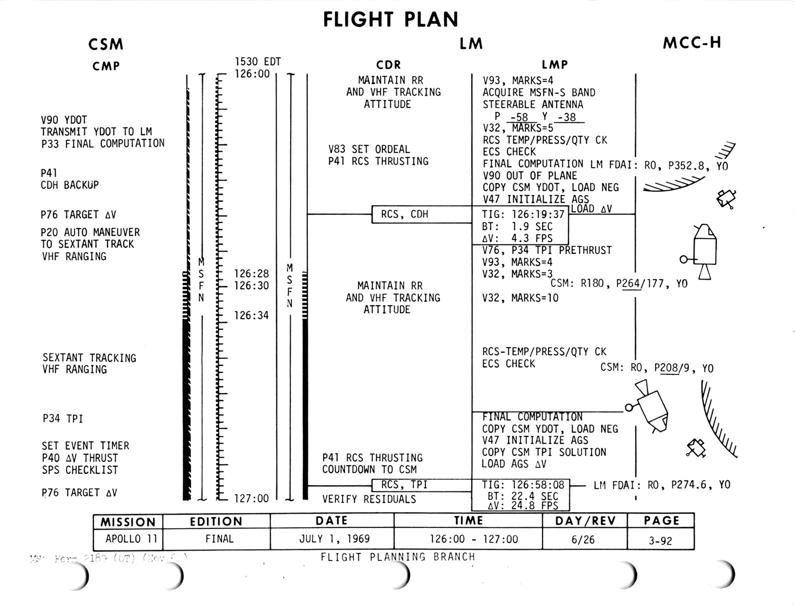 The Flight Plan presented here is not identical to that used on board but there are likely to be very few differences. These pages were derived from a PDF of a scan of the Flight Plan that was sent to the Honeysuckle Creek Tracking Station in Australia few days prior to the flight. The PDF was created by Colin Mackellar for the honeysucklecreek.net website and can be downloaded here.