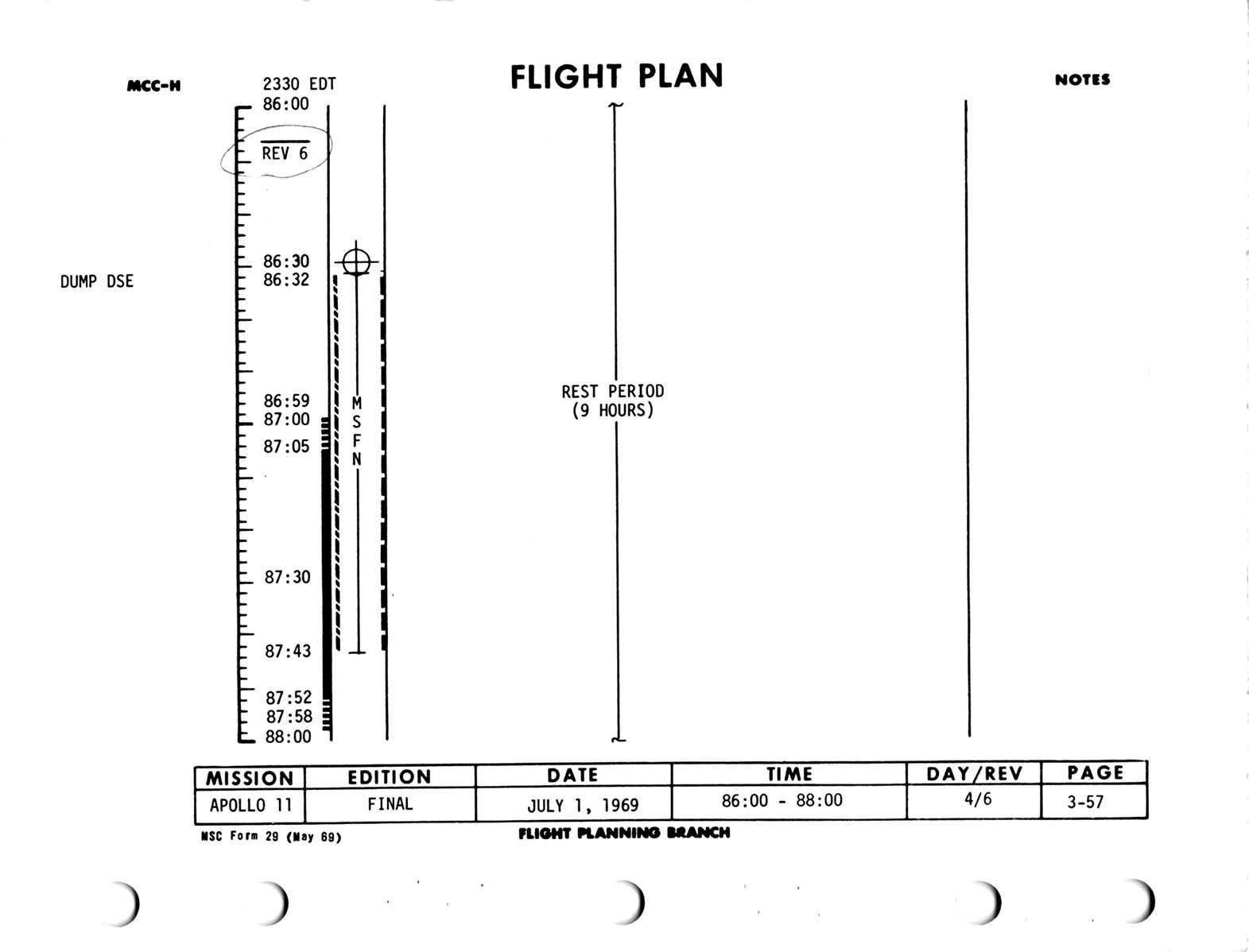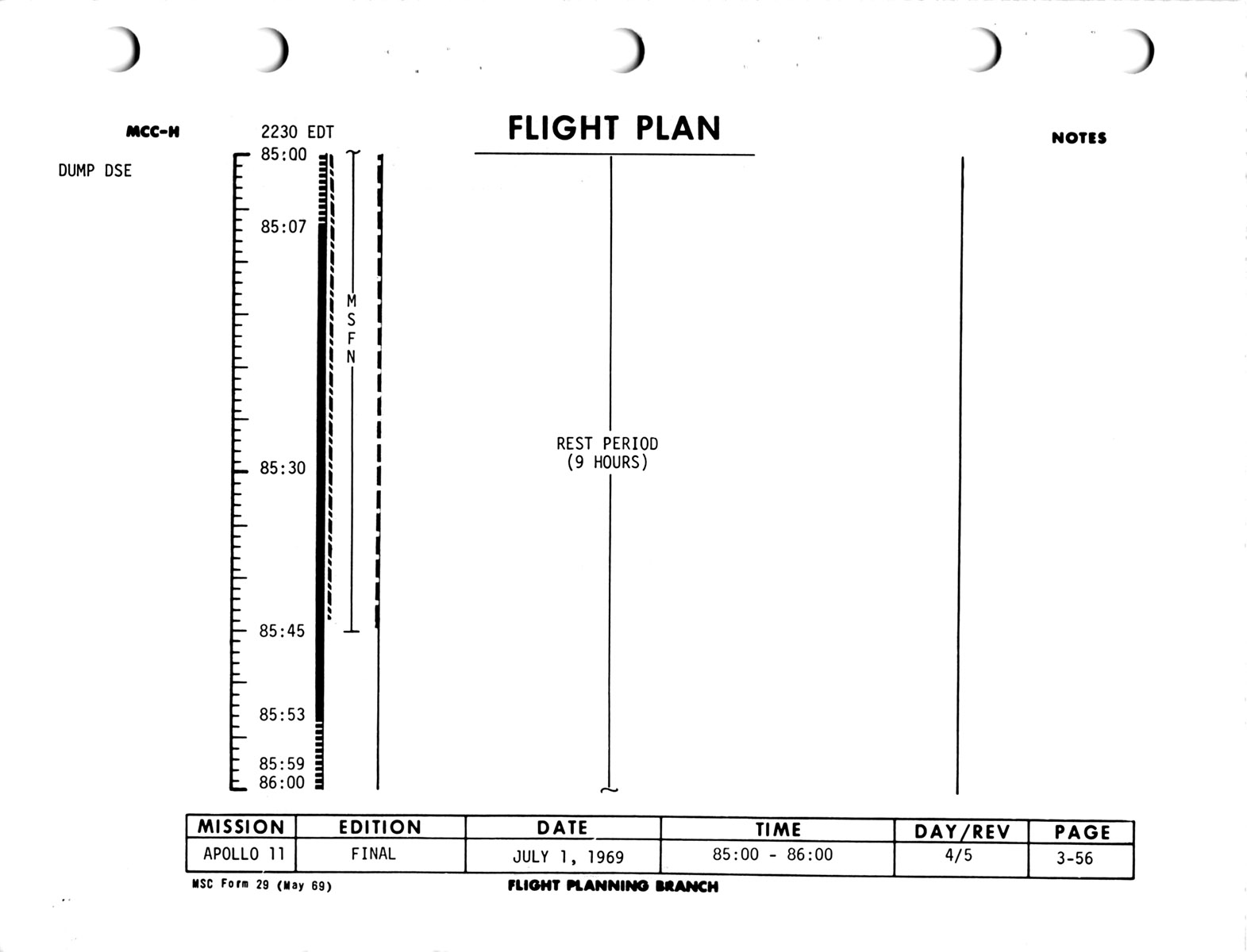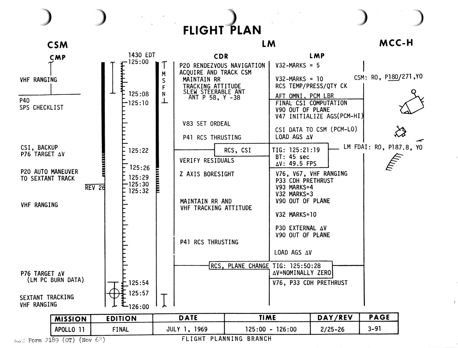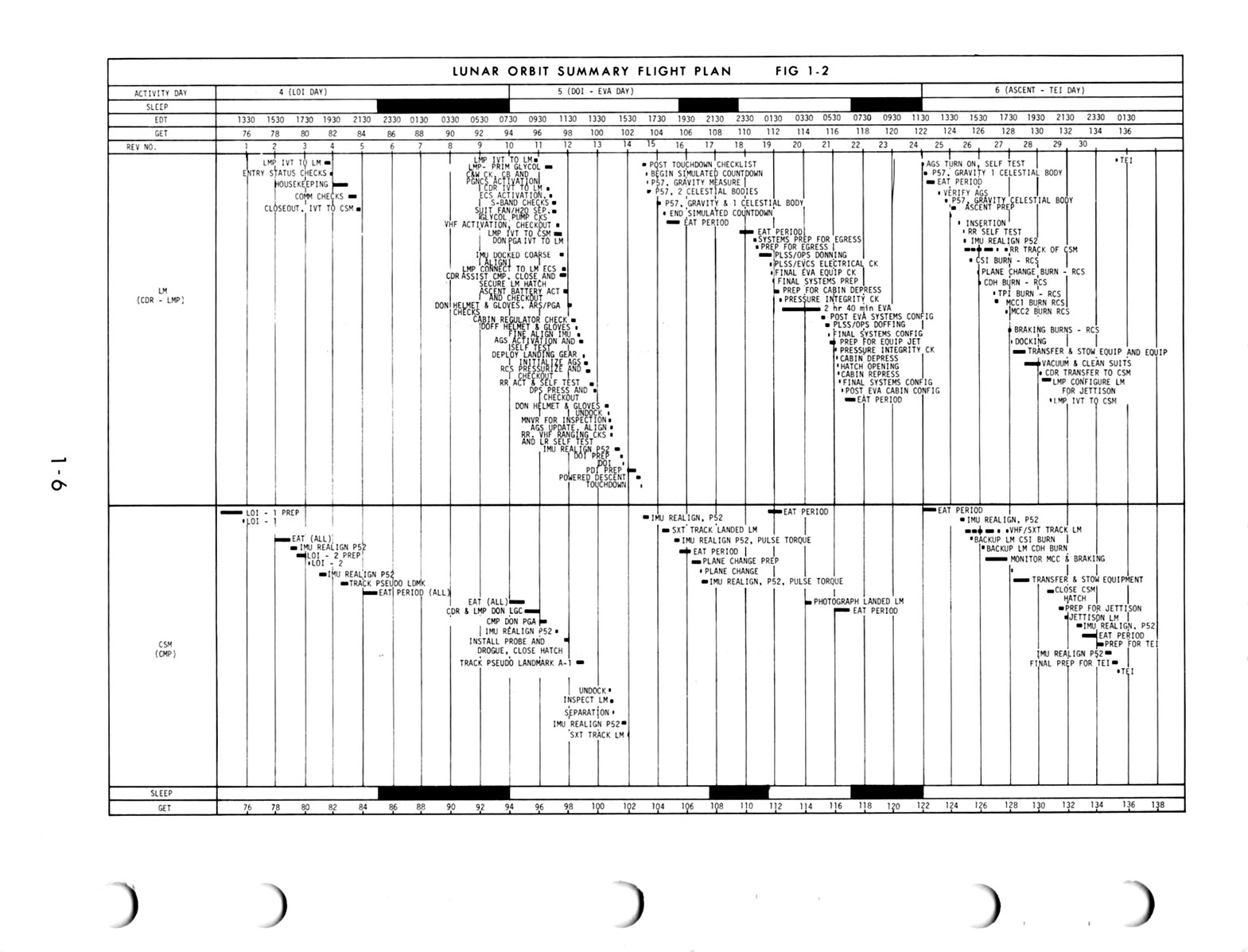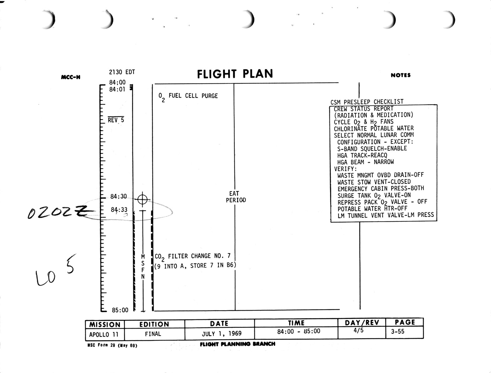 The Flight Plan presented here is not identical to that used on board but there are likely to be very few differences. These pages were derived from a PDF of a scan of the Flight Plan that was sent to the Honeysuckle Creek Tracking Station in Australia few days prior to the flight. The PDF was created by Colin Mackellar for the honeysucklecreek.net website and can be downloaded here.