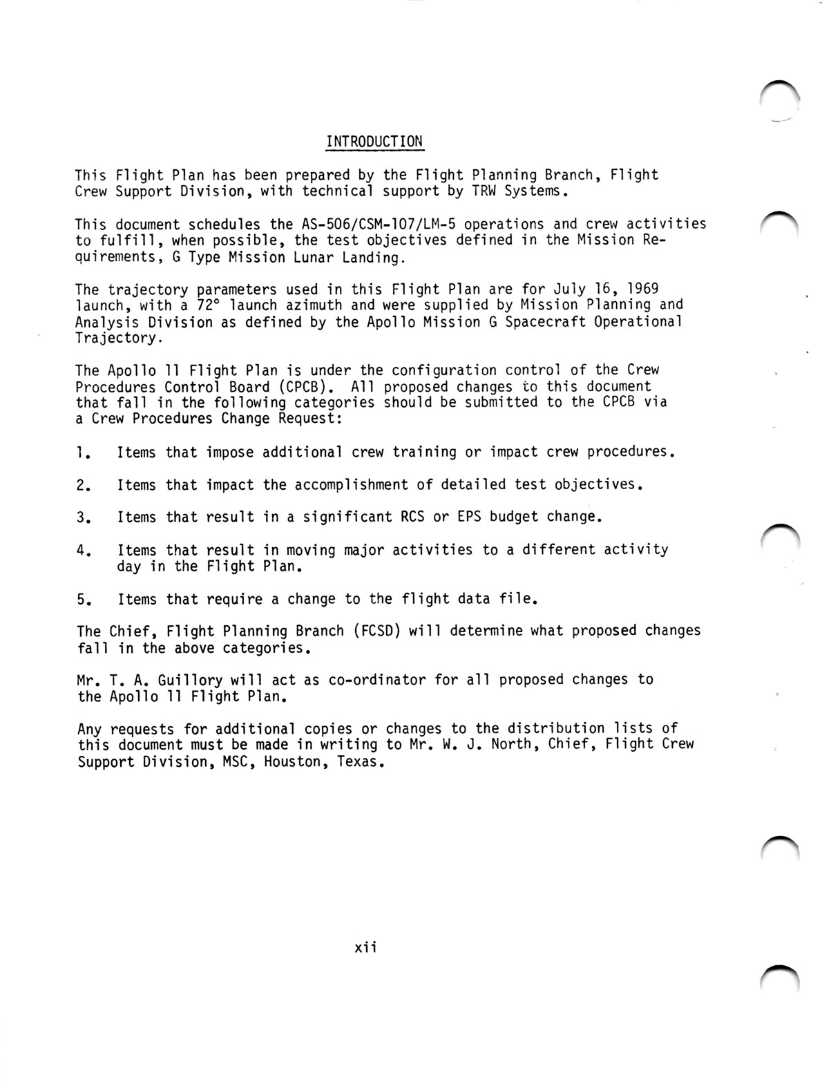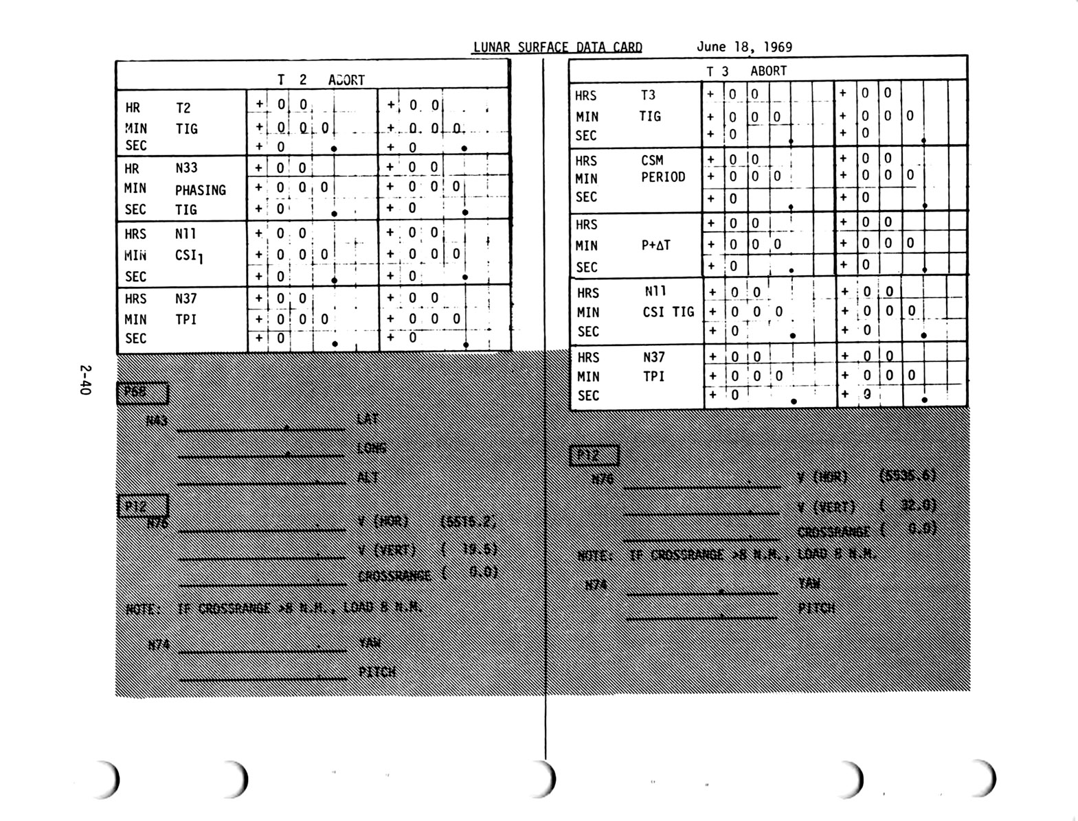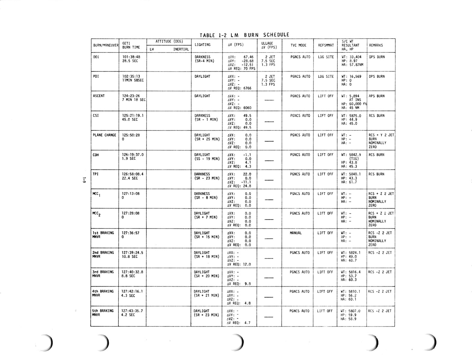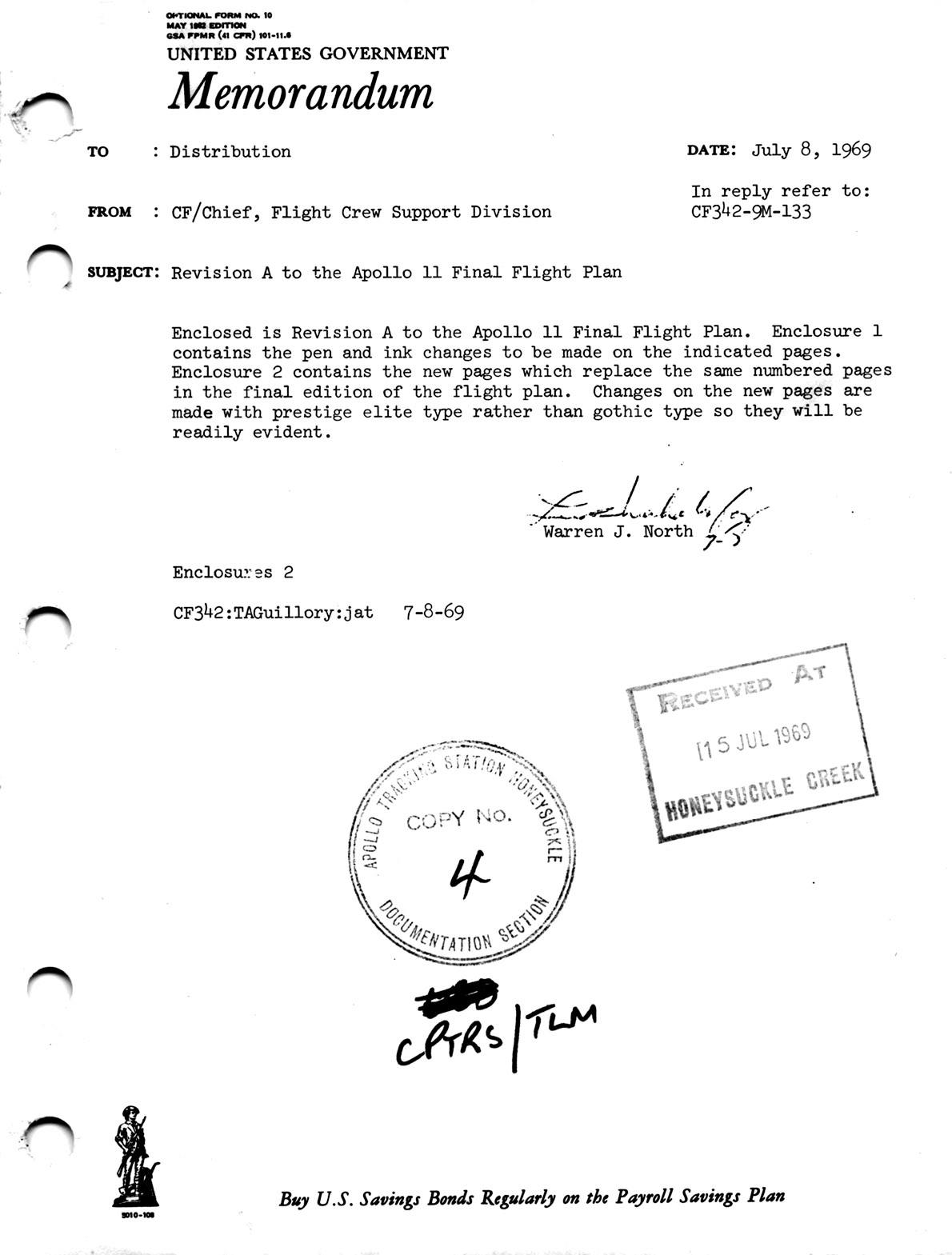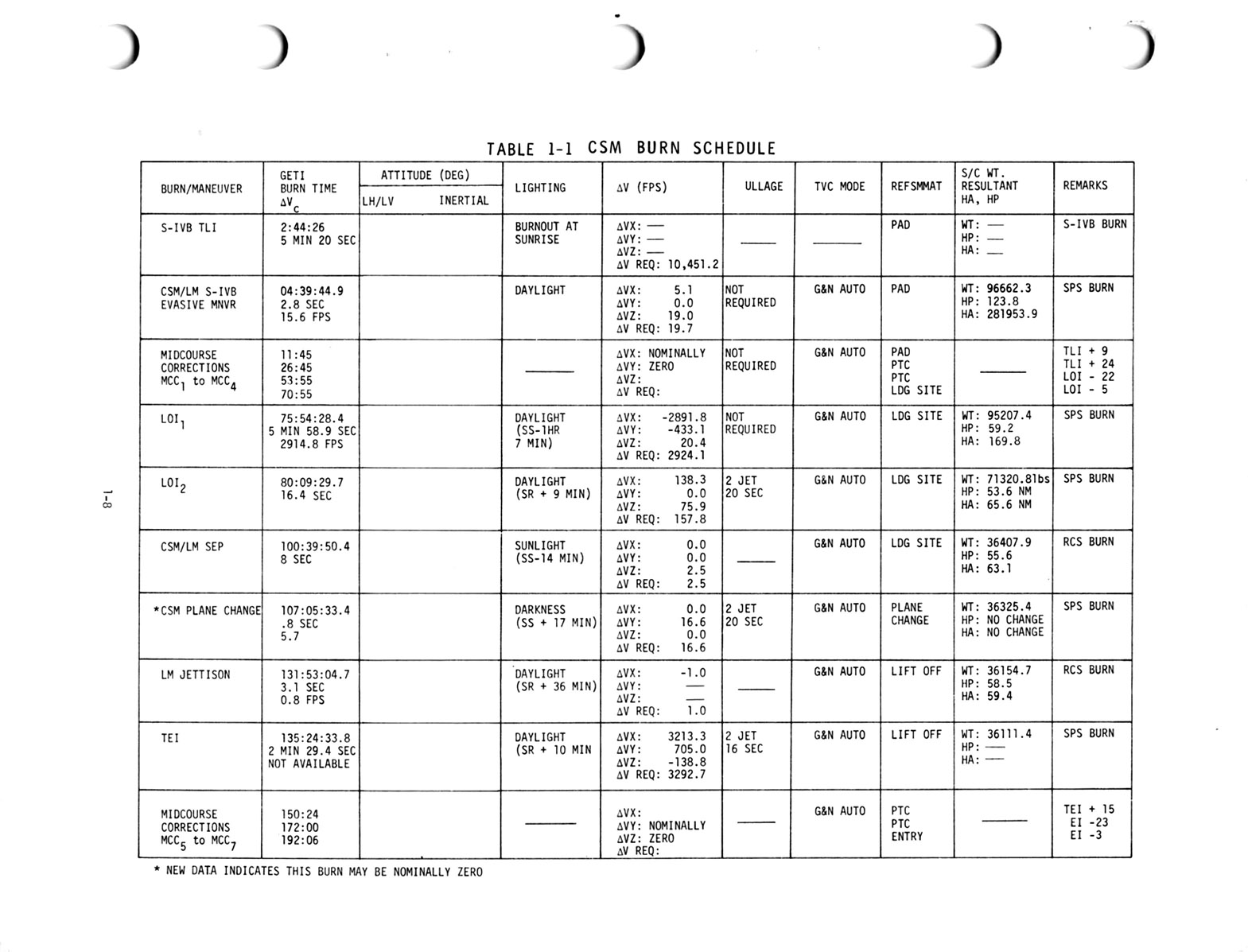 The Flight Plan presented here is not identical to that used on board but there are likely to be very few differences. These pages were derived from a PDF of a scan of the Flight Plan that was sent to the Honeysuckle Creek Tracking Station in Australia few days prior to the flight. The PDF was created by Colin Mackellar for the honeysucklecreek.net website and can be downloaded here.