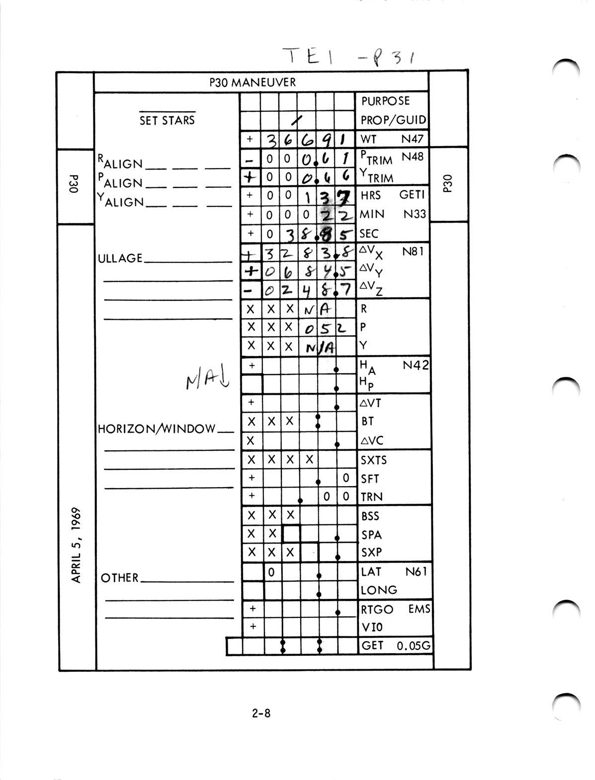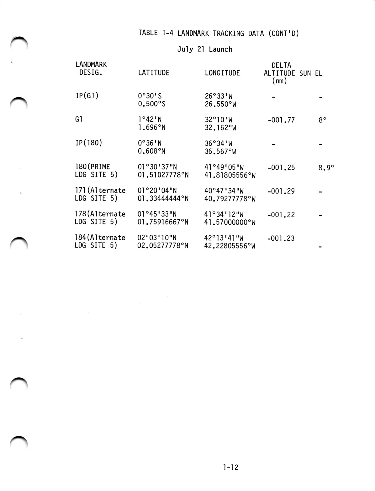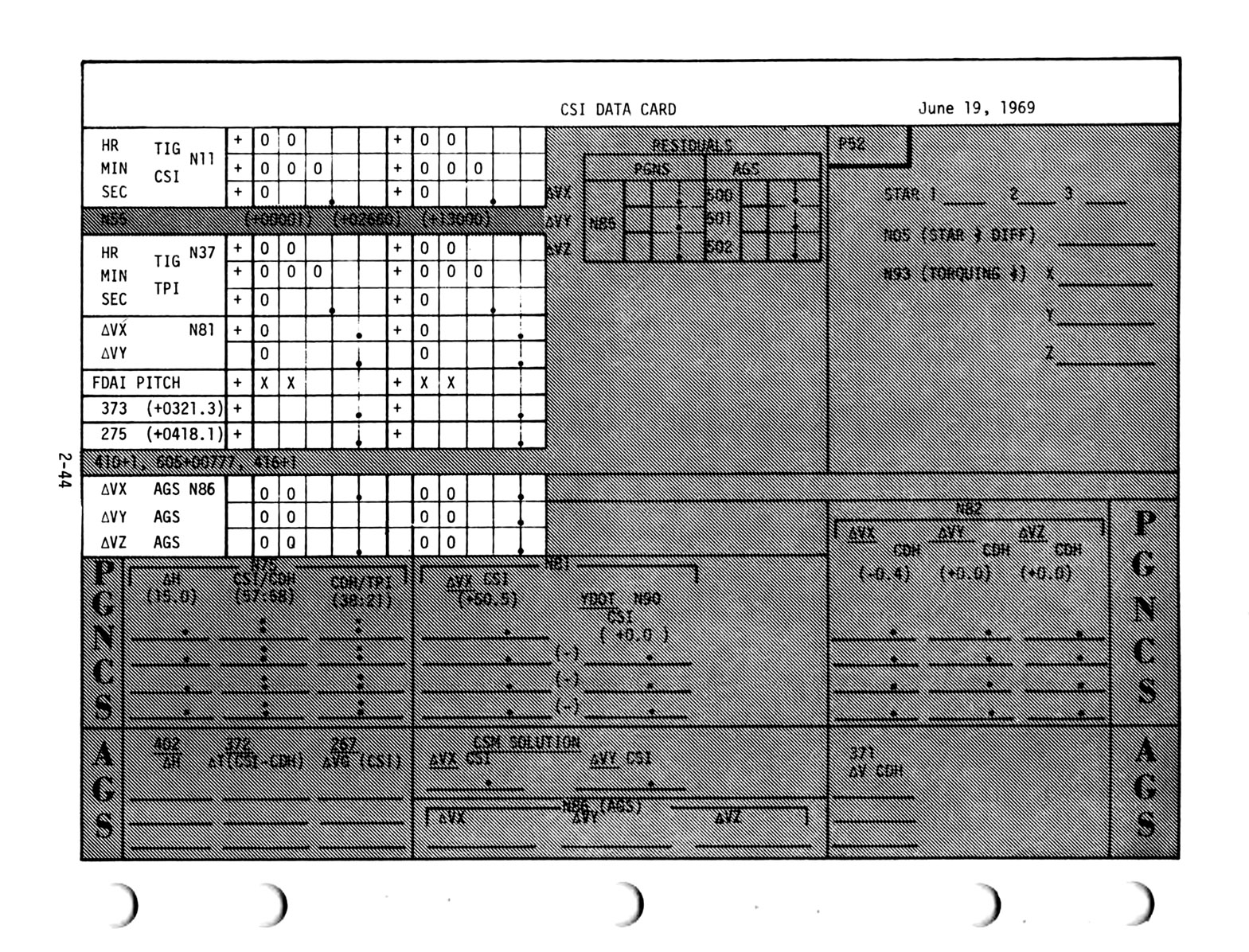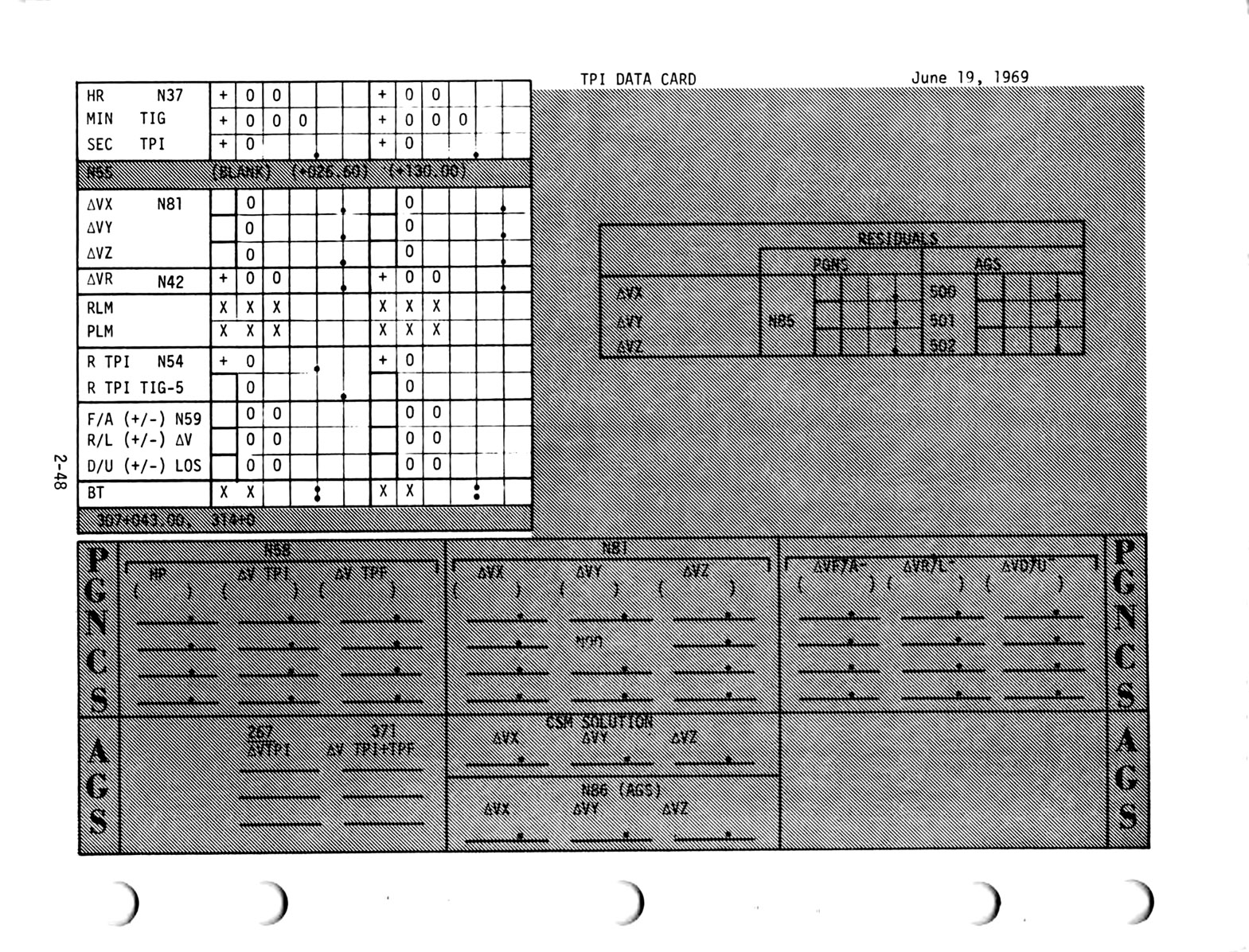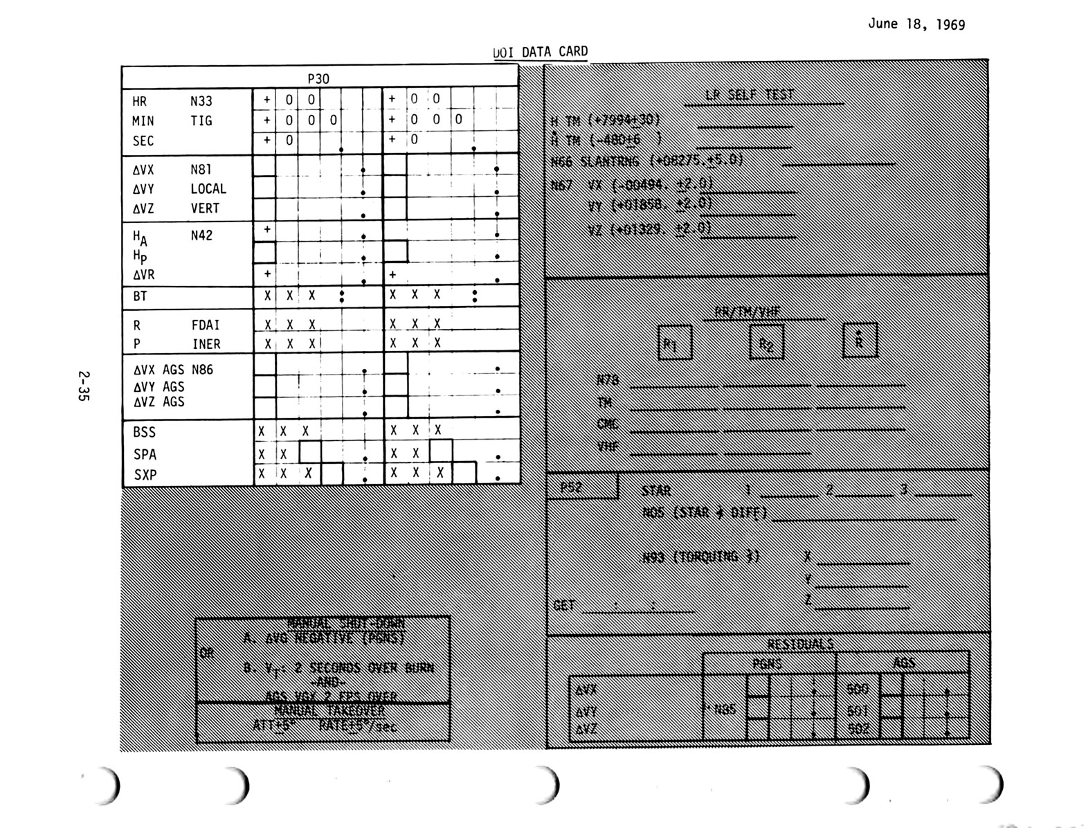 The Flight Plan presented here is not identical to that used on board but there are likely to be very few differences. These pages were derived from a PDF of a scan of the Flight Plan that was sent to the Honeysuckle Creek Tracking Station in Australia few days prior to the flight. The PDF was created by Colin Mackellar for the honeysucklecreek.net website and can be downloaded here.