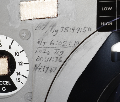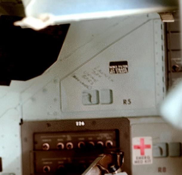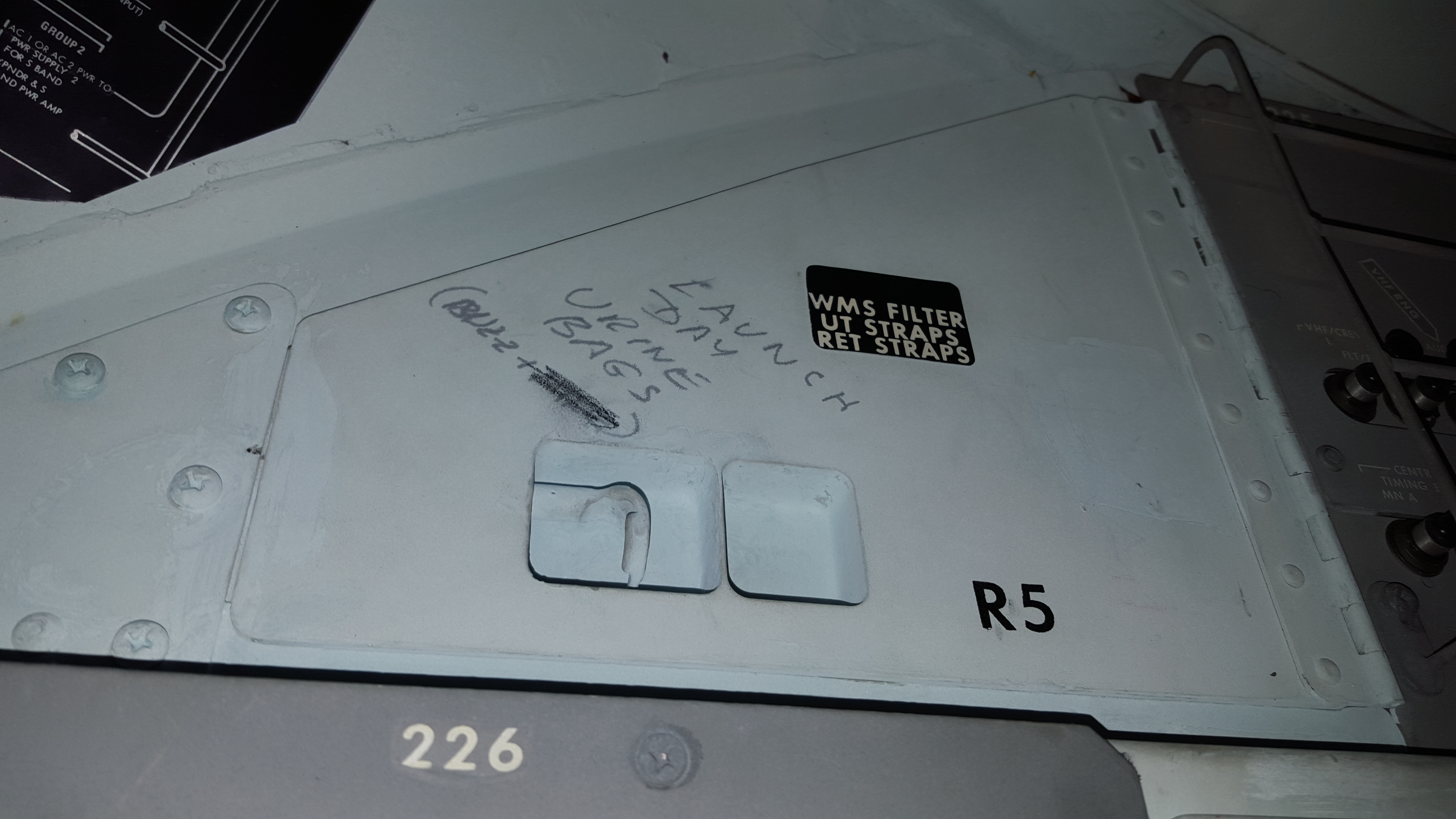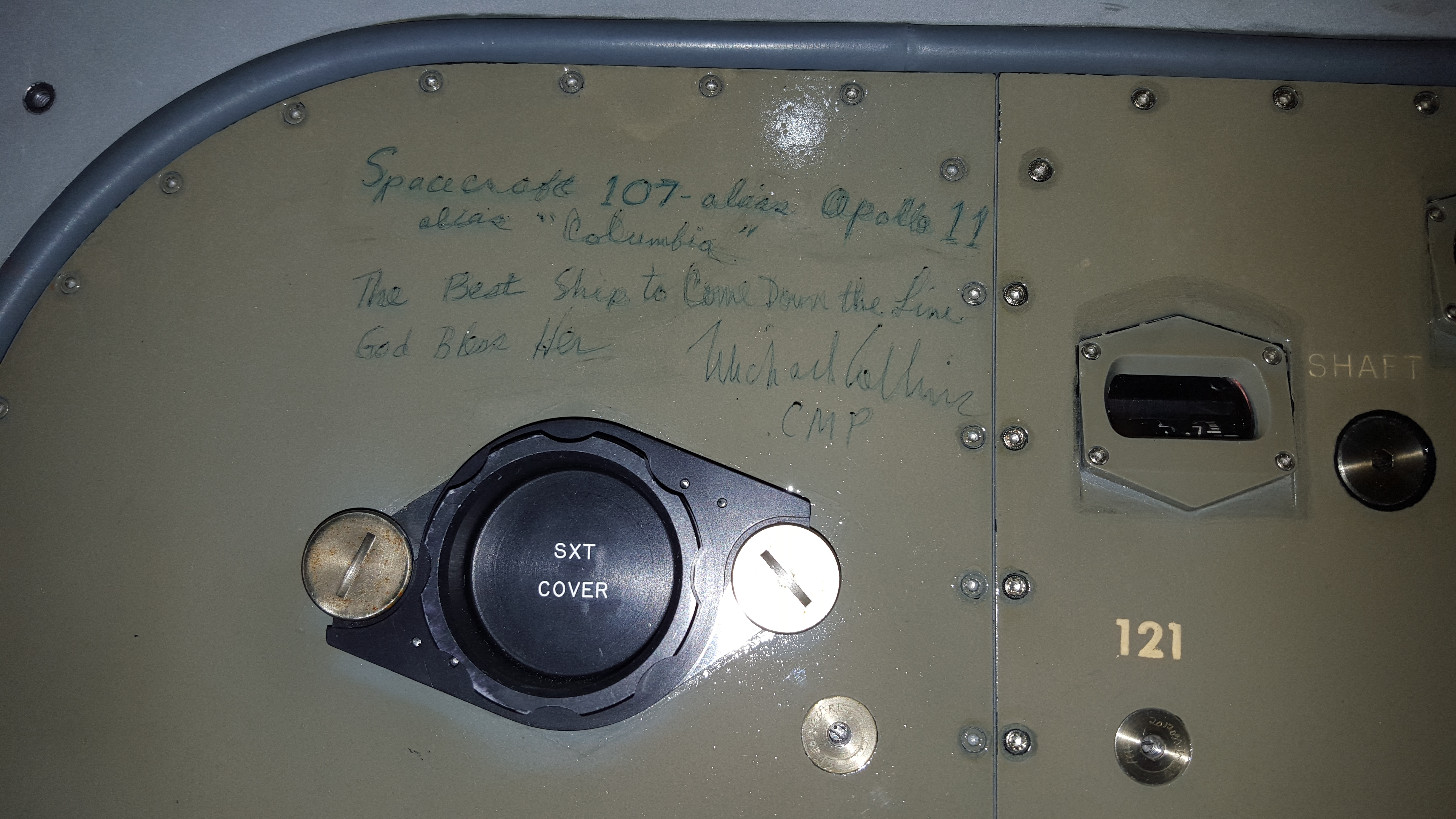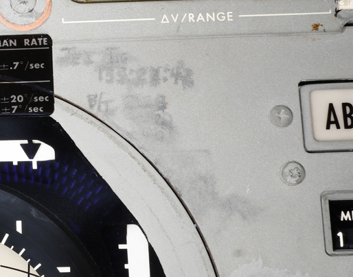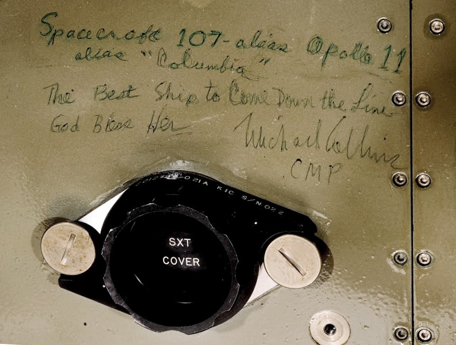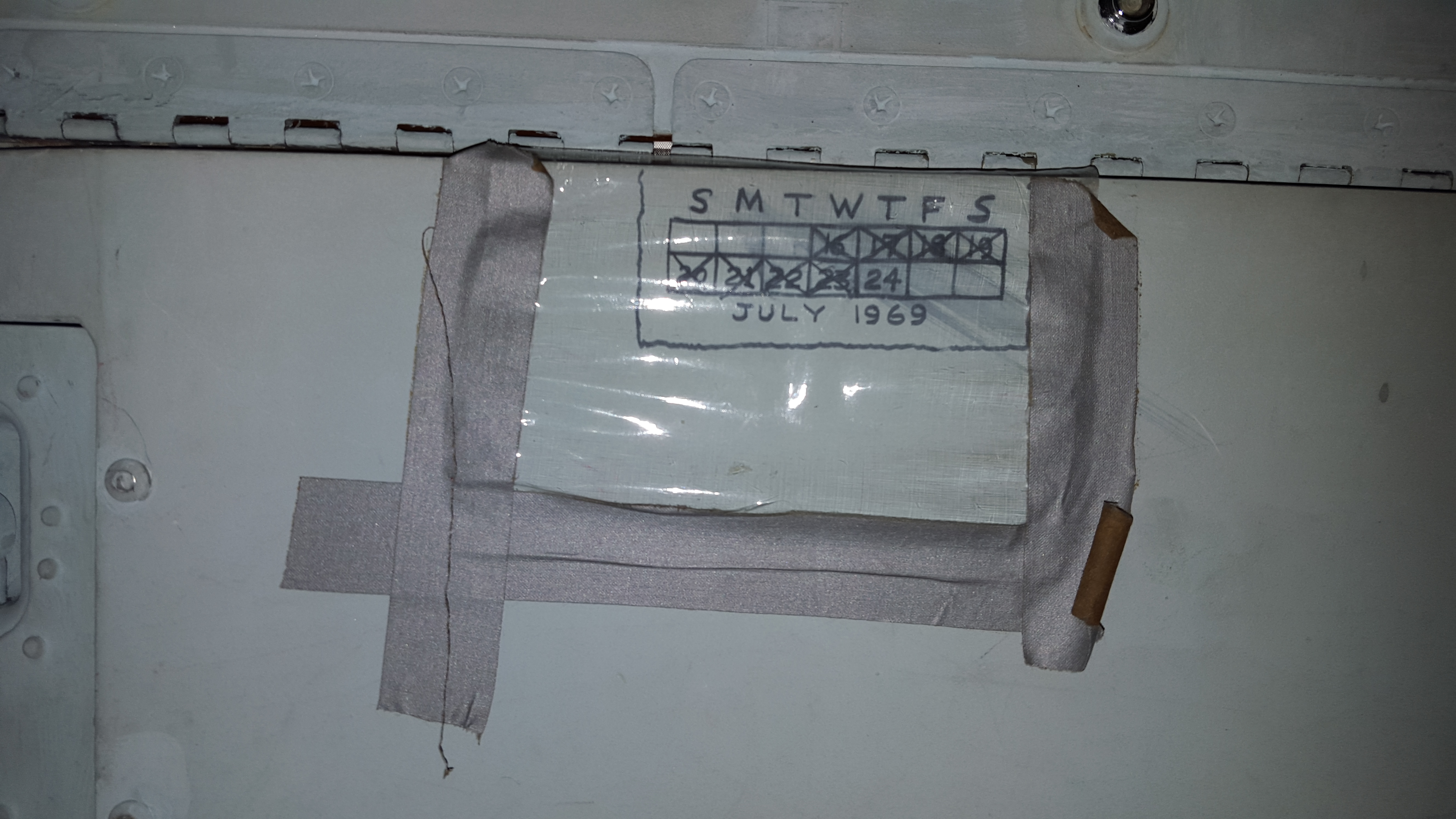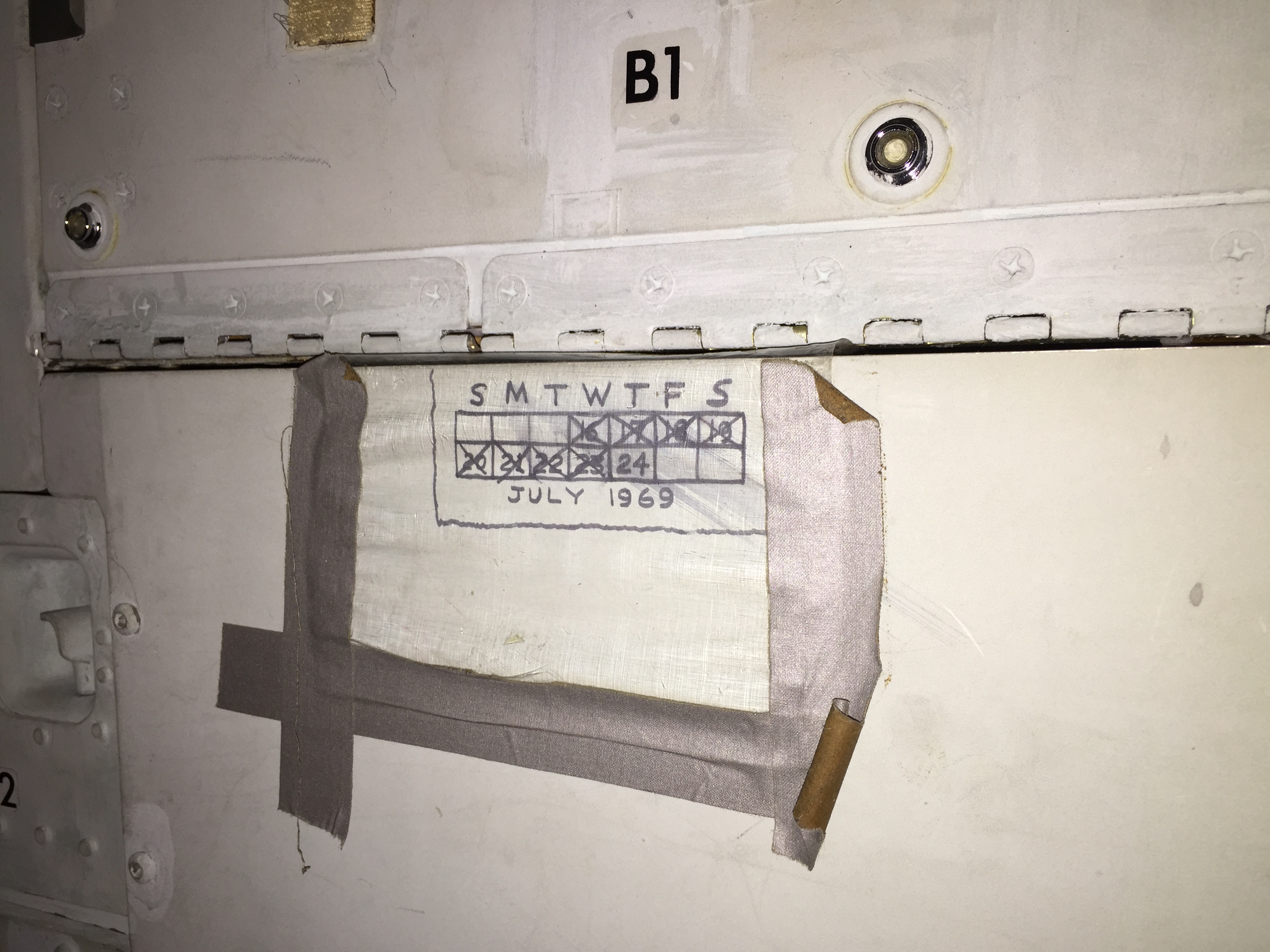 - Miscellaneous Notes -- These notes include two separate “caution” notes on the B1 and R5 locker doors; a hand-drawn “Jailhouse Calendar” below locker B1 and a tribute to the spacecraft, written on the sextant mount sometime post-flight by CMP Michael Collins.