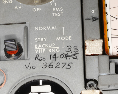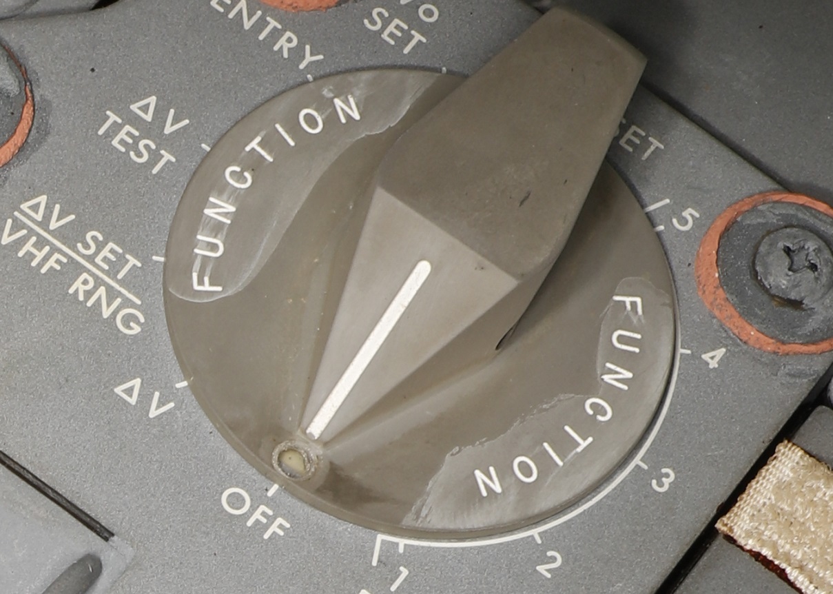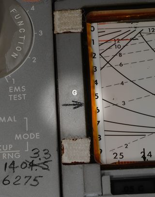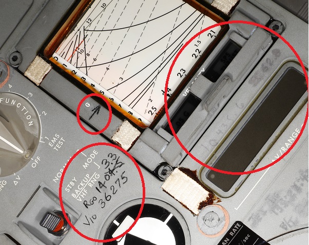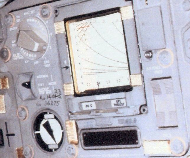 This change was reflected on the panel writing. The number represented the distance in nautical miles that the spacecraft was expected to travel from the beginning of the re-entry to landing. One of the counters within the EMS would be preloaded with this value. As the entry progressed, the counter’s display would decrease to indicate the ‘range to go’ throughout their passage through the atmosphere.