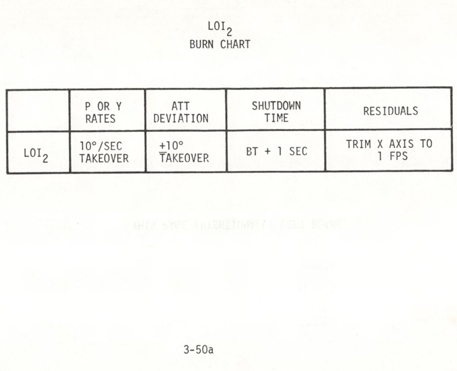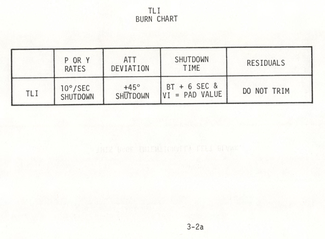 It was likely that the engine on the S-IVB stage would slightly under- or over-perform and this time was only a guide. The goal was to achieve a certain velocity. However, in case the S-IVB failed to automatically shut down, the crew had guide notes in the Flight Plan that told them when to force a manual shutdown. Page 3-2a (below) carried a table of actions that the crew should take if the TLI burn were to go awry. One item told them that if the burn were to continue for 6 seconds beyond the time given in the PAD, they should manually shut it down.