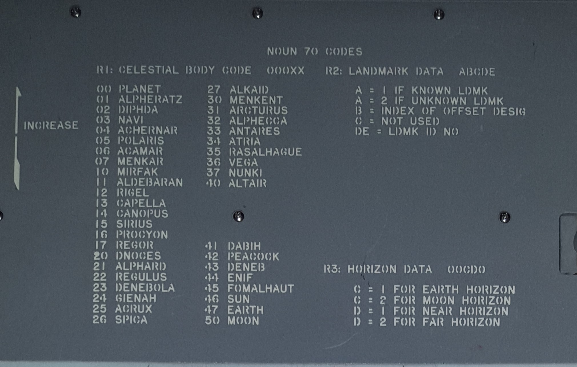 The top two numbers in each cluster are codes for the two stars used. These codes allowed the computer to know which stars were being used for the exercise. A catalogue of 37 bright, well-distributed stars had been programmed into the computer’s memory along with their precise positions. NASA had helpfully affixed a table of all these stars directly below the eyepieces for the optics.