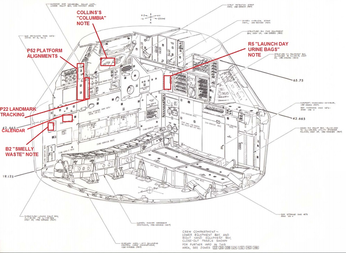 A cut-away diagram of the Command Module Crew Compartment showing the locations of the handwritten notes described in this entry.