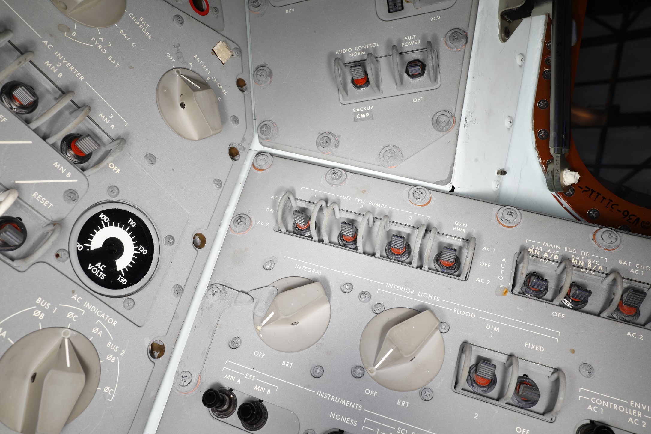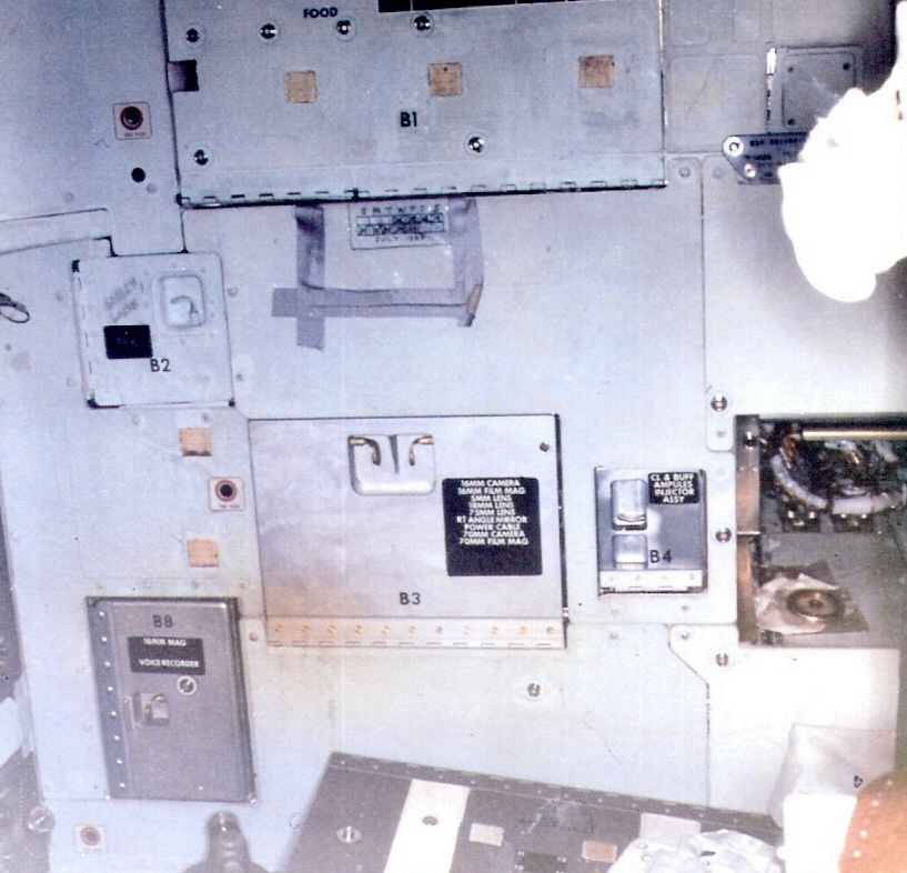 The LEB is the location of the spacecraft’s navigational equipment consisting of a computer, an inertial platform, both of which were hidden behind panels, and an optical system that allowed navigational sightings on stars and landmarks. This area was therefore often occupied by the Command Module Pilot (CMP) who acted as the spacecraft’s navigator. It also acted as a semi-private area for bodily functions as well as having storage compartments behind doors.