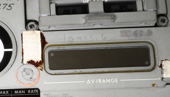 Above the ΔV/Range display are two numbers, one of which is partially obscured. The first is 10435.6. This was an estimate of the change in velocity (or ΔV) that was to be imparted by the Saturn's S-IVB stage during the TLI burn. It had been deliberately biased to suit the characteristics of the EMS systems. The value was entered into the 'counter' display directly below.