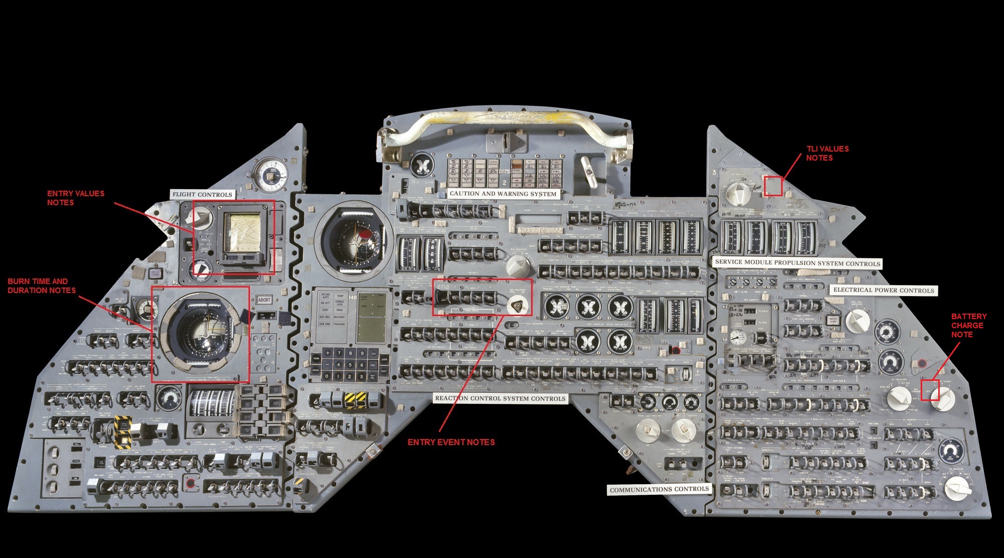 Notes were found in two general locations; in the Lower Equipment Bay (LEB) and on the Main Display Console (MDC), the large, semi-circular instrument panel that straddled the cabin in front of the crew couches. This should come as no surprise as both areas were the focus of intense operational activity throughout the mission.