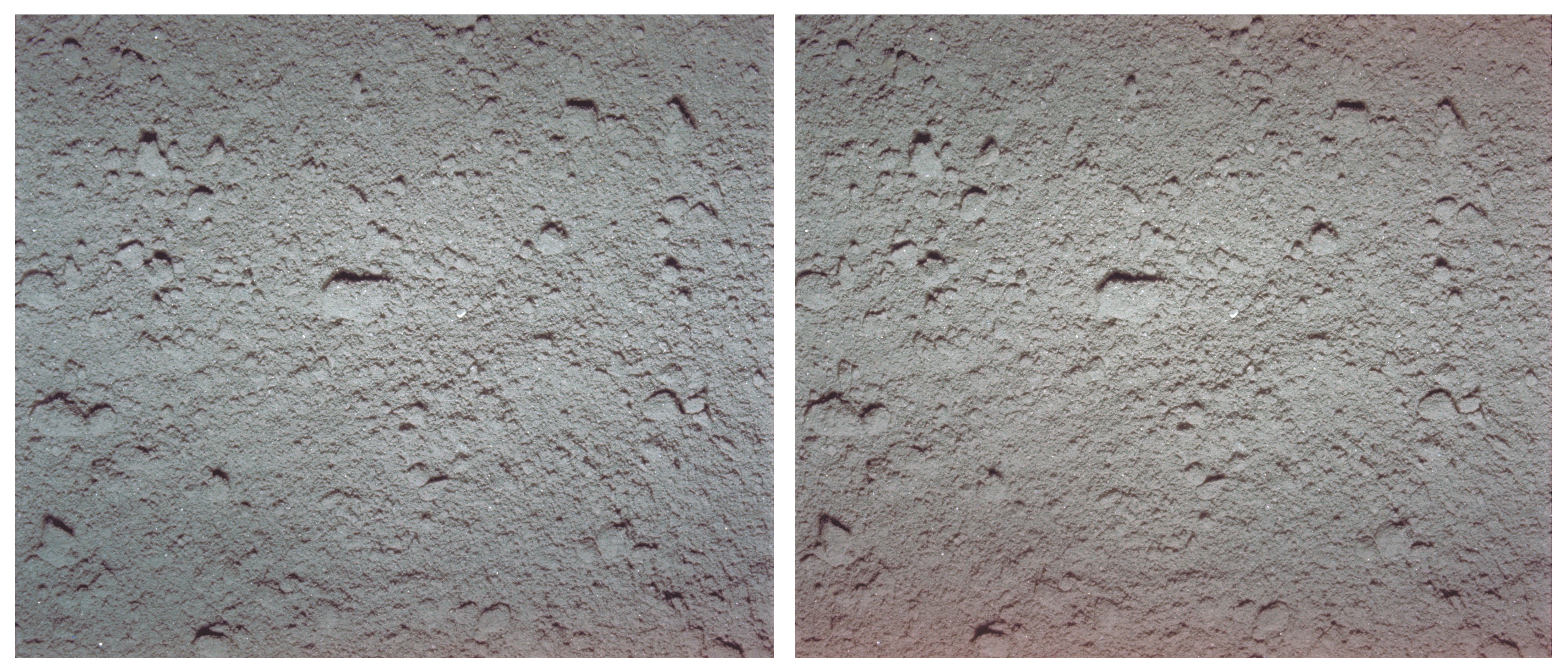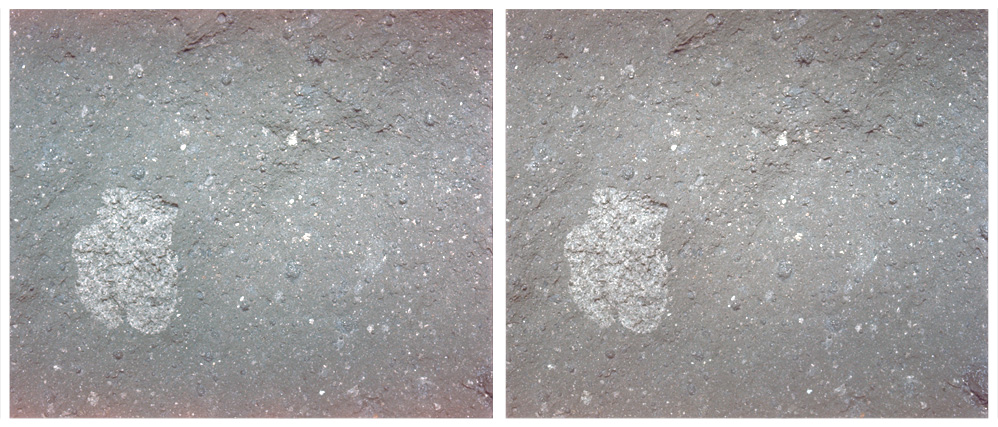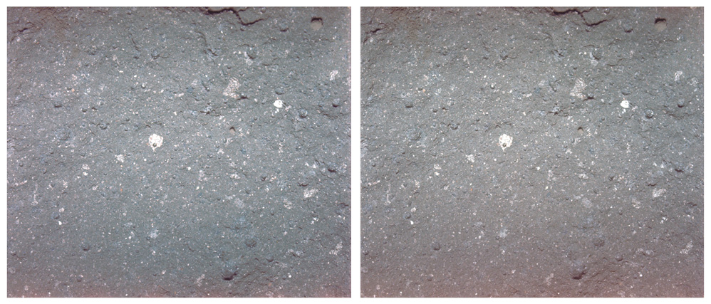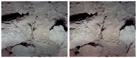 AS11-45-6710 Browse or print resolution. Stereo image of lunar surface. Surface of lunar rock with embedded 20-mm clast. The surface has many small pits from micrometeoriod impact. Approx field of view is 72 mm by 83 mm. Image credit: NASA/JSC/ASU |