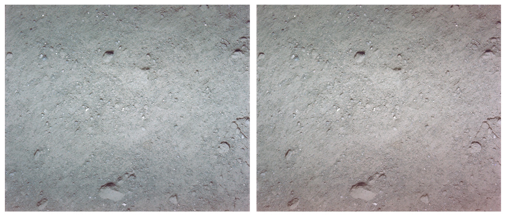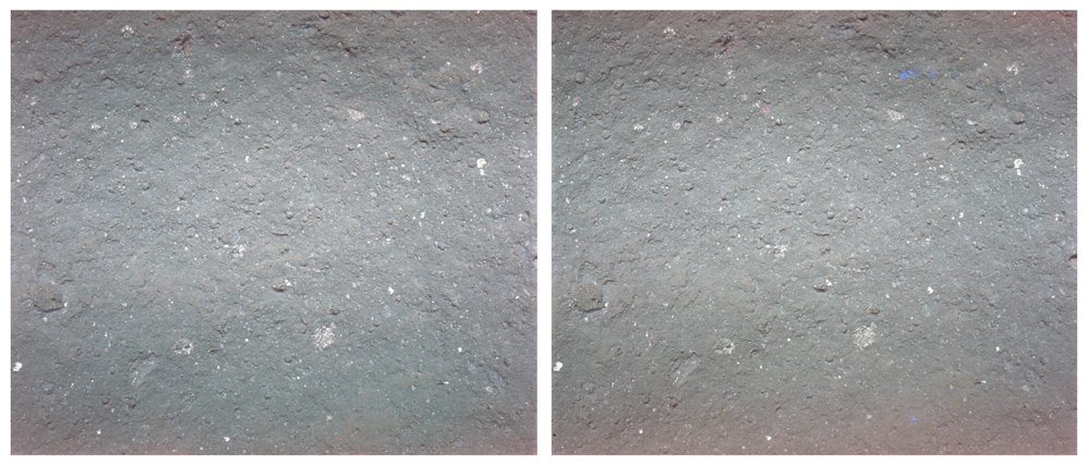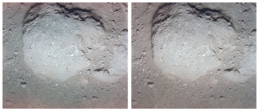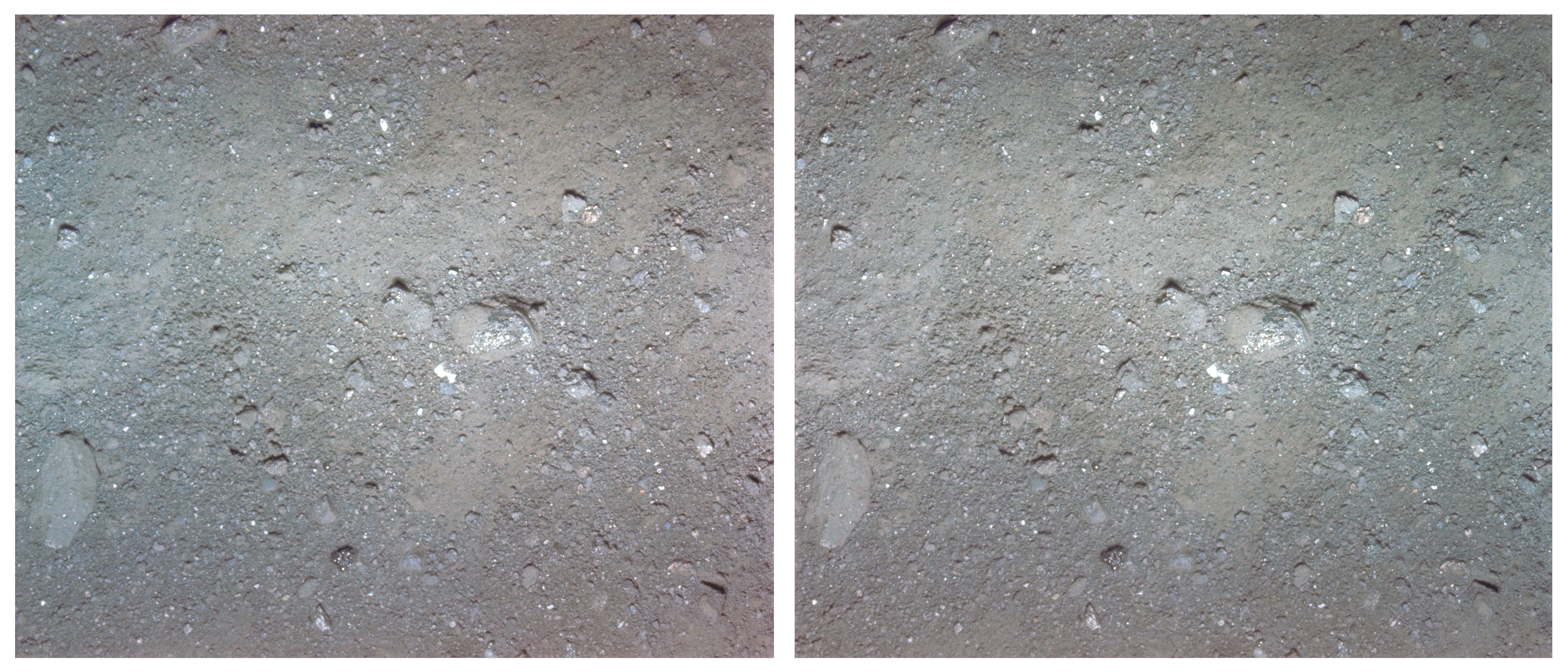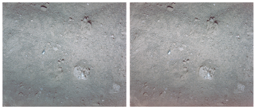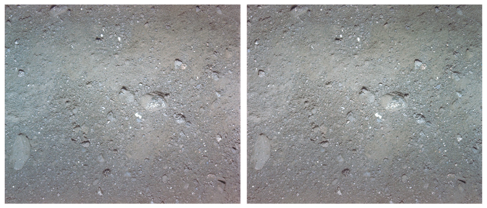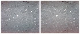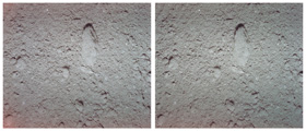 AS11-45-6705 Browse or print resolution. Stereo image of lunar surface. The larger object is about 13 mm across and has been splashed with molten material that has frozen to a glassy finish. Approx field of view is 72 mm by 83 mm. Image credit: NASA/JSC/ASU |