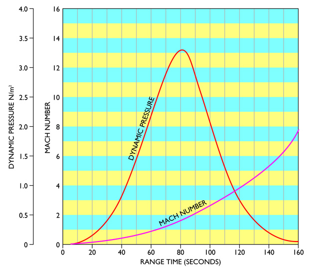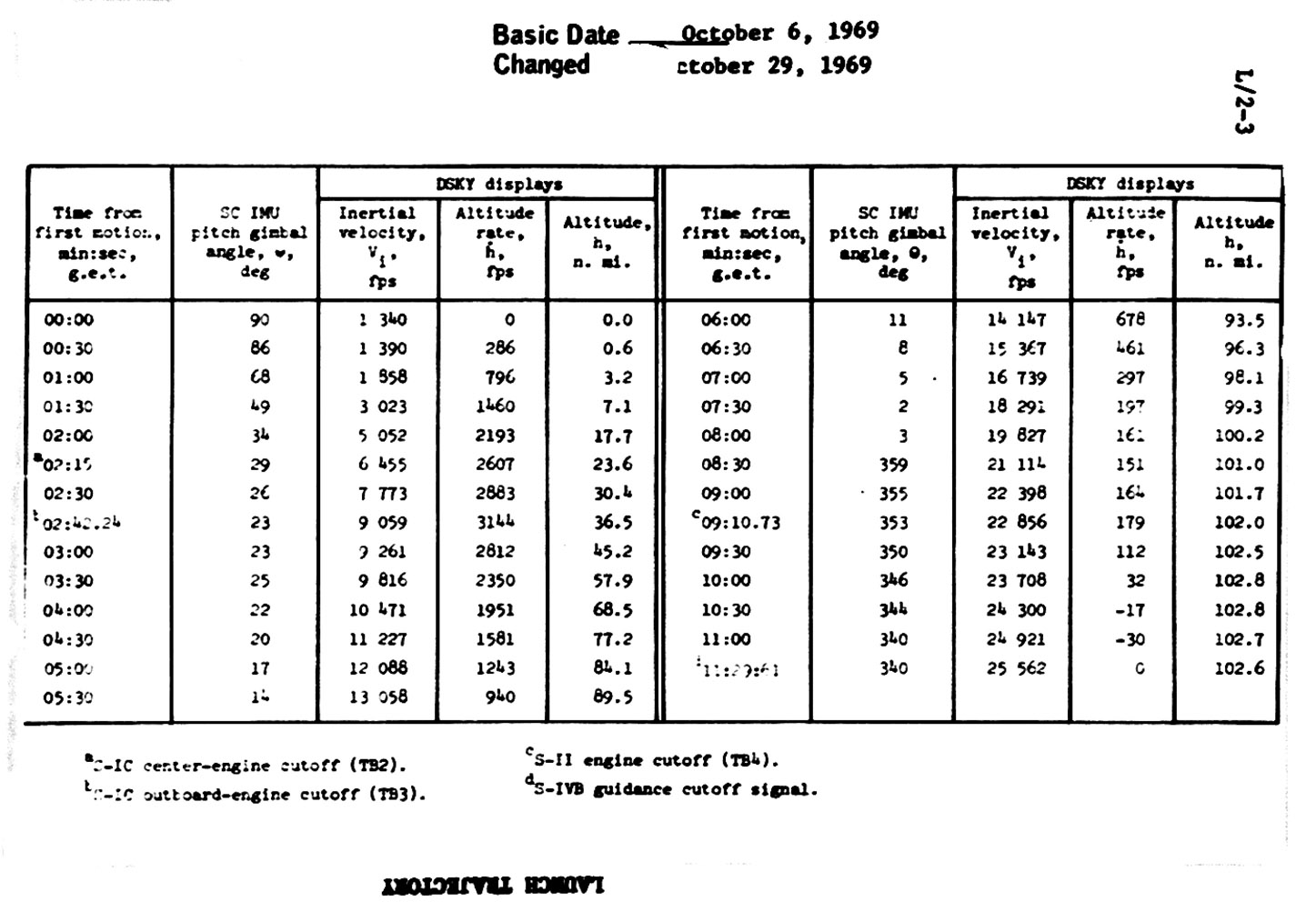 Velocity is 23,000 feet per second [7,000 m/s]. Down range 967 [nautical] miles [1,791 km]. Altitude 102 [nautical] miles [189 km].