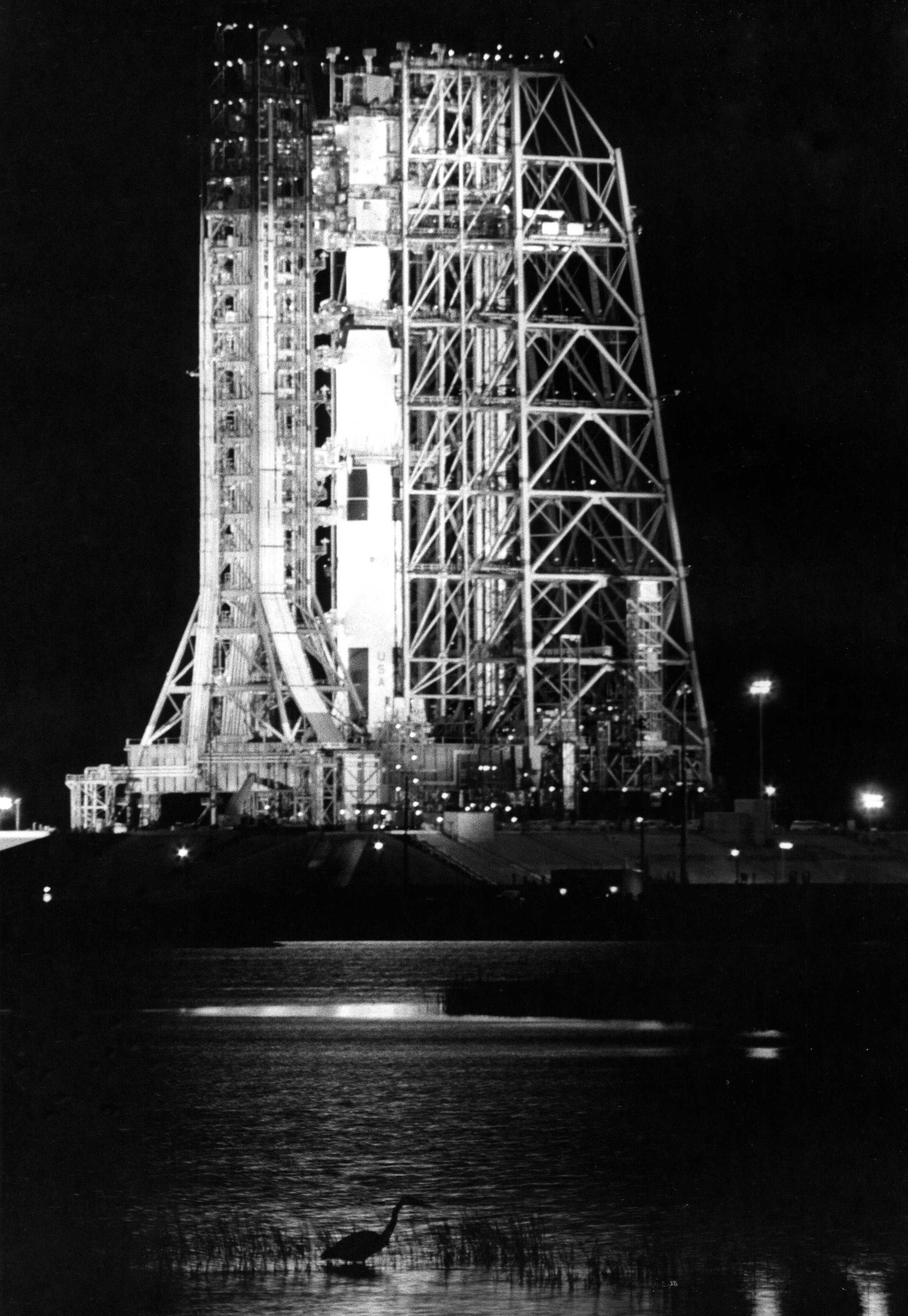 The Apollo 12 space vehicle photographed the night before launch with the Mobile Service Structure just prior to being taken to its parking site.
