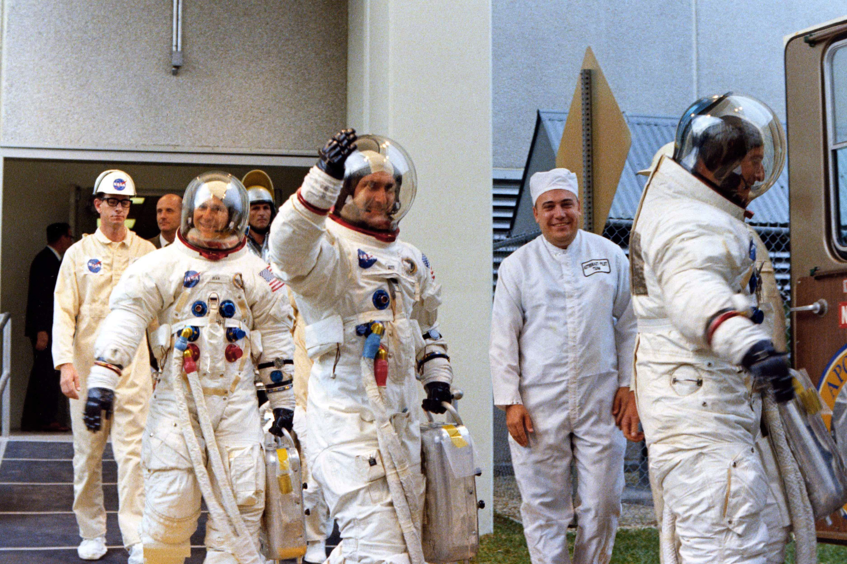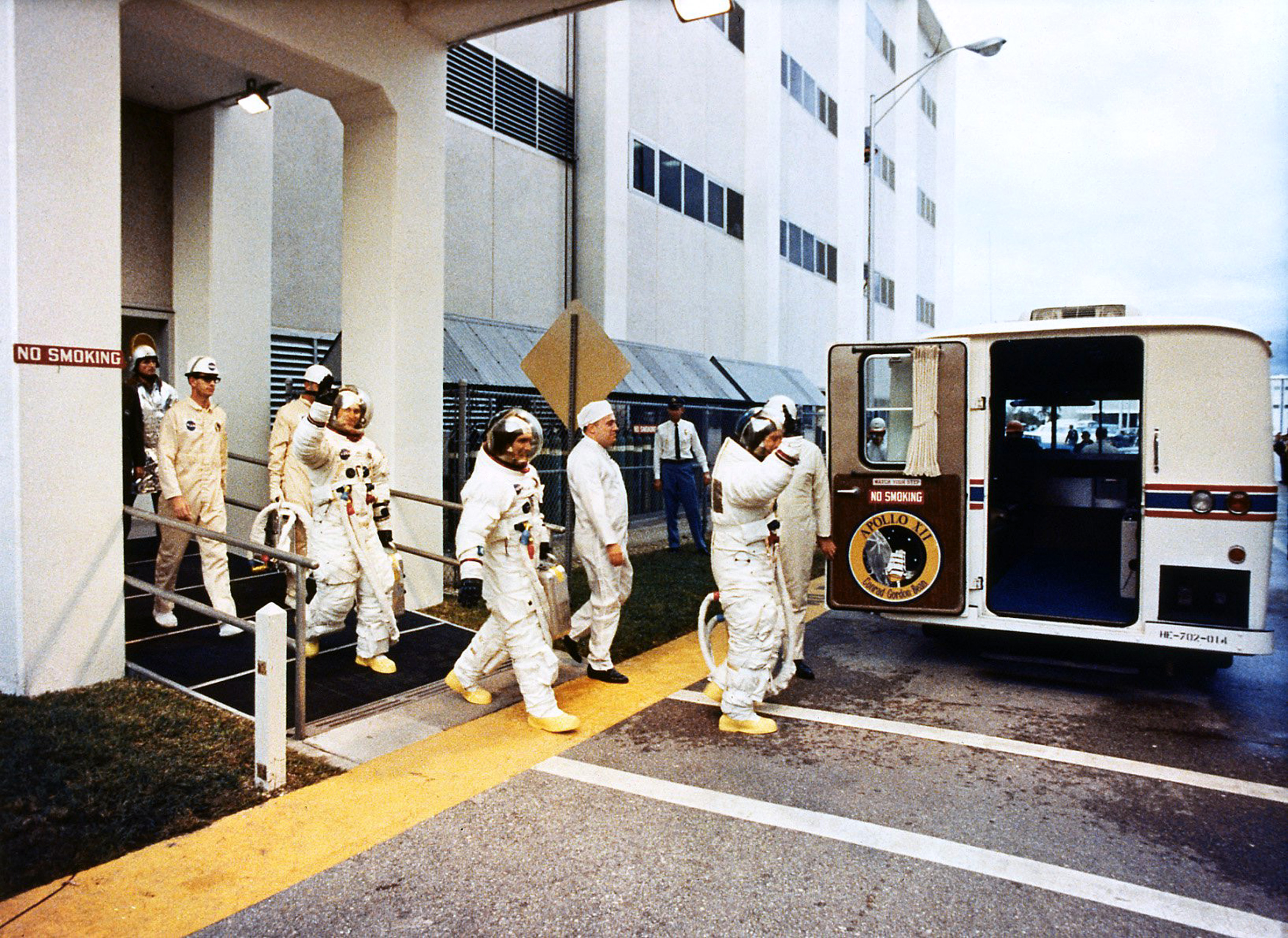 The Apollo 12 crew leave the Manned Spacecraft Operations Building to board the transfer van that will take them to the launch pad. Pete Conrad is at the front, followed by Dick Gordon and Alan Bean.