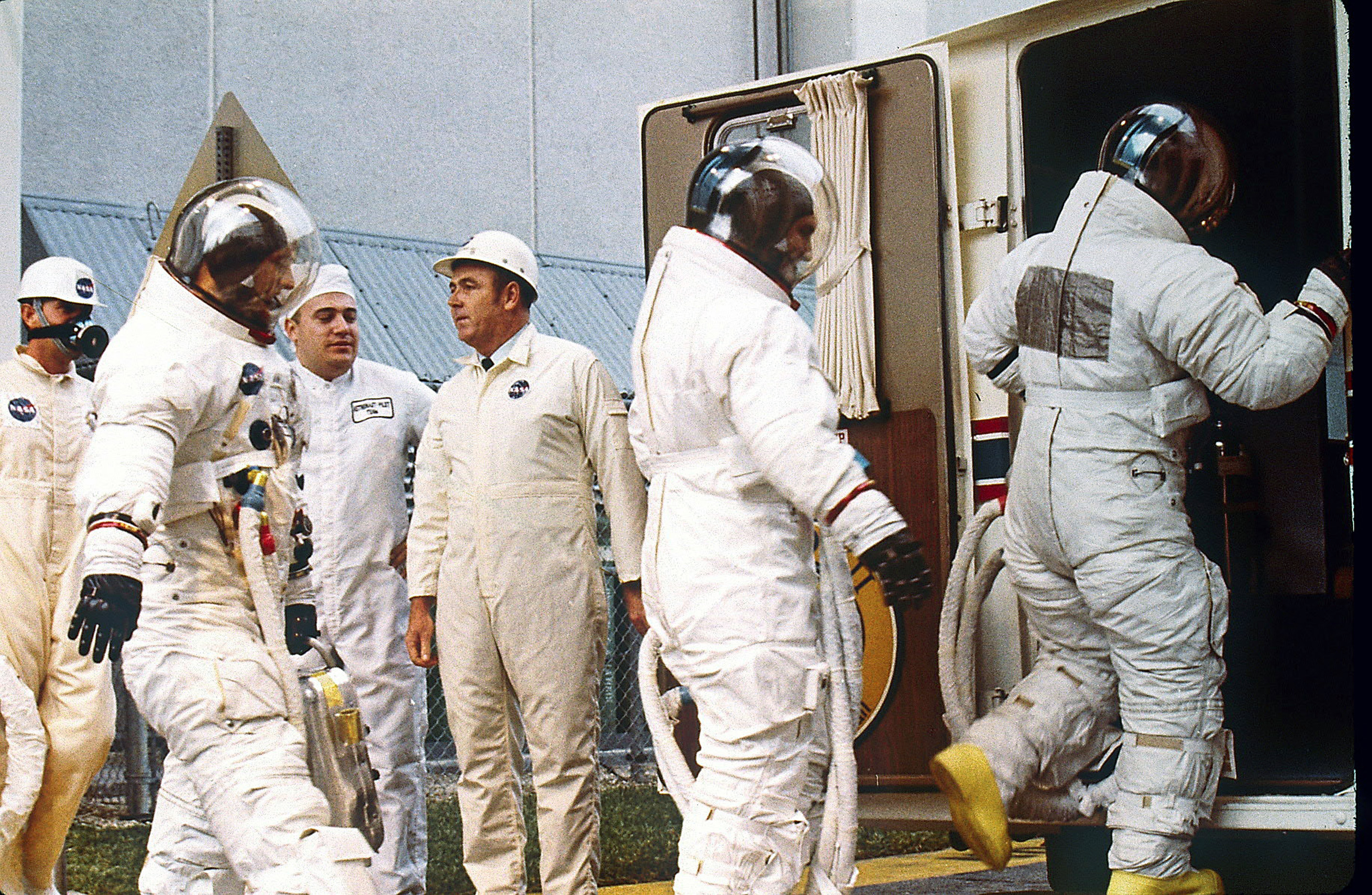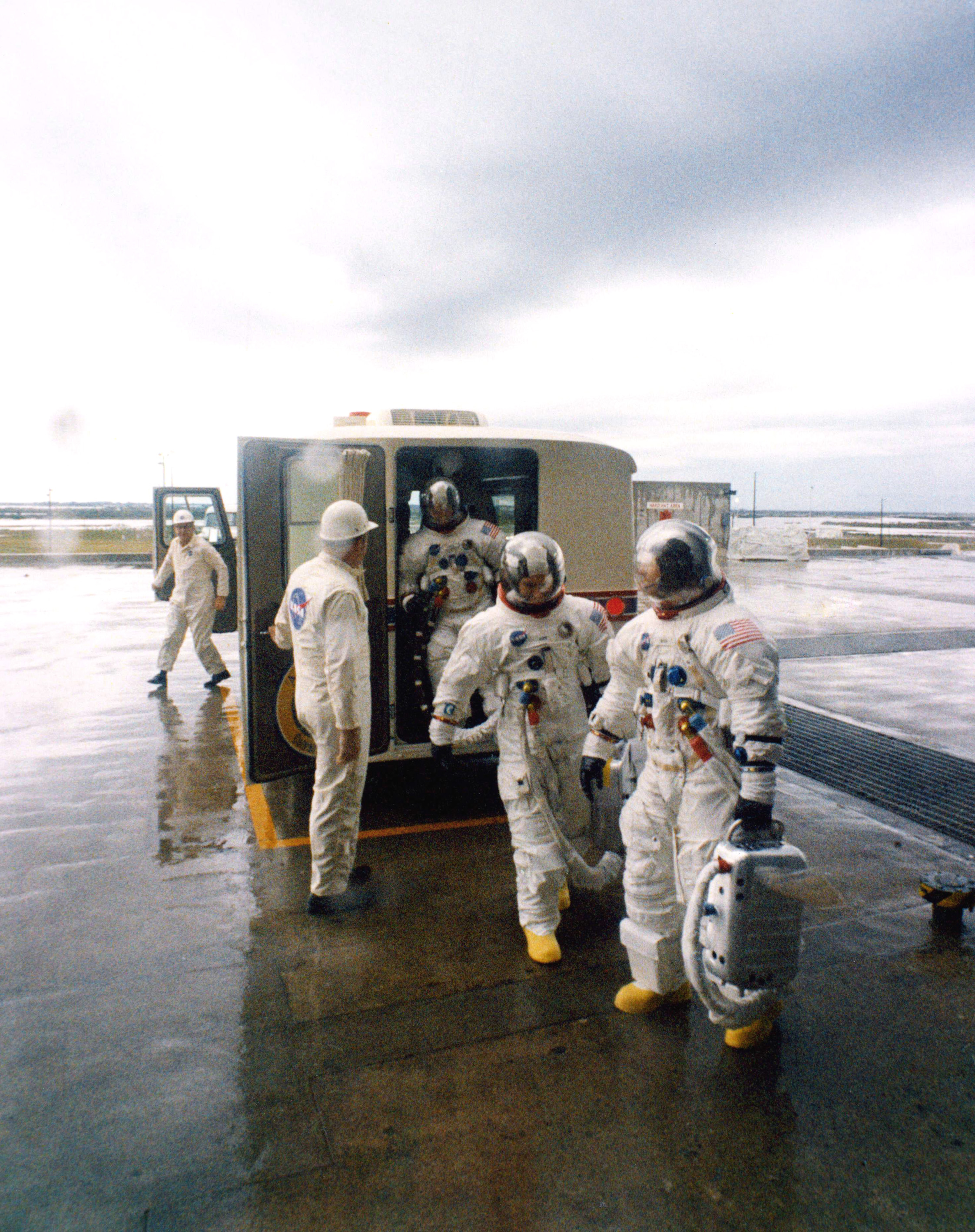 The Apollo 12 crew exit the transfer van at a wet Pad 39-A. Pete Conrad is at the front, followed by Dick Gordon and Alan Bean.