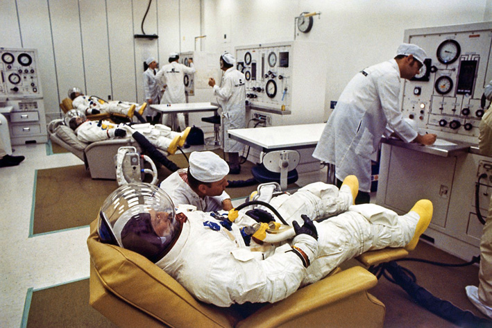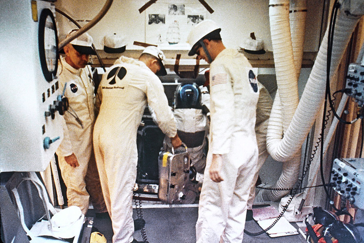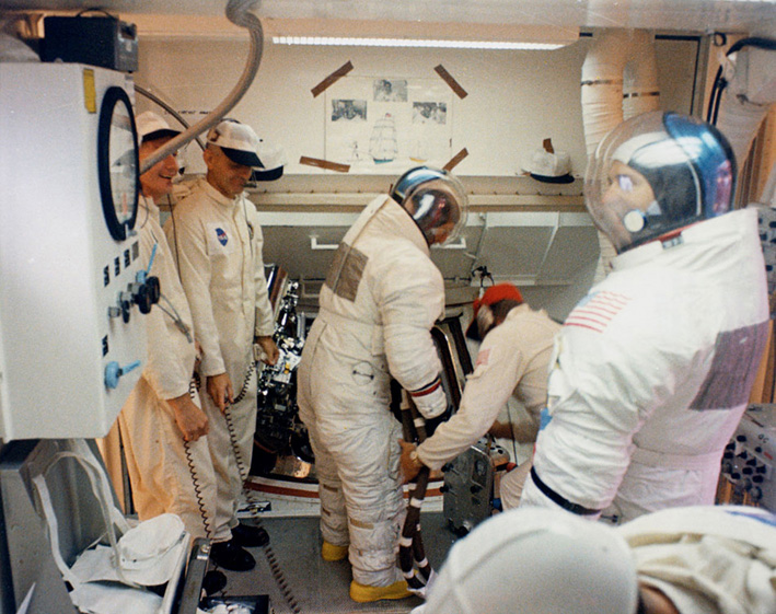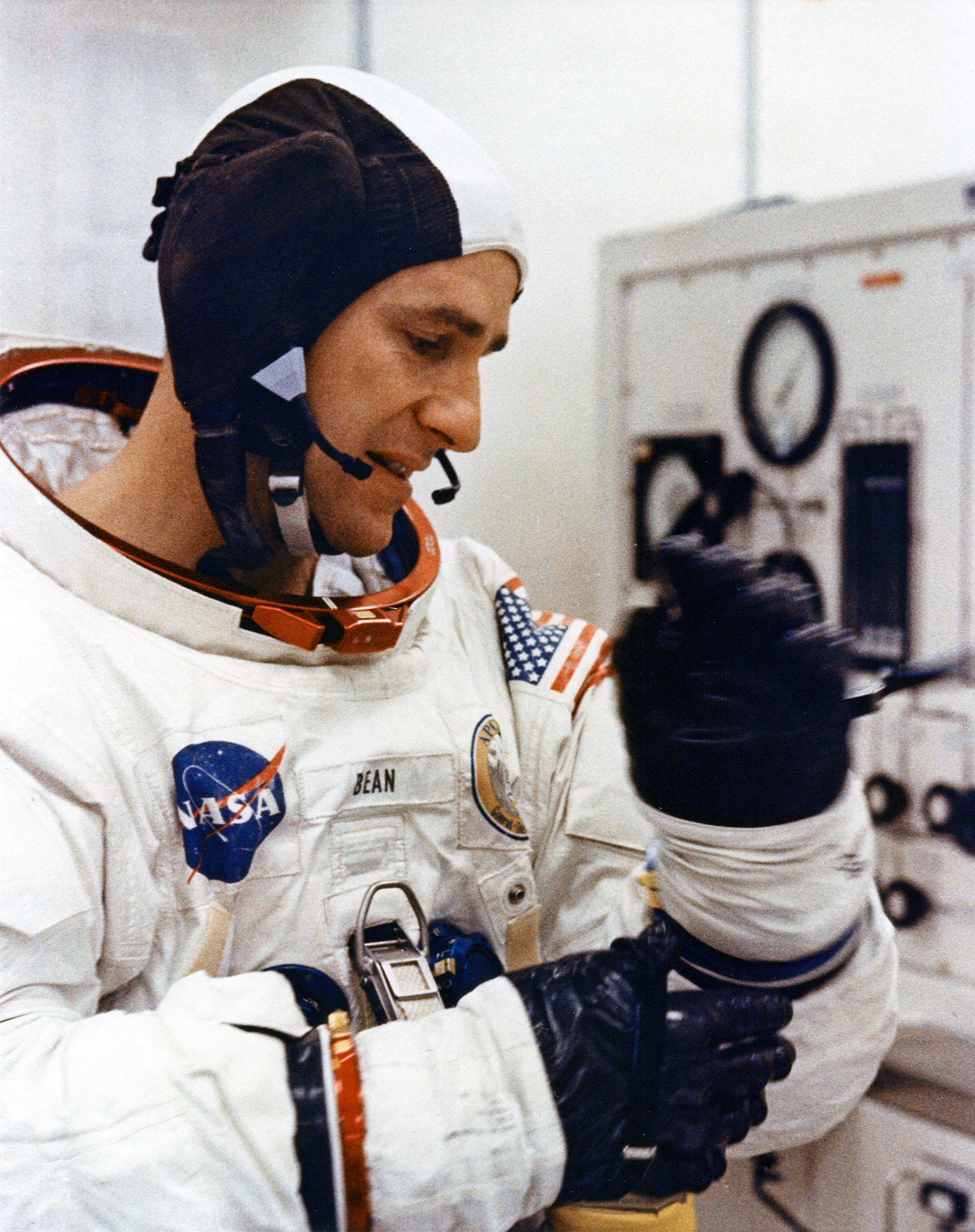 Apollo 12 Lunar Module Pilot Alan Bean in the suit room.