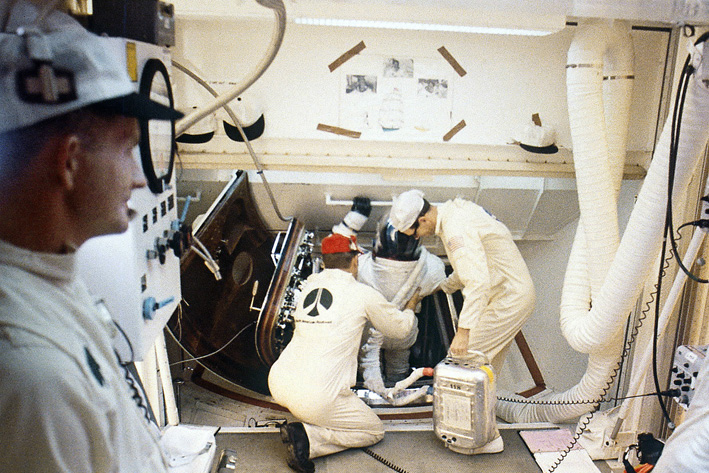 Dick Gordon is aided from the White Room toward the centre couch of the Apollo 12 spacecraft.