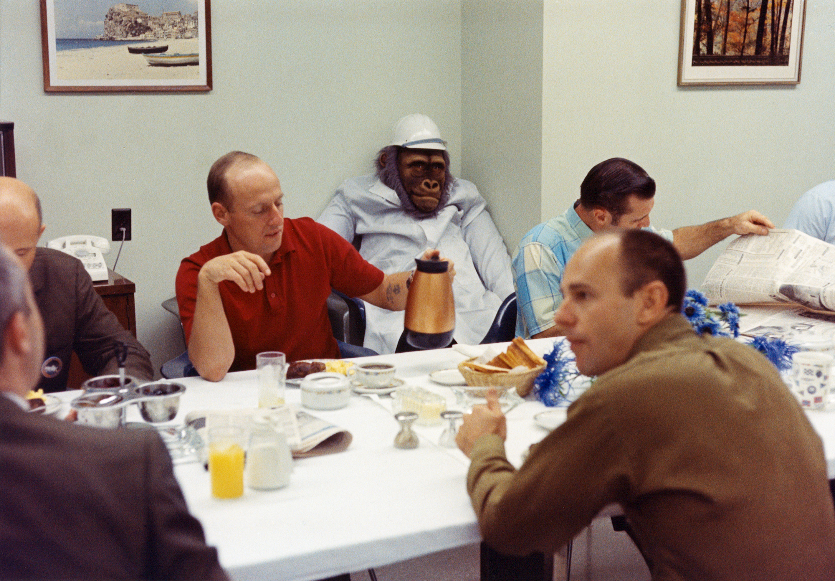 The Apollo 12 crew and guests at breakfast on the morning of launch. Far side: Tom Stafford, Pete Conrad, Dick Gordon, unknown (probably Chuck Tringali). Near side: Jim McDivitt, Allan Bean, Paul Weitz. Note the mascot seated against the far wall.