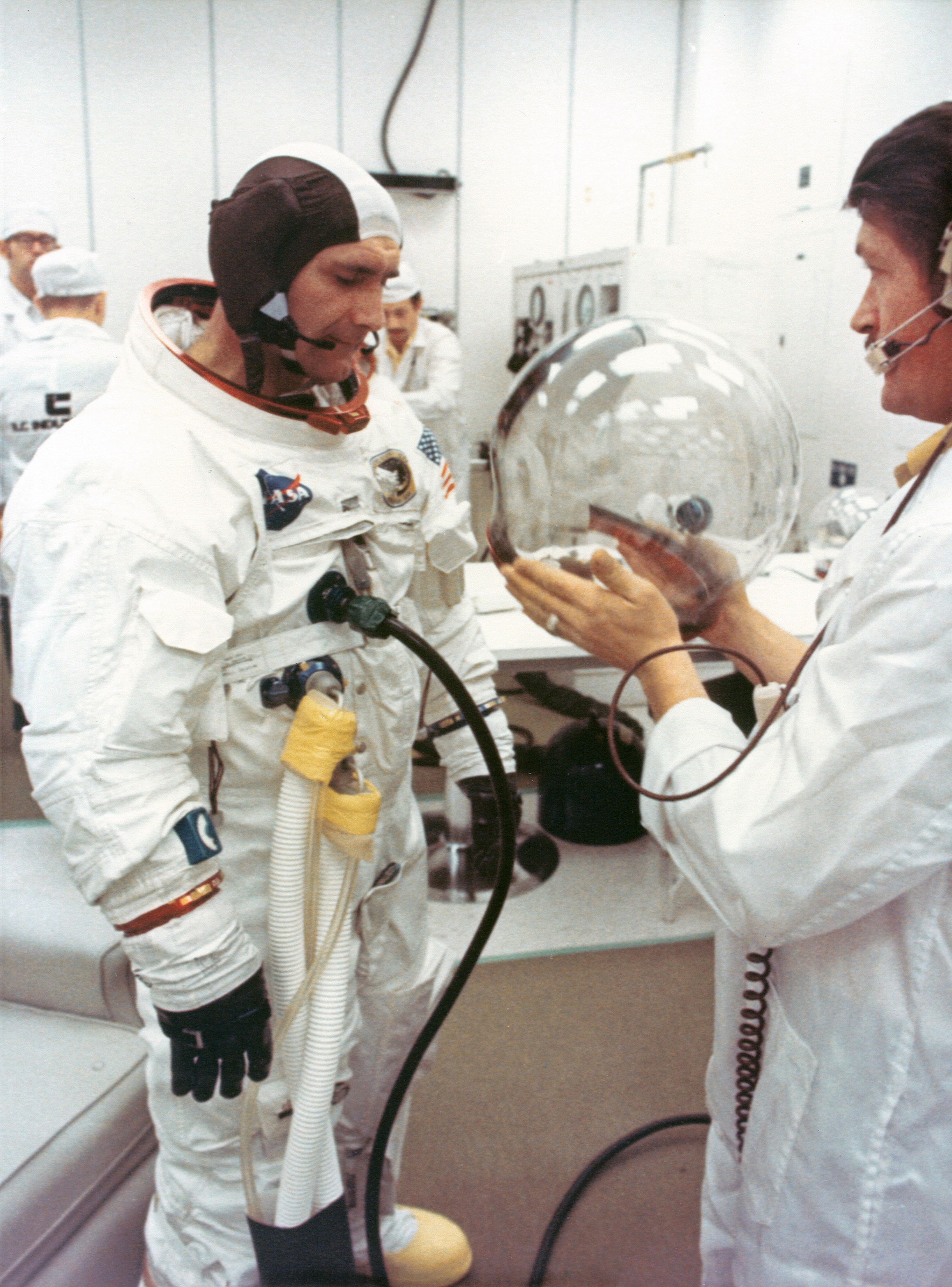 Apollo 12 Command Module Pilot Dick Gordon in the suit room with his helmet.