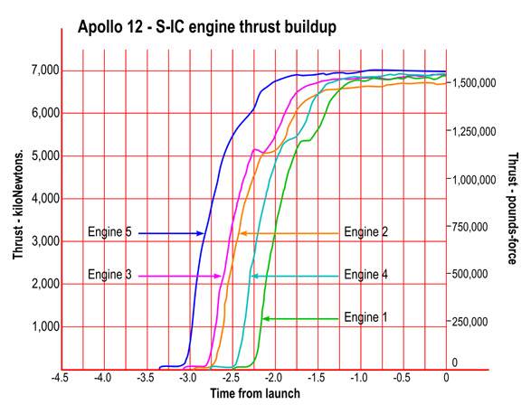 Graph of the thrust of the five F-1 engines during their start-up period. Derived from page 5-3 of the AS-507 (Apollo 12) Flight Evaluation Report