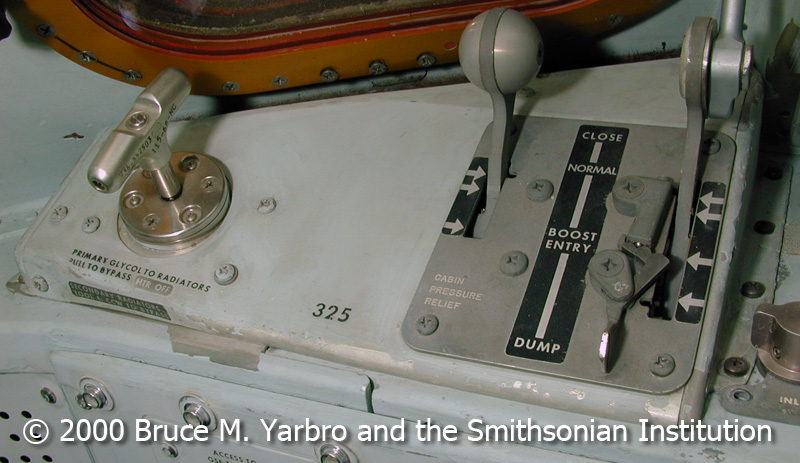 The handle for bypassing the spacecraft's radiators is on the left of this image taken within Odyssey's cabin.
