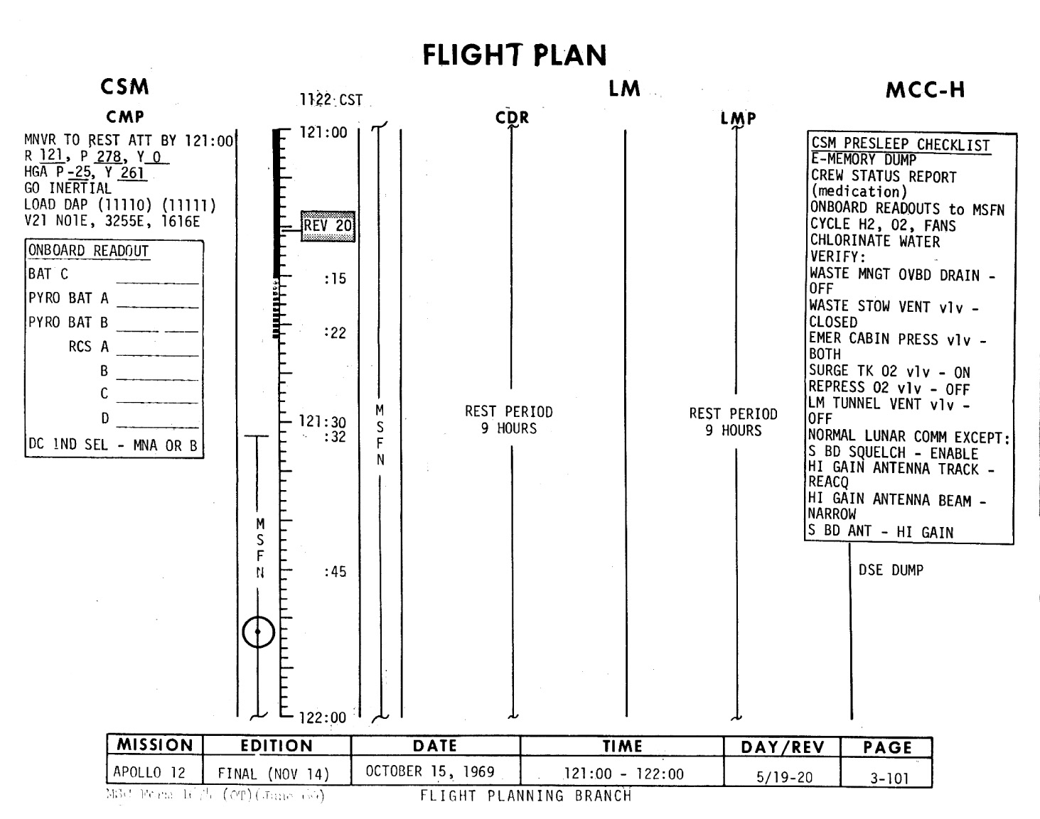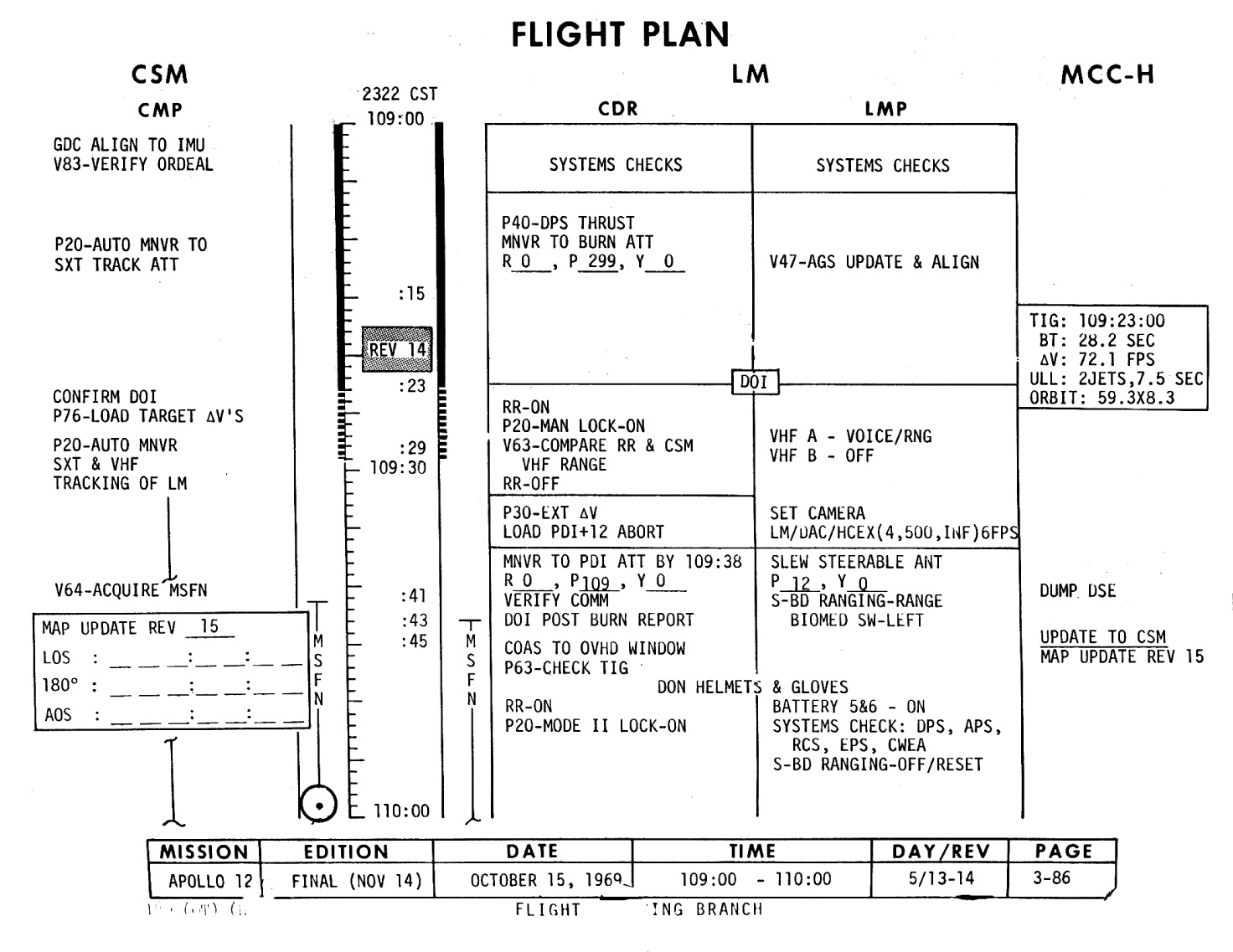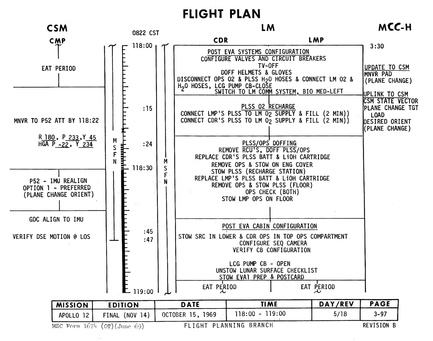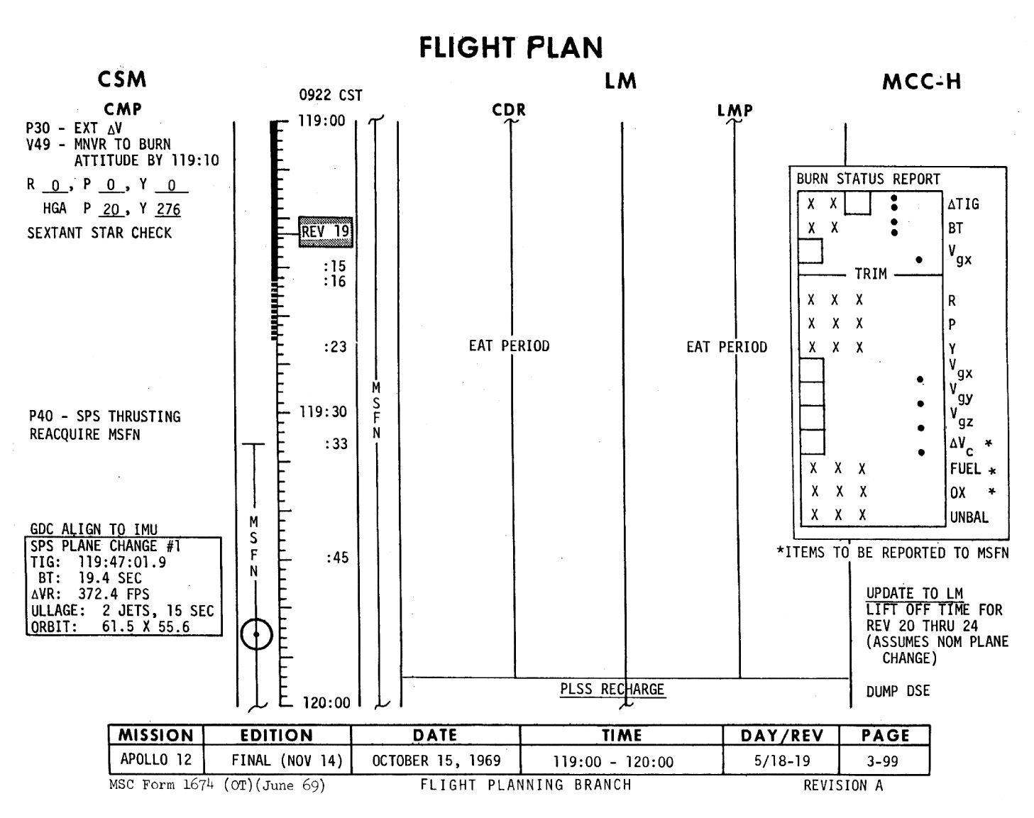 119:50:29 Gibson: Intrepid, plane change burn was good, and we show that you're about 1.15 behind in the Flight Plan.