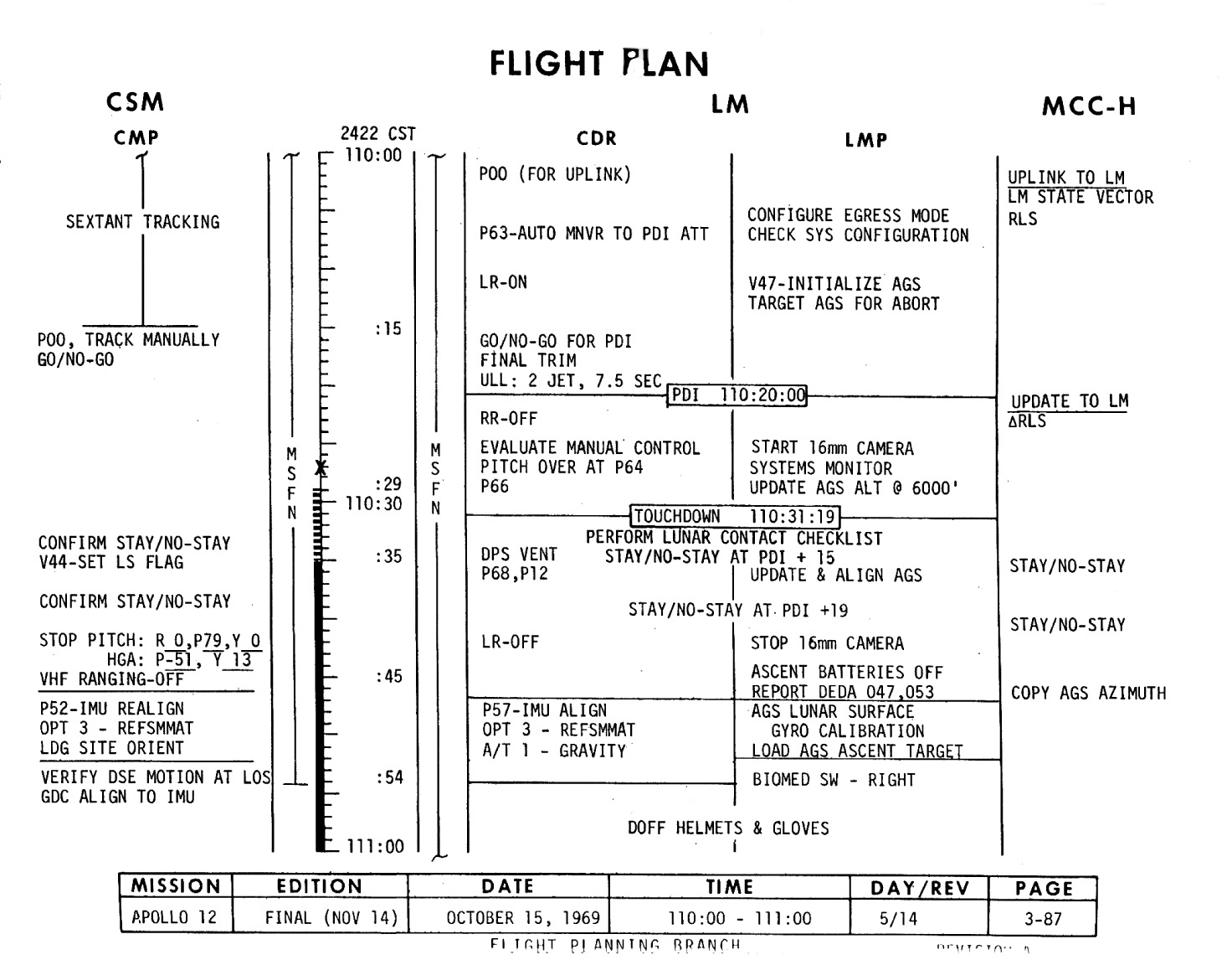 During the descent, Lunar Module Pilot Alan Bean will read out of the LM guidance computer such numbers as range to go to the landing site, horizontal velocity, and the angle at which commander Pete Conrad, should look to spot the landing site through the Landing Point Designator etched on the left-hand window of the Lunar Module. During the final phase from 500 feet down following low gate at 500 feet, Bean will add in the so called H-dot or vertical velocity rate of descent.
