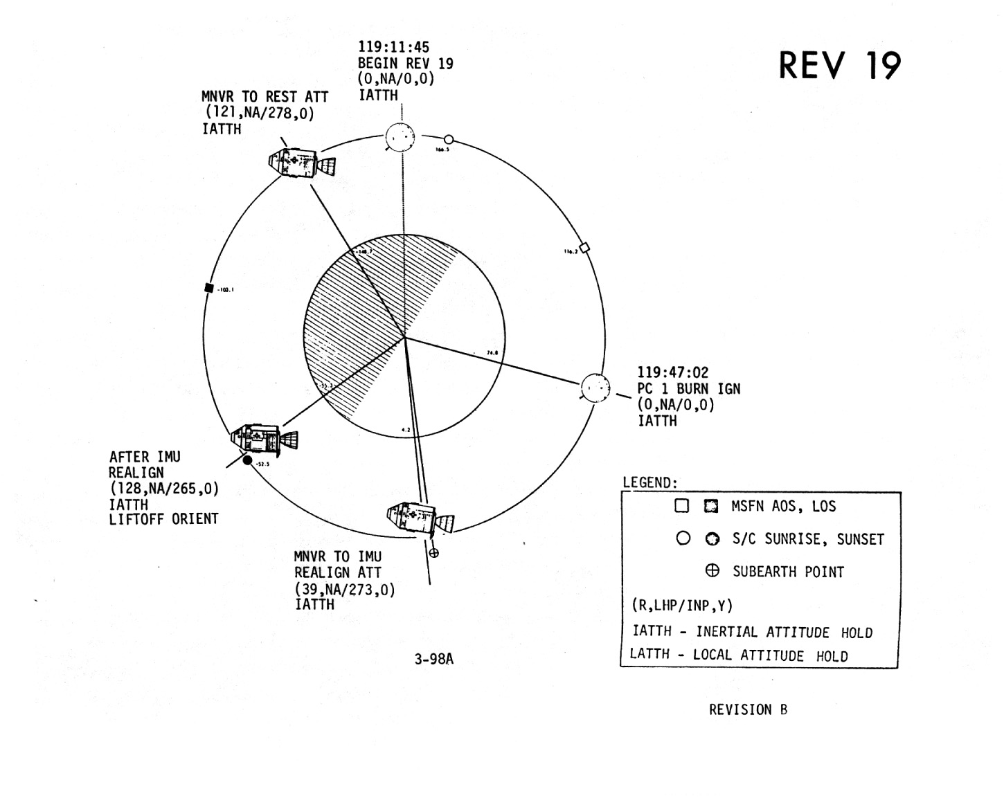 120:01:50 Gibson: Dick, the burn looked real good on PGNCS. We'll be tracking you going across here, and it all looks good for the lift-off. Have a map update for you, Rev 20, when you are ready to copy.