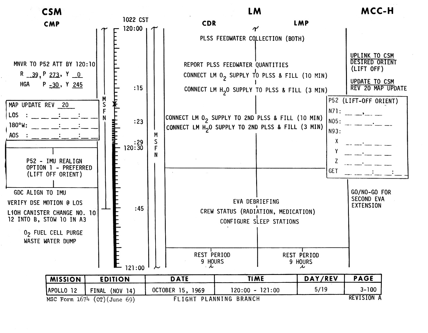 This is Apollo Control at 120 hours, 34 minutes. Yankee Clipper has 12 minutes acquisition time left in this 19th lunar revolution. The crewmen of Intrepid are recharging the portable life support systems, refilling with oxygen and getting the LM reconfigured. After they complete that, we will have a short debriefing session between the ground and the Intrepid on this first EVA. Mission Control Center flight controller teams will change shifts right after that briefing. We are estimating the Change Of Shift news conference for 11:30 a.m. Central Standard Time.