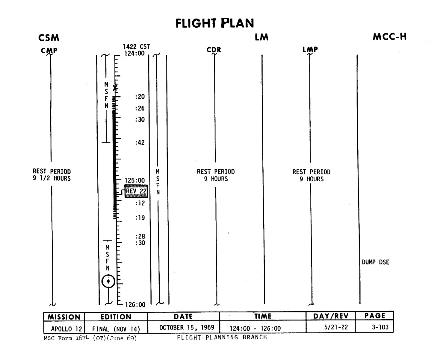 This is Apollo Control at 124 hours, 1 minute. It has been about 1 and 1/2 hours since we said goodnight to the crew of Intrepid, Commander Pete Conrad and Lunar Module Pilot, Al Bean, and it has been about 2 hours since we last heard from Dick Gordon aboard Yankee Clipper. At Mission Control we have monitoring systems on both spacecrafts. Everything continues to look normal. Flight Director Glynn Lunney has been reviewing the status of the Extra Vehicular Mobility unit for the upcoming second EVA. We'll continue to leave the air-to-ground circuits up live should we have any conversation from the spacecraft. The scheduled wakeup time is 129 hours, 55 minutes. Pete Conrad advised before beginning the rest period that if he and Al Bean were to awake earlier than the scheduled wakeup time, they would expect to get up and get going working toward their EVA. At 124 hours, 2 minutes, this is Apollo Control, Houston.