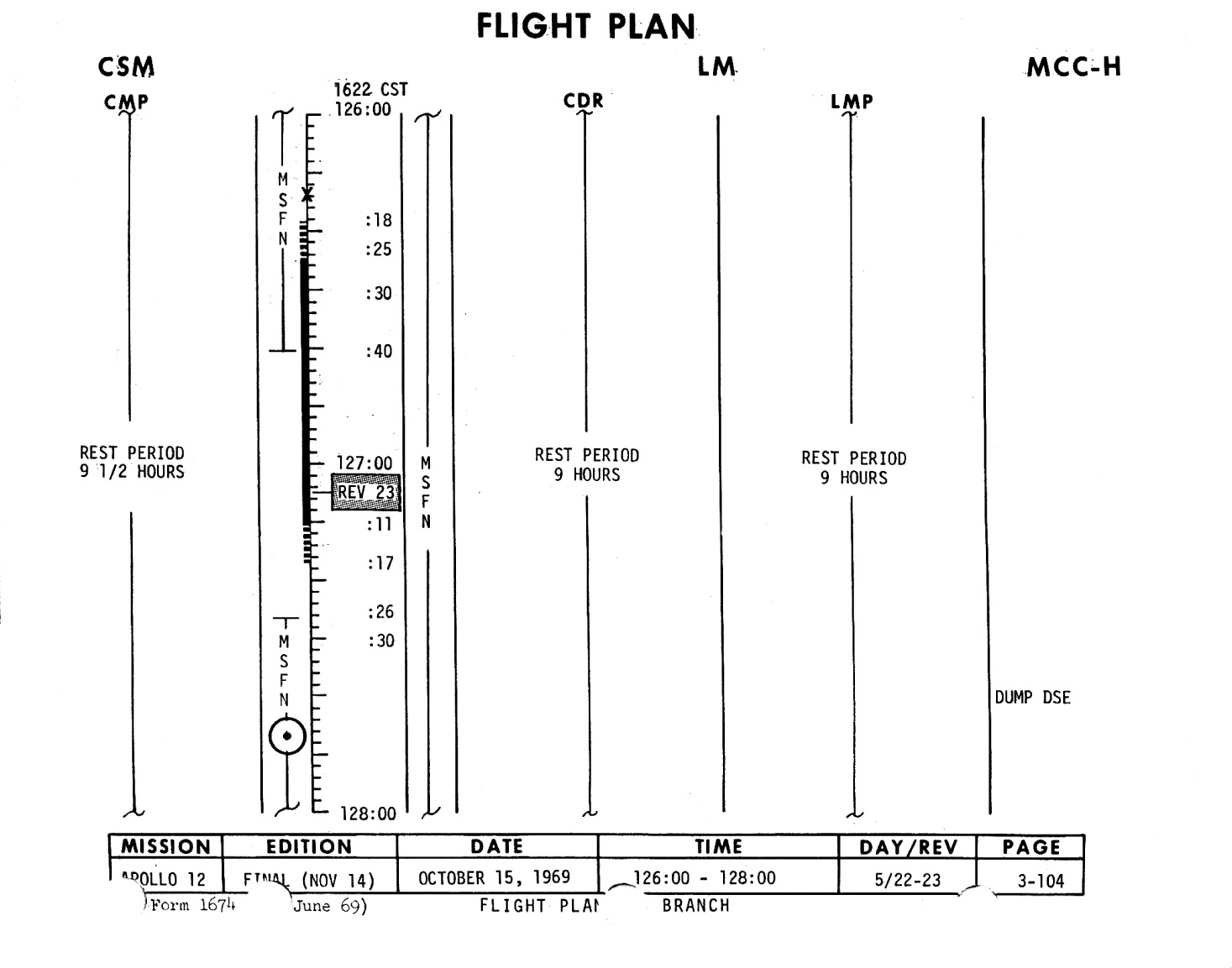 This is Apollo Control at 128 hours, 6 minutes. We are now somewhat less than 2 hours away from the scheduled end of this sleep period. The Command Module, Yankee Clipper, will shortly be passing over landing site 7 and Intrepid, we have about 34 minutes of acquisition left with the Command Module on the path. Yankee Clipper now in its 23rd revolution of the moon. We've had no conversations with any of the crewmen on either spacecraft since they began their sleep period. Dick Gordon, we last heard from, at about 122 hours and we heard last from Pete Conrad aboard the Intrepid at about 122 hours, 37 minutes. On a couple of occasions during the sleep period, the LM environmental systems engineers reported telemetry indications that Al Bean was making minor adjustments to his suit circuit, probably for temperature control, in one case raising the temperature and in the other reducing it slightly. Other than this there has been no activity from the spacecraft and no communications. And biomedical data on Pete Conrad indicates that he is sleeping soundly. We also have minor update to the coordinates for the Intrepid landing site based on Pete Conrad's description where he thought the spacecraft had touched down. The new coordinates that we have for the LM are 3.036 degrees south and that figure shows no change from the previous one and 23.416 degrees west, which is a change from the previous 23.418. The new figure again 23.416 degree west. Using the same coordinates - system for the Surveyor spacecraft, we have it at 3.04 degrees south and 23.411 degrees west. At 128 hours, 9 minutes into the flight of Apollo 12, this is Mission Control, Houston.