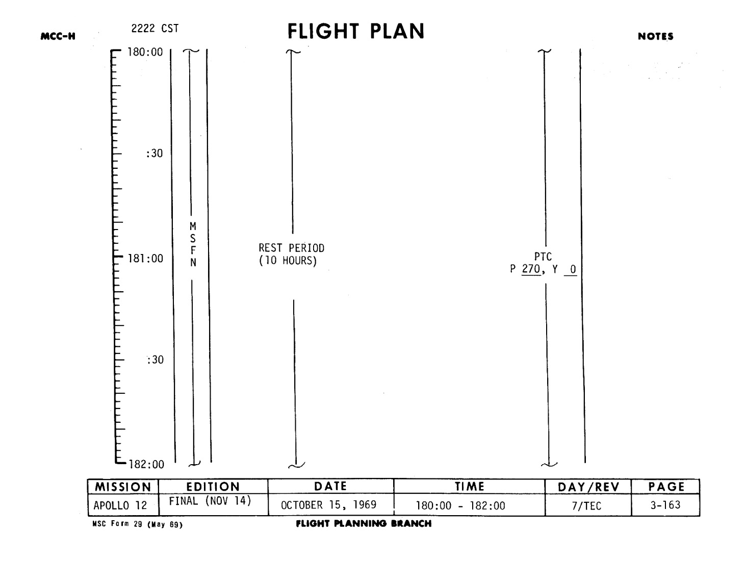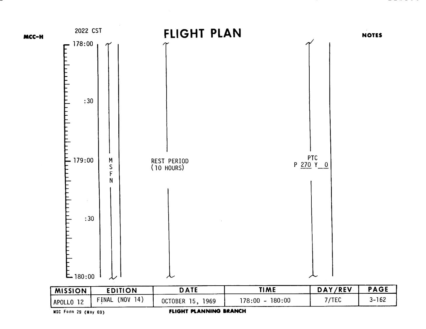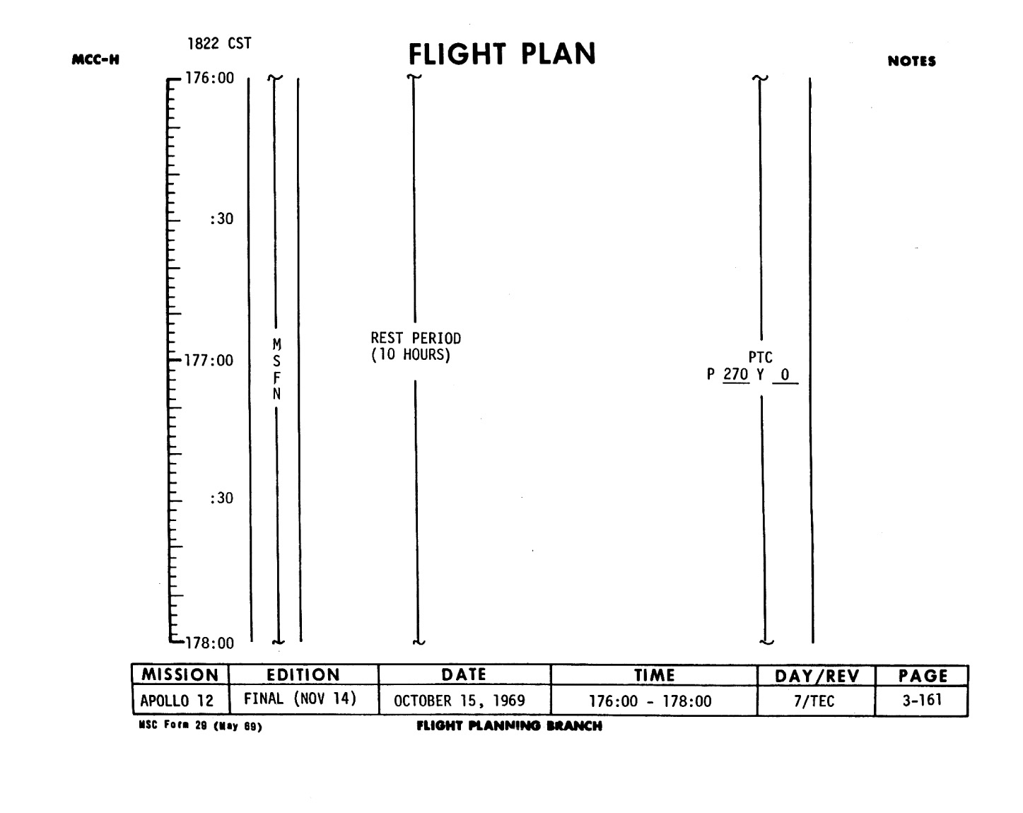 This is Apollo Control at 179 hours, 22 minutes Ground Elapsed Time. Some 64 hours, 59 minutes until entry. Apollo 12 crew still asleep at this time. Now some 17,405 nautical miles out from the Moon, traveling at a velocity of 4,003 feet per second relative to the Moon. The spacecraft weight, 25,175 pounds. Crew is, according to this Flight Plan, scheduled to be awakened at 2:30 in the morning, Central Time. However, it's planned to let them sleep as long as they want to and they in turn would make the first call back to Mission Control. At 179 hours, 23 minutes Ground Elapsed Time, this is Apollo Control.