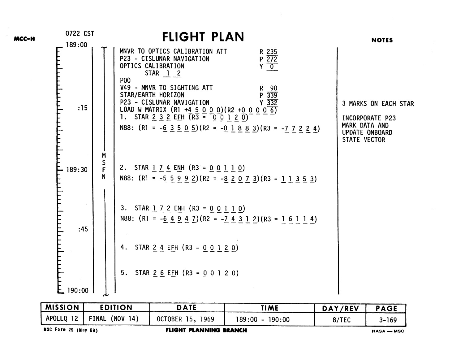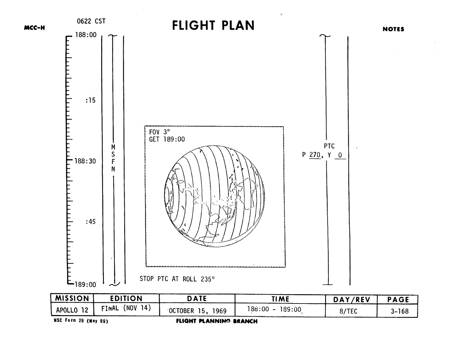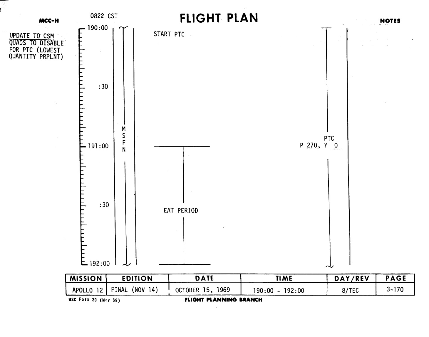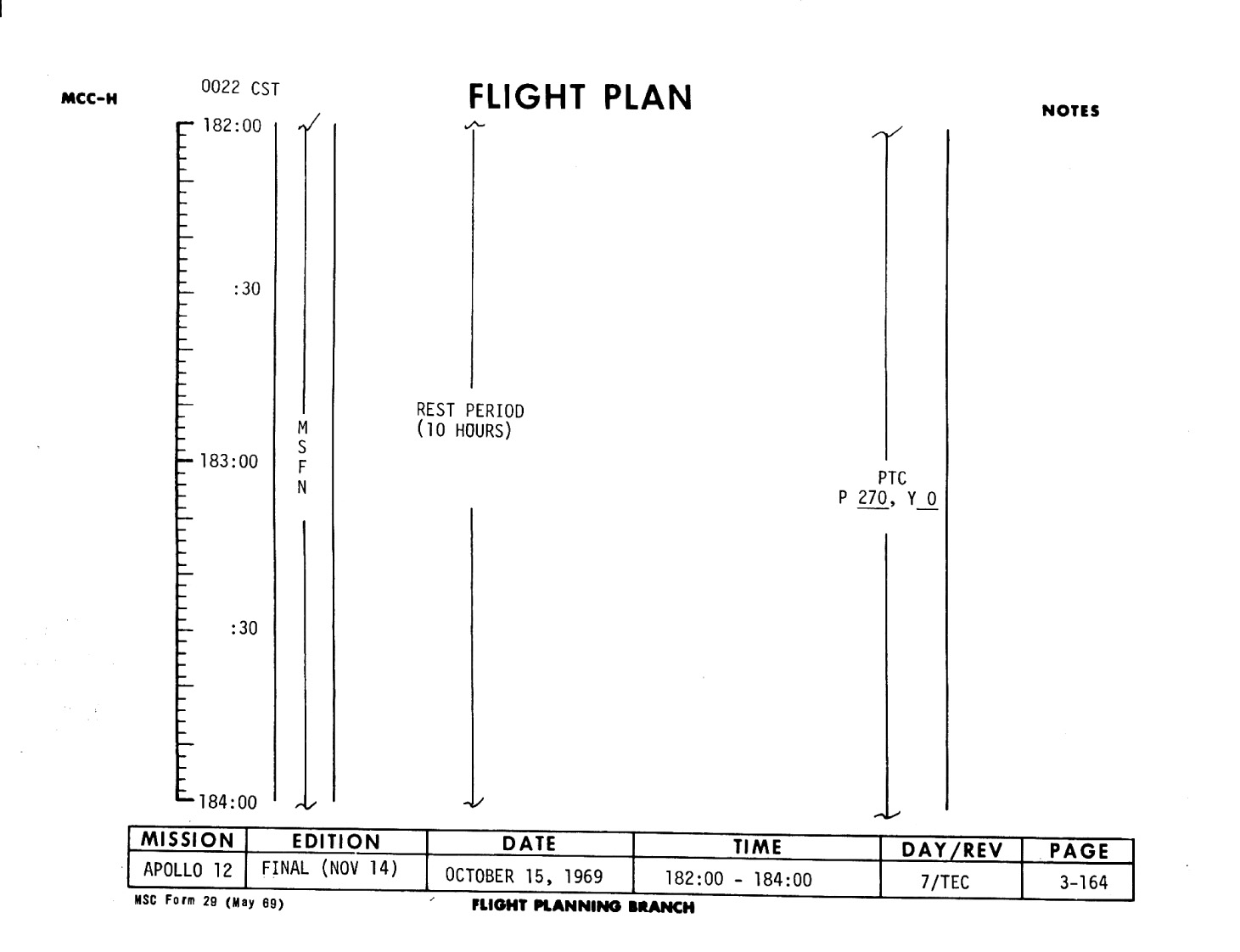 This is Apollo Control at 179 hours, 22 minutes Ground Elapsed Time. Some 64 hours, 59 minutes until entry. Apollo 12 crew still asleep at this time. Now some 17,405 nautical miles out from the Moon, traveling at a velocity of 4,003 feet per second relative to the Moon. The spacecraft weight, 25,175 pounds. Crew is, according to this Flight Plan, scheduled to be awakened at 2:30 in the morning, Central Time. However, it's planned to let them sleep as long as they want to and they in turn would make the first call back to Mission Control. At 179 hours, 23 minutes Ground Elapsed Time, this is Apollo Control.