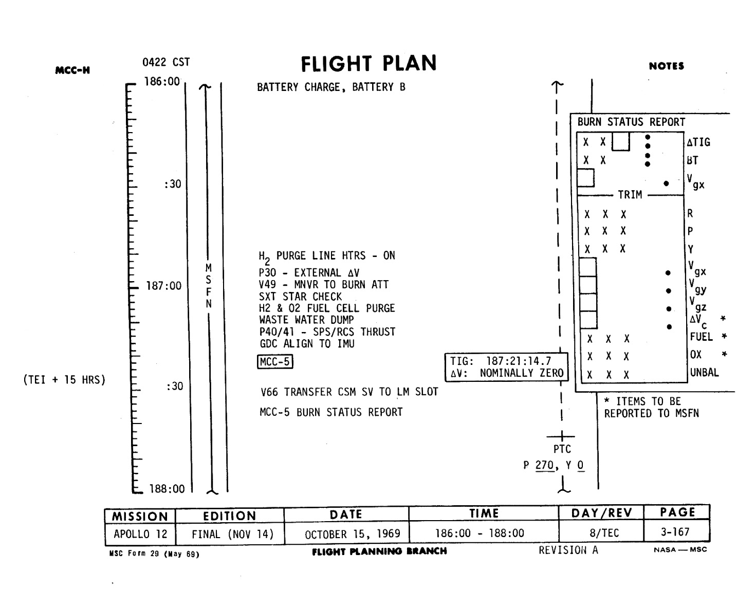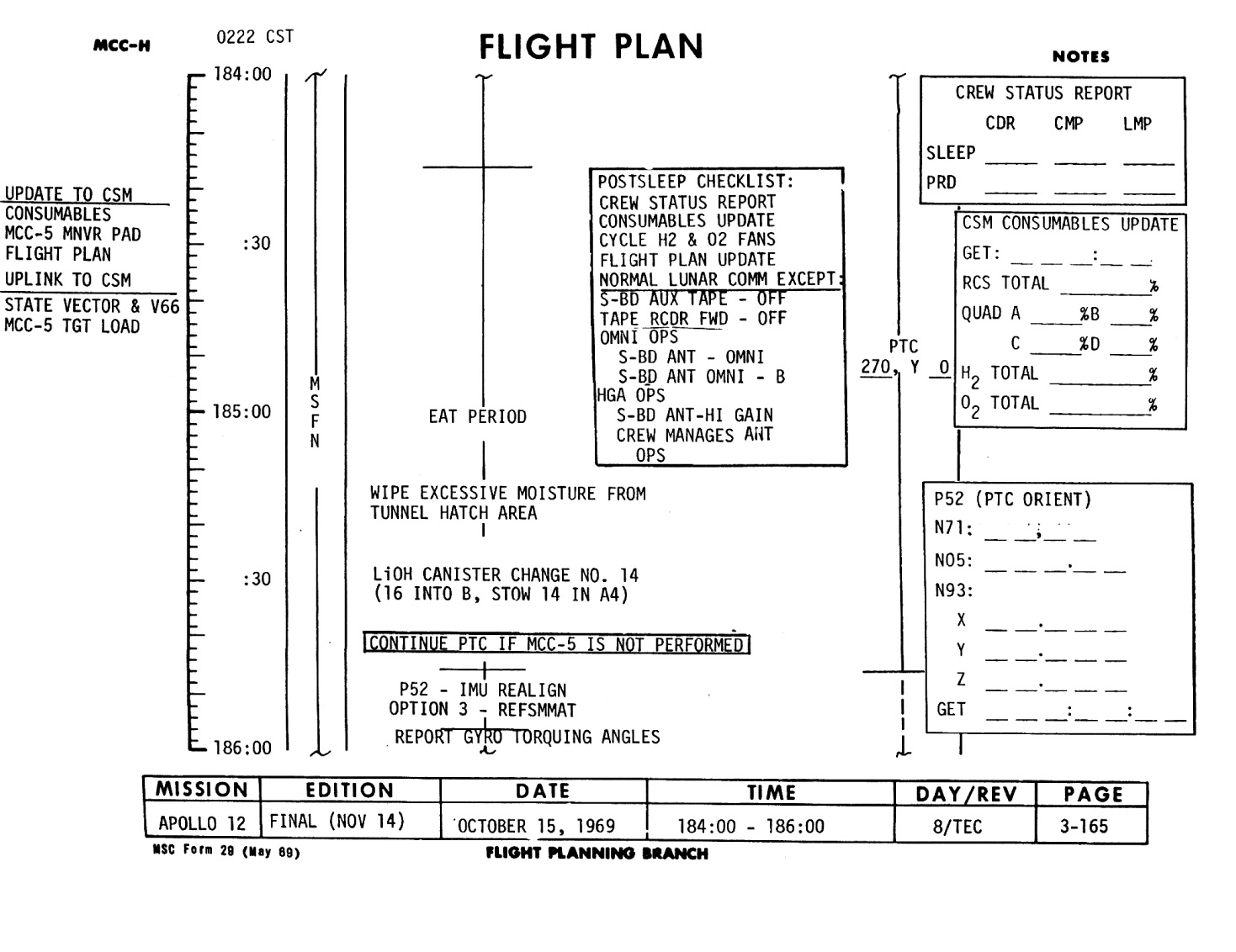 187:43:16 Conrad: Okay. What - Why not don't - why don't we go ahead and burn it on time? I tell you what, the only thing we have to do is change the canister, and we all had 12 hours' sleep last night, I think. I lost track of time there. And the PRD's are 11026, 11025, and 04027; and we'll go ahead and do a quick P52 here for you in a PTC orientation. And then give you the computer, okay? And you can uplink loads. That what you want to do?