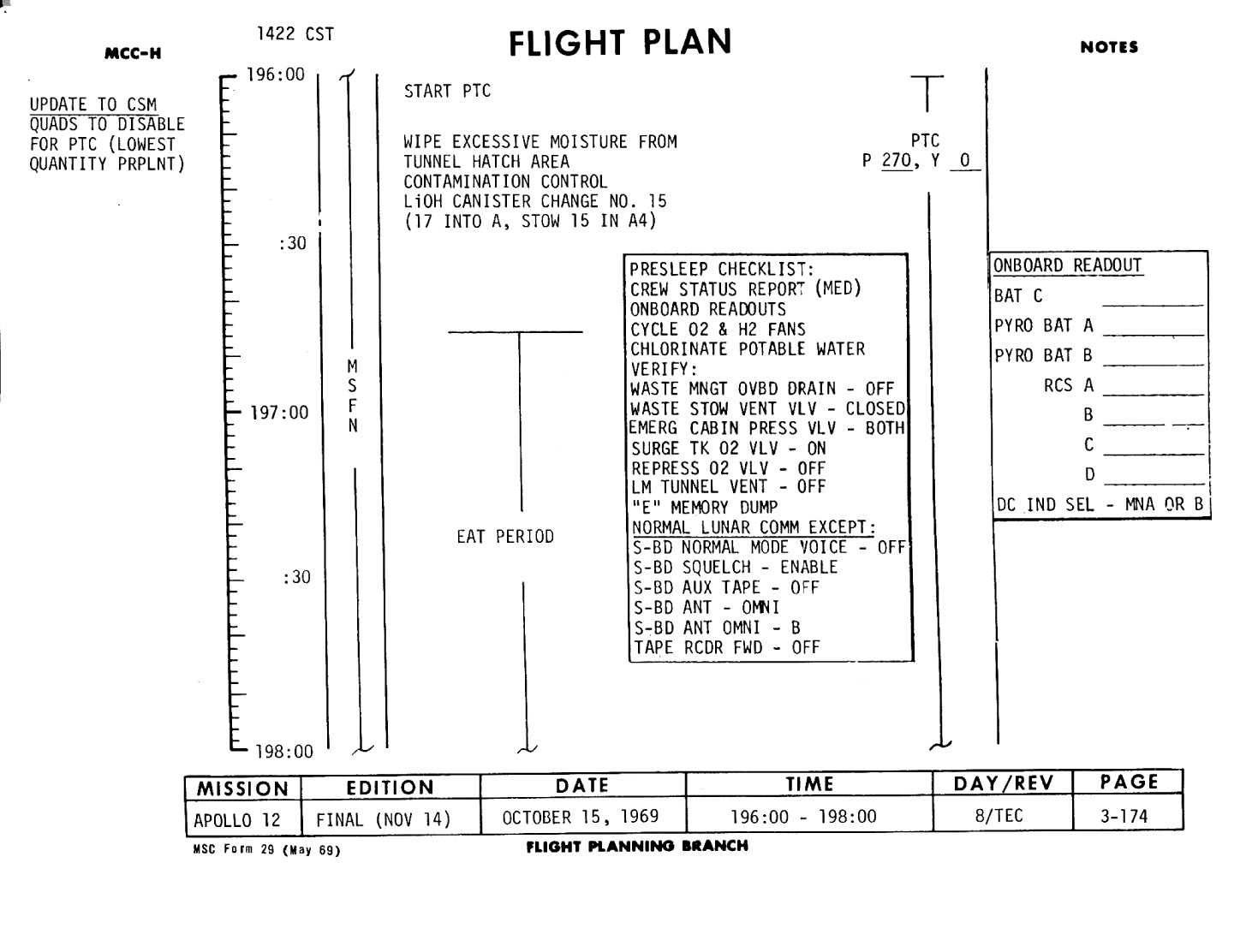 197:38:17 Conrad: Very good. Let me give you the presleep checklist and crew status report is as follows: CDR had one decongestant, CMP had one, and Al had a sleeping pill last night. That's about that -We've cycled the fans, chlorinated the water. The valves are all at the proper positions. You have got the E-memory dump and the Bat C is 37.0; Pyro Bat A, 37.0; Pyro Bat B is 37.0; and we are on Main A on the dc indicator. And that is about it.