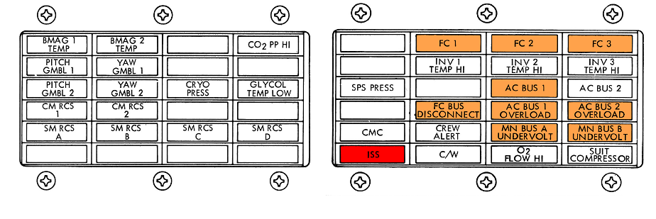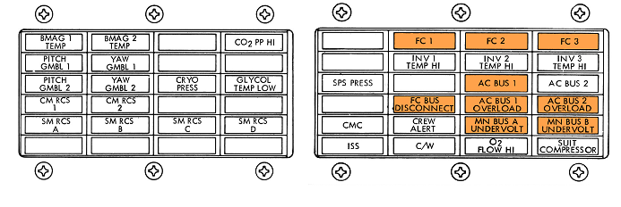 Computer warning lights observed by the crew. Coloring added. Original scan via heroicrelics.org.