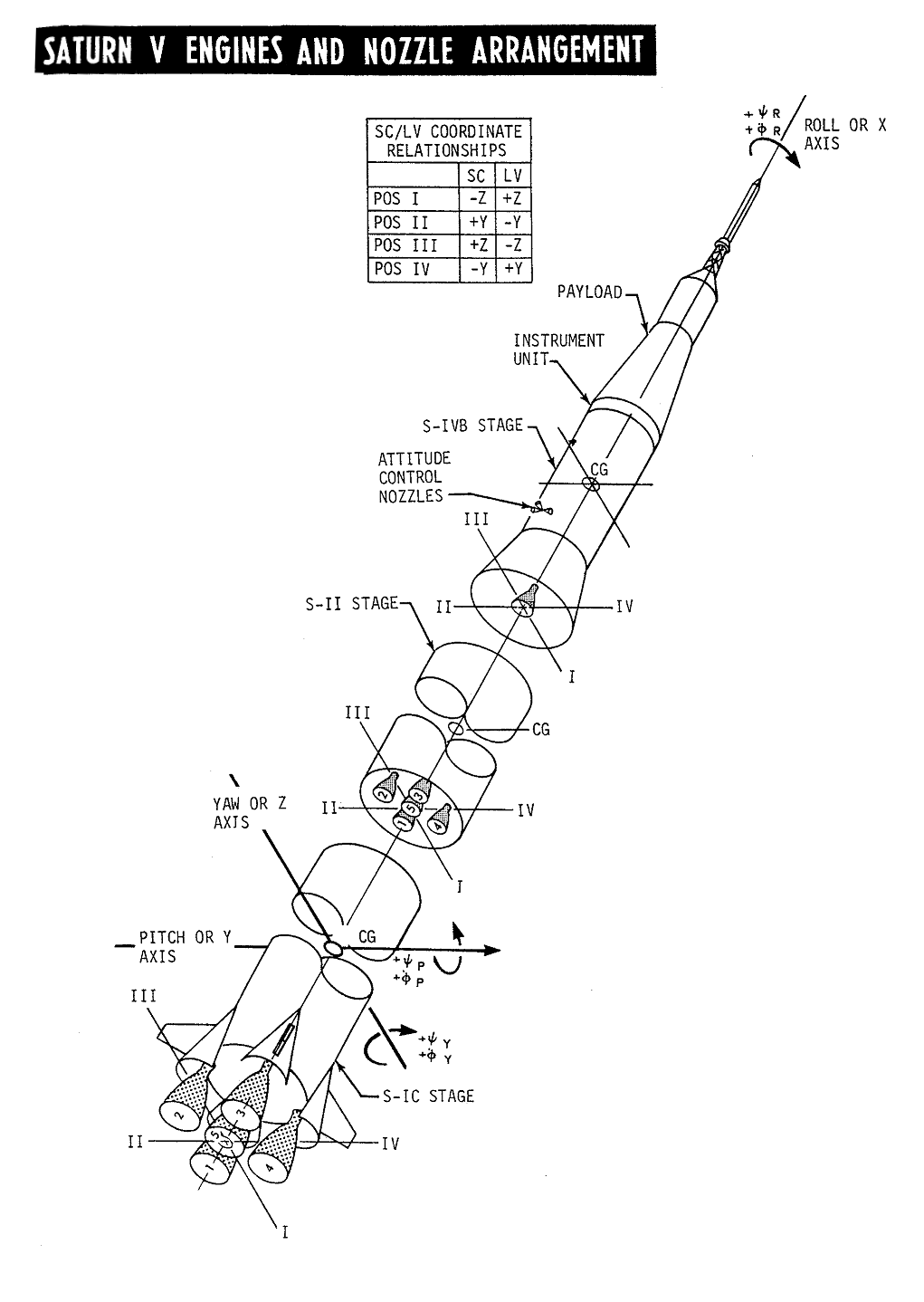 Saturn V stages and vehicle axes. Adaptation from the S-507 Flight Manual for Apollo 12.