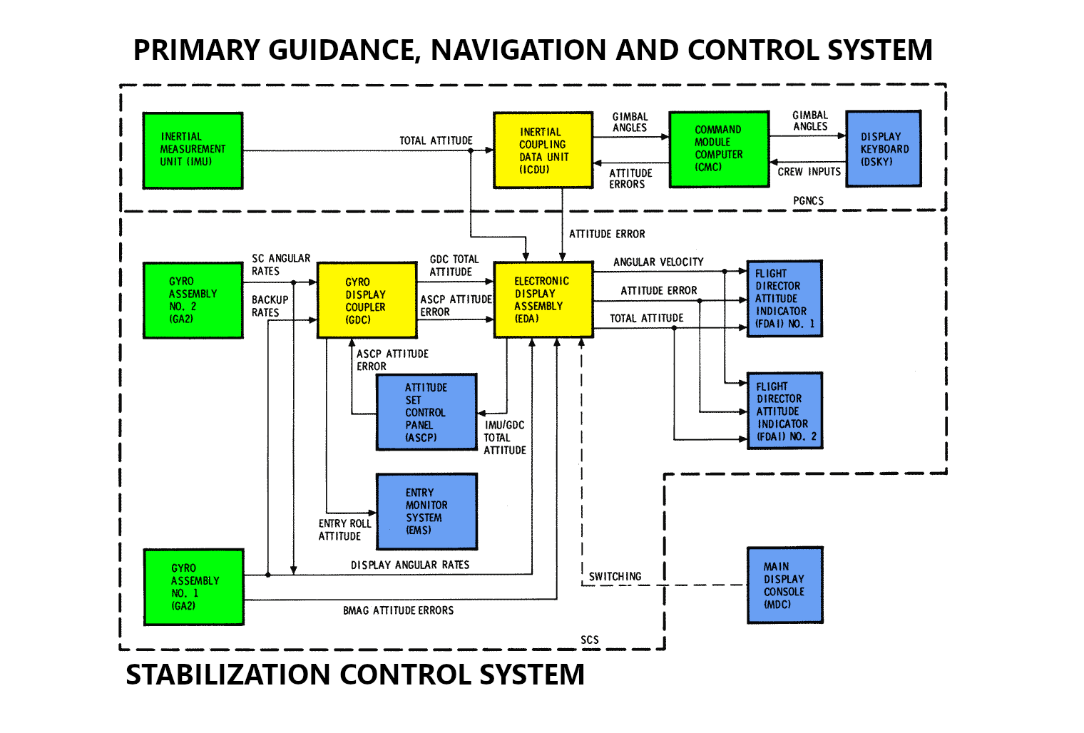 Two interlaced, yet redundant systems onboard the Apollo spacecraft produced attitude and acceleration data while in powered and free flight. The Primary Guidance, Navigation and Control System - PGNCS, universally known as 'pings', consisted of the Inertial Measurement Unit, which delivered its information to the Command Module Computer which then fed it to the FDAI display. The secondary system was known as the Stabilization Control System, and provided independent means for both sensing and controlling spacecraft attitude and acceleration. Two gyroscopic units known as BMAGs - Body Mounted Attitude Gyros were installed in a so-called strapped-on configuration where they sensed such changes directly from the structure of the spacecraft. The GDC - Gyro Display Coupler - mentioned by Richard Gordon was an electronics package that derived the attitude information from the BMAGs and then translated it in a usable form to the FDAI. Importantly, this meant that although their primary system appeared to be out of action, the backup system was still operating accurately and monitored the ascent conditions.