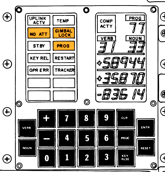 During the launch, several cardboard cue cards containing quick instructions were attached to the main console with pieces of Velcro. One thing done by Pete Conrad at this point was the remove a cue card that covered the indicator lights on the DSKY user interface to the onboard computer that was set on the Main Display Console just about at the center between the Commander's and the Command Module Pilot's panels, for easy access by both of them. Underneath, Conrad found out that several warning lights had come up on the little bank of indicator lights that alerted them to trouble in the computer or the guidance system. NO ATT light told him that the computer did not know their present attitude. GIMBAL LOCK indicated that the computer had sensed an unacceptable status of the inertial platform. PROG (short for PROGRAM) ALARM warned of a disruption of the computer's processes.
