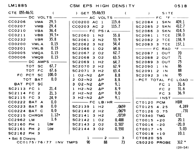 EPS High Density, one of the two EECOM displays immediately available at the Mission Control station. The values displayed do not reflect those seen at the moment but are for illustration only.