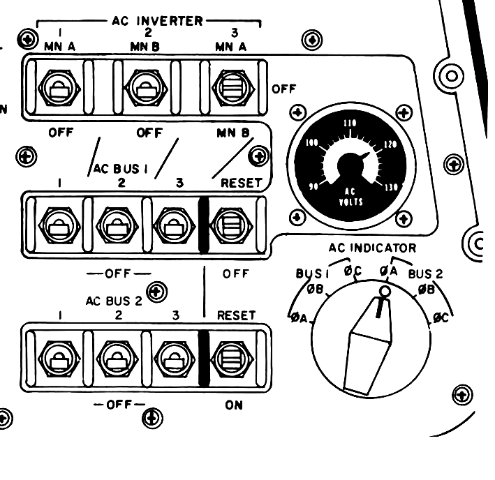 Alternating current indicators on Panel 3. Switches on the left were used to select the AC inverter used, while the gauge on the right allowed them to check the voltage in the 118-volt alternating current power supply.