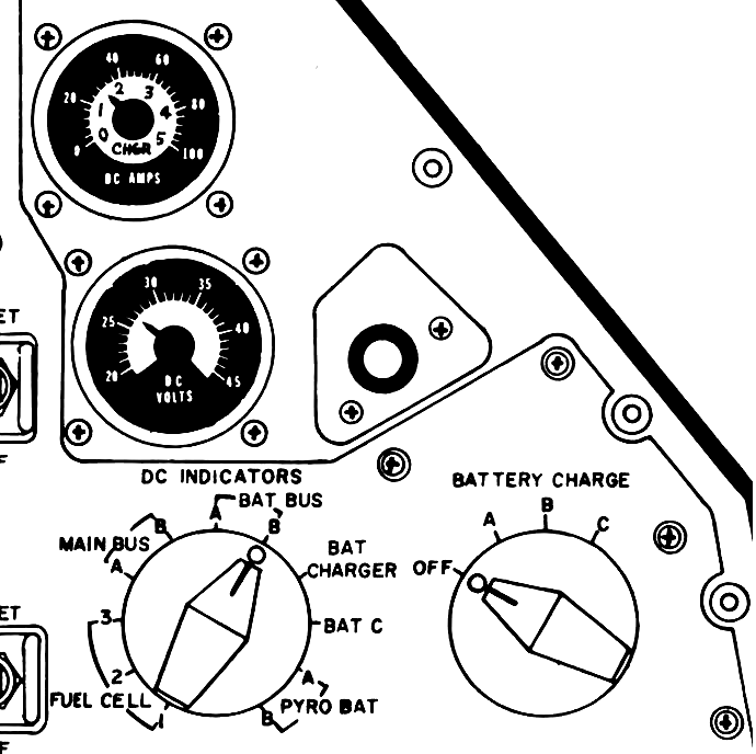 Direct current indicators and selector switches on Panel 3. Alan Bean used these to confirm that the spacecraft still had power.